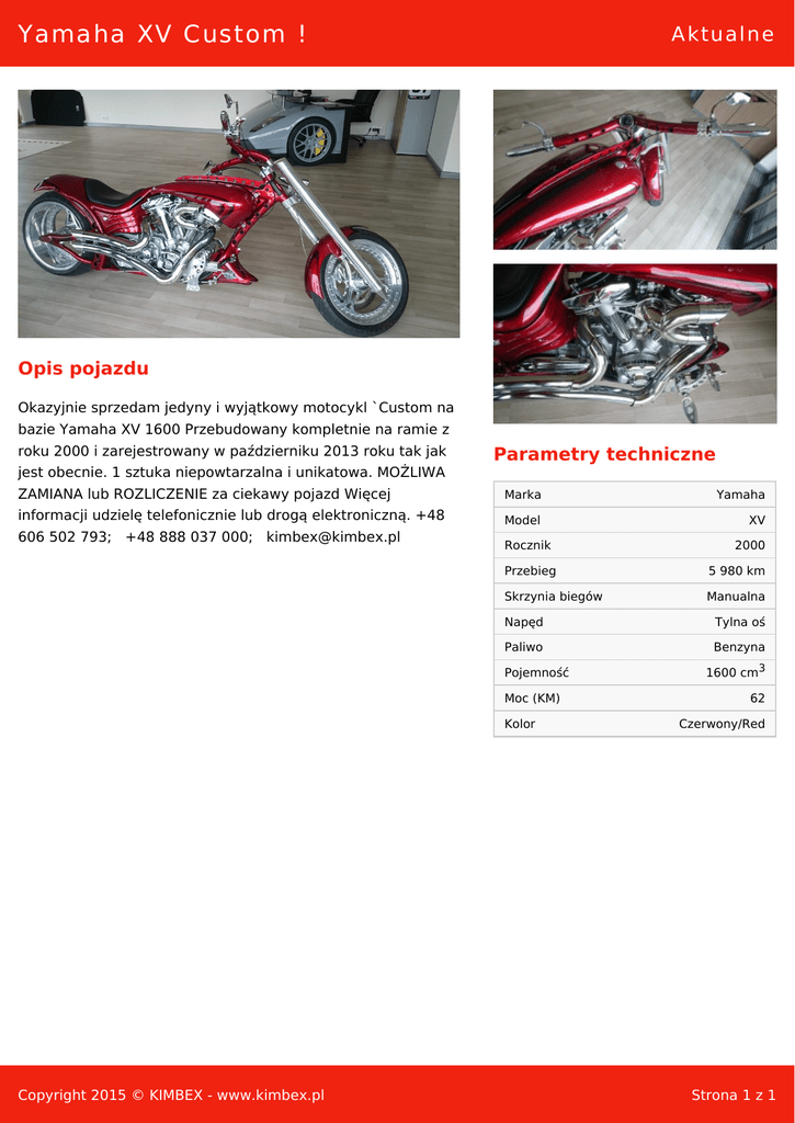 Yamaha XV Custom ! Aktualne Opis pojazdu Okazyjnie sprzedam jedyny i wyjątkowy motocykl `Custom na bazie Yamaha XV 1600 Przebudowany kompletnie na ramie z roku 2000 i zarejestrowany w październiku 2013 roku tak jak jest obecnie. 1 sztuka niepowtarzalna i unikatowa. MOŻLIWA Parametry techniczne ZAMIANA lub ROZLICZENIE za ciekawy pojazd Więcej Marka Yamaha informacji udzielę telefonicznie lub drogą elektroniczną. +48 Model XV 606 502 793; +48 888 037 000; [email protected] Rocznik Przebieg 5 980 km Skrzynia biegów Manualna Napęd Tylna oś Paliwo Benzyna Pojemność Moc (KM) Kolor Copyright 2015 © KIMBEX - www.kimbex.pl 2000 1600 cm3 62 Czerwony/Red Strona 1 z 1