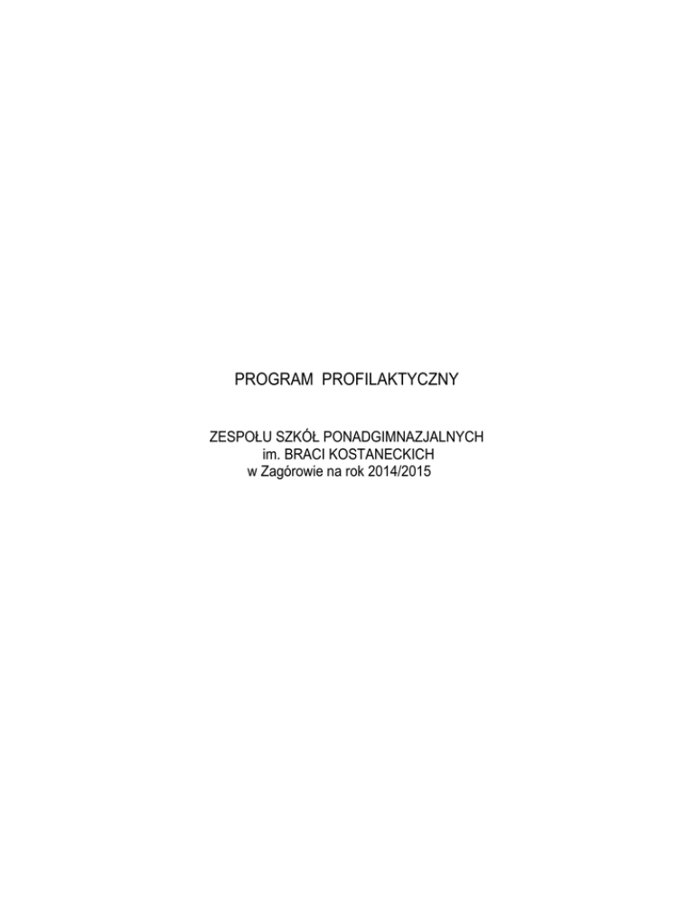 PROGRAM PROFILAKTYCZNY ZESPOŁU SZKÓŁ PONADGIMNAZJALNYCH im. BRACI KOSTANECKICH w Zagórowie na rok 2014/2015 PROGRAM PROFILAKTYCZNY ZSP im. Braci Kostaneckich w Zagórowie na rok szkolny 2014/2015 I. WYCHOWANIE I PROFILAKTYKA W SZKOLE Podstawa prawna Ustawa o wychowaniu w trzeźwości i przeciwdziałaniu alkoholizmowi z dnia 26 października 1982r. Ustawa o ochronie zdrowia psychicznego z dnia 19 sierpnia 1994r. Ustawa o ochronie zdrowia przed następstwami używania tytoniu i wyrobów tytoniowych z dnia 9 listopada 1995r. Ustawa o przeciwdziałaniu narkomanii z dnia 24 kwietnia 1997r. Rozporządzenie MENiS z dnia 31 stycznia 2002r. zmieniające rozporządzenie w sprawie ramowych statutów publicznych przedszkola oraz publicznych szkół ( Dz. U. Nr 10 poz.96). Rozporządzenie MENiS z dnia 26 lutego 2002r. w sprawie podstawy programowej wychowania przedszkolnego oraz kształcenia ogólnego w poszczególnych typach szkół (Dz. U. NR 51 poz. 458). Wprowadzenie Program szkolnej profilaktyki to ogół działań chroniących dzieci i młodzież przed zakłóceniami w rozwoju oraz działań interwencyjnych podejmowanych w sytuacji pojawiających się zagrożeń. Głównym celem profilaktyki jest ochrona przed zagrożeniami, zatem działania profilaktyczne powinny być nakierowane na osłabienie czynników ryzyka, sprzyjających podejmowaniu zachowań ryzykownych oraz na wzmocnieniu czynników chroniących, zwiększających odporność człowieka na działanie czynników ryzyka. Szkolny Program Profilaktyki zakłada działania, które mają doprowadzić przede wszystkim do wzmocnienia czynników chroniących, przy jednoczesnym osłabieniu czynników ryzyka. Przyjmujemy model profilaktyki integralnej, realizowanej w każdym obszarze pracy pedagogicznej. II. DIAGNOZA ZAGROŻEŃ Tworzenie Szkolnego Programu Profilaktyki wymaga określenia obszarów problemowych i dostosowania do nich konkretnych, zaplanowanych działań. Diagnoza problemów wychowawczych została przeprowadzona poprzez: 1. 2. 3. Relacje wychowawców klas na temat problemów wychowawczych w danej klasie. Przeprowadzenie ankiet wśród uczniów, rodziców i pracowników szkoły. Rozmowy z rodzicami, zarówno indywidualne jak i zbiorowe. 4. Analizę dokumentacji szkolnej oraz obserwacje zachowań uczniów w sytuacjach szkolnych. 5. Analizę sytuacji rodzinnej i środowiskowej uczniów. 6. Wnioski z prac Rady Pedagogicznej . Podstawowym celem badań było zebranie wiarygodnych informacji dotyczących występowania i rozmiarów takich zjawisk jak: używanie substancji psychoaktywnych (tytoń, alkohol, narkotyki), agresja wśród młodzieży, trudności szkolne, brak troski o własne zdrowie. Jednocześnie zwrócono uwagę na rozpoznanie czynników chroniących tj. więzi rodzinne, zainteresowania uczniów, aktywne spędzanie wolnego czasu, pozytywny wpływ grupy rówieśniczej. Istotnym elementem diagnozy było rozpoznanie oczekiwań rodziców wobec konstruowanego programu profilaktyki oraz ich nastawienia i chęci zaangażowania się w realizowanie tego programu. Z diagnozy sytuacji w szkole wynika, podobnie jak w roku poprzednim, że najczęstszymi zachowaniami ryzykownymi podejmowanymi przez uczniów są: 1. 2. 3. 4. Palenie papierosów. Spożywanie alkoholu. Wagary Zachowania agresywne przede wszystkim: przezywanie, wyśmiewanie, plotkowanie, grożenie, szantażowanie, obrażanie. 5. Brak zainteresowania nauką 6. Kontakt z narkotykami. Przedstawiona powyżej ocena stanu wyjściowego w zakresie zagrożeń i problemów wychowawczych pozwoliła na sformułowanie głównych celów Szkolnego Programu Profilaktyki, a następnie wyznaczenie zadań i sposobów ich realizacji, służących osiągnięciu założonych celów. Program został opracowany w korelacji z: Wewnątrzszkolnym Systemem Oceniania, Programem Wychowawczym Szkolnym zestawem programów nauczania Planem Pracy Szkoły na 2014//2015 Planami pracy kół : PTTK, Biologicznym i PCK III. CEL I ZADANIA SZKOLNEGO PROGRAMU PROFILAKTYKI Dane uzyskane w wyniku przeprowadzonej diagnozy wskazują na wzmożony kontakt młodzieży z substancjami psychoaktywnymi. Duża grupa uczniów ma za sobą inicjację alkoholową, a część z nich jest już uzależniona od palenia papierosów. W związku z powyższym zdecydowano, że w ramach Szkolnego Programu Profilaktyki będą realizowane działania mające na celu zapobieganie zjawisku rozprzestrzeniania się kontaktu młodzieży z substancjami psychoaktywnymi poprzez wskazywanie alternatywnych sposobów aktywności i ćwiczenie umiejętności asertywnego zachowania się wobec presji grupy rówieśniczej. Jako główny cel profilaktyki w naszej szkole uznaliśmy: zapobieganie ryzyku wystąpienia uzależnień od środków psychoaktywnych wśród młodzieży oraz podniesienie własnej samooceny. Aby osiągnąć powyższy cel ustalono zadania, które powinny być realizowane w ramach profilaktyki w szkole: 1. Informowanie o mechanizmach i następstwach wczesnego picia alkoholu, zażywania narkotyków i palenia papierosów. 2. Uczenie asertywności w kontaktach z drugim człowiekiem 3. Radzenie sobie ze stresem. 4. Promowanie zdrowego stylu życia i umiejętnego wykorzystania czasu wolnego. 5. Zwrócenie uwagi na aspekty prawne i moralne uzależnień Oczekiwania, osiągnięcia : - uświadomienie uczniom , że alkoholizm i nikotynizm to choroby , którym bezwzględnie należy się przeciwstawiać - zminimalizowanie zachowań agresywnych i chuligańskich wśród uczniów - podniesienie poziomu higieny wśród młodzieży - podniesienie świadomości uczniów z zakresu zagrożeń współczesnej cywilizacji - zwiększenie poczucia bezpieczeństwa w szkole - zwrócenie uwagi że zdrowy styl życia może być jedynym skutecznym lekarstwem na choroby cywilizacyjne UCHWAŁA NR …/2014 RADY PEDAGOGICZNEJ ZESPOŁU SZKÓŁ PONADGIMNAZJALNYCH W Zagórowie Z DNIA 30 SIERPNIA 2014 W SPRAWIE PROGRAMU PROFILAKTYKI DLA ZSP NA ROK SZKOLNY 2013/2014 Na podstawie