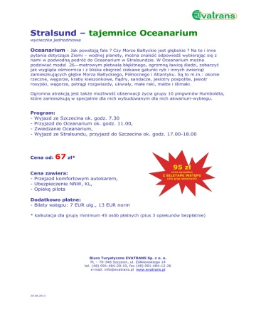 Stralsund – tajemnice Oceanarium wycieczka jednodniowa Oceanarium - Jak powstają fale ? Czy Morze Bałtyckie jest głębokie ? Na te i inne pytania dotyczące Ziemi – wodnej planety, moŜna znaleźć odpowiedź wybierając się z nami w podwodną podróŜ do Oceanarium w Stralsundzie. W Oceanarium moŜna podziwiać model 26—metrowym płetwala błękitnego, ogromną ławicę śledzi, zobaczyć jak wygląda ośmiornica i z bliska obejrzeć ciekawe gatunki ryb i innych zwierząt zamieszkujących głębie Morza Bałtyckiego, Północnego i Atlantyku. Są to m.in.: okonie rzeczne, węgorze, kraby kieszonkowe, flądry, sandacze, jesiotry pospolite, jesiotr rosyjski, węgorze, pstrągi rozgwiazdy, ukwiały, małe raki, małŜe i ślimaki. Ogromna atrakcją jest takŜe moŜliwość obserwacji Ŝycia grupy 10 pingwinów Humboldta, które zamieszkują w specjalnie dla nich wybudowanym dla nich akwarium-wybiegu. Program: - Wyjazd ze Szczecina ok. godz. 7.30 - Przyjazd do Oceanarium ok. godz. 11.00, - Zwiedzanie Oceanarium, - Wyjazd ze Stralsundu, przyjazd do Szczecina ok. godz. 17.00-18.00 Cena od: 67 zł* 95 zł Cena zawiera: - Przejazd komfortowym autokarem, - Ubezpieczenie NNW, KL, - Opiekę pilota cena specjalna Z BILETAMI WSTĘPU (dla grup szkolnych) Dodatkowo płatne: - Bilety wstępu: 7 EUR ulg., 13 EUR norm * kalkulacja dla grupy minimum 45 osób płatnych (plus 3 opiekunów bezpłatnie) Biuro Turystyczne EVATRANS Sp. z o. o. PL – 70-346 Szczecin, ul. śółkiewskiego 14 tel. (48) 091-484-20-10, fax (48) 091-484-12-26 e-mail: [email protected] www.evatrans.pl 20.08.2013