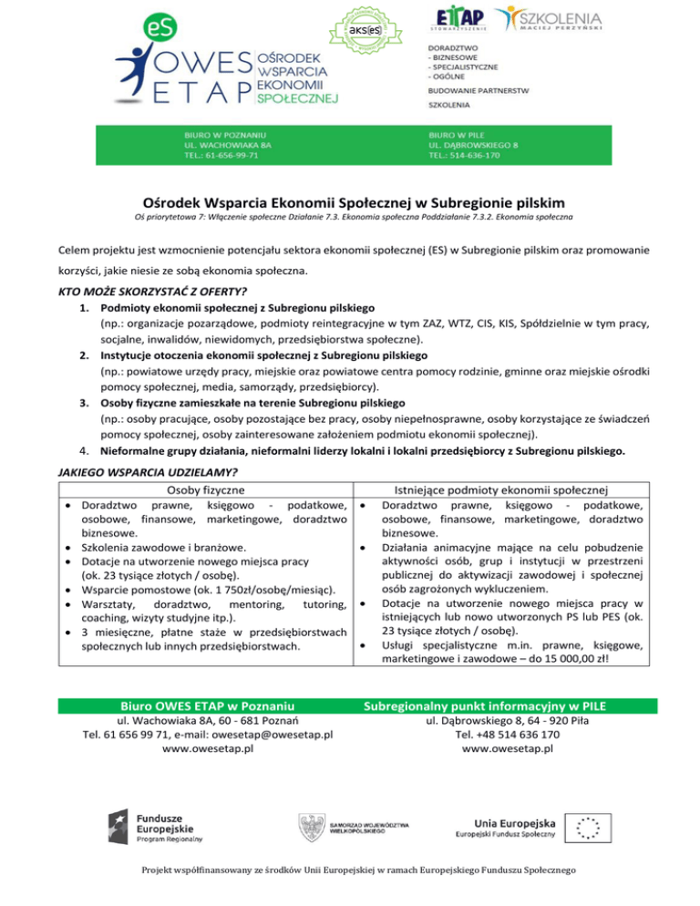 Ośrodek Wsparcia Ekonomii Społecznej w Subregionie pilskim Oś priorytetowa 7: Włączenie społeczne Działanie 7.3. Ekonomia społeczna Poddziałanie 7.3.2. Ekonomia społeczna Celem projektu jest wzmocnienie potencjału sektora ekonomii społecznej (ES) w Subregionie pilskim oraz promowanie korzyści, jakie niesie ze sobą ekonomia społeczna. KTO MOŻE SKORZYSTAĆ Z OFERTY? 1. Podmioty ekonomii społecznej z Subregionu pilskiego (np.: organizacje pozarządowe, podmioty reintegracyjne w tym ZAZ, WTZ, CIS, KIS, Spółdzielnie w tym pracy, socjalne, inwalidów, niewidomych, przedsiębiorstwa społeczne). 2. Instytucje otoczenia ekonomii społecznej z Subregionu pilskiego (np.: powiatowe urzędy pracy, miejskie oraz powiatowe centra pomocy rodzinie, gminne oraz miejskie ośrodki pomocy społecznej, media, samorządy, przedsiębiorcy). 3. Osoby fizyczne zamieszkałe na terenie Subregionu pilskiego (np.: osoby pracujące, osoby pozostające bez pracy, osoby niepełnosprawne, osoby korzystające ze świadczeń pomocy społecznej, osoby zainteresowane założeniem podmiotu ekonomii społecznej). 4. Nieformalne grupy działania, nieformalni liderzy lokalni i lokalni przedsiębiorcy z Subregionu pilskiego. JAKIEGO WSPARCIA UDZIELAMY? Osoby fizyczne Doradztwo prawne, księgowo - podatkowe, osobowe, finansowe, marketingowe, doradztwo biznesowe. Szkolenia zawodowe i branżowe. Dotacje na utworzenie nowego miejsca pracy (ok. 23 tysiące złotych / osobę). Wsparcie pomostowe (ok. 1 750zł/osobę/miesiąc). Warsztaty, doradztwo, mentoring, tutoring, coaching, wizyty studyjne itp.). 3 miesięczne, płatne staże w przedsiębiorstwach społecznych lub innych przedsiębiorstwach. Biuro OWES ETAP w Poznaniu ul. Wachowiaka 8A, 60 - 681 Poznań Tel. 61 656 99 71, e-mail: [email protected] www.owesetap.pl Istniejące podmioty ekonomii społecznej Doradztwo prawne, księgowo - podatkowe, osobowe, finansowe, marketingowe, doradztwo biznesowe. Działania animacyjne mające na celu pobudzenie aktywności osób, grup i instytucji w przestrzeni publicznej do aktywizacji zawodowej i społecznej osób zagrożonych wykluczeniem. Dotacje na utworzenie nowego miejsca pracy w istniejących lub nowo utworzonych PS lub PES (ok. 23 tysiące złotych / osobę). Usługi specjalistyczne m.in. prawne, księgowe, marketingowe i zawodowe – do 15 000,00 zł! Subregionalny punkt informacyjny w PILE ul. Dąbrowskiego 8, 64 - 920 Piła Tel. +48 514 636 170 www.owesetap.pl Projekt współfinansowany ze środków Unii Europejskiej w ramach Europejskiego Funduszu Społecznego
