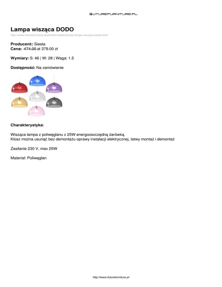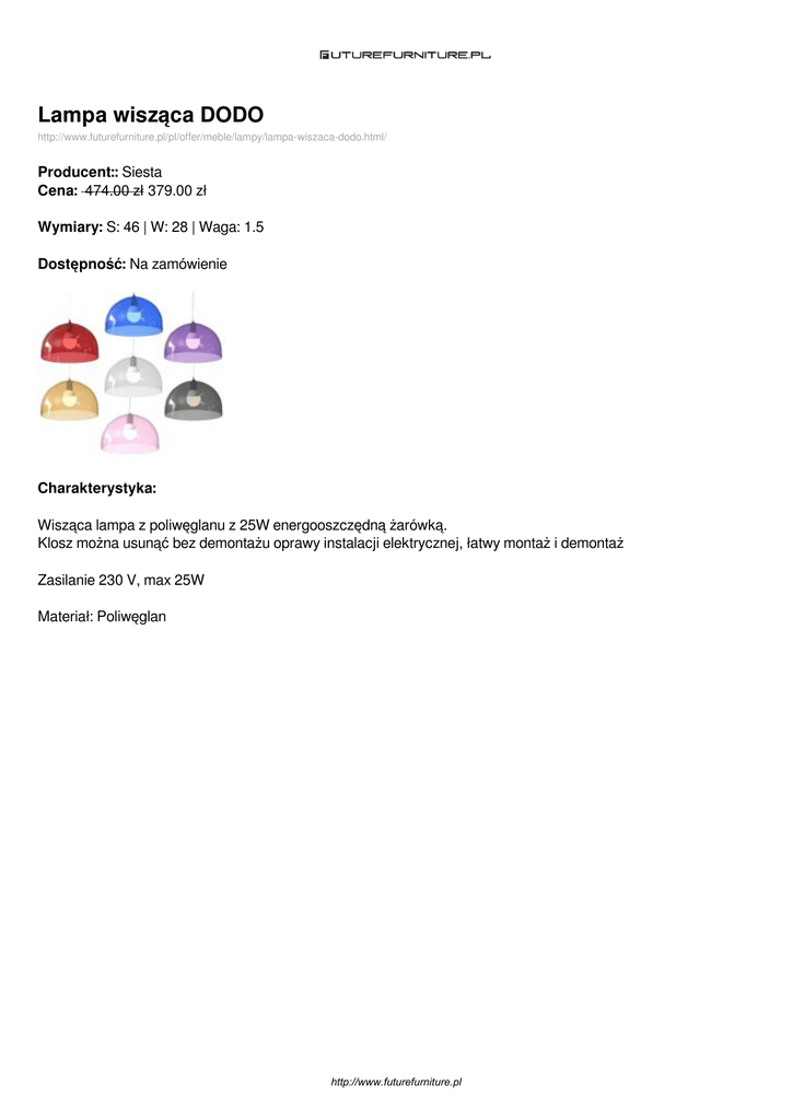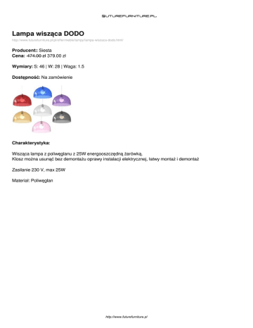 Lampa wisząca DODO http://www.futurefurniture.pl/pl/offer/meble/lampy/lampa-wiszaca-dodo.html/ Producent:: Siesta Cena: 474.00 zł 379.00 zł Wymiary: S: 46 | W: 28 | Waga: 1.5 Dostępność: Na zamówienie Charakterystyka: Wisząca lampa z poliwęglanu z 25W energooszczędną żarówką. Klosz można usunąć bez demontażu oprawy instalacji elektrycznej, łatwy montaż i demontaż Zasilanie 230 V, max 25W Materiał: Poliwęglan http://www.futurefurniture.pl Dostępne wersje produktu: nazwa produktu Lampa wisząca DODO warianty kolor transparentny dymiony cena 474.00zł 379.00zł dostępne Na zamówienie Lampa wisząca DODO kolor transparentny bezbarwny 474.00zł 349.00zł Na zamówienie Lampa wisząca DODO kolortransaprentny amber 474.00zł 379.00zł Na zamówienie Lampa wisząca DODO kolor transparentny fiolet 474.00zł 379.00zł Na zamówienie Lampa wisząca DODO kolor transparentny niebieski 474.00zł 379.00zł Na zamówienie Lampa wisząca DODO kolor transparentny różowy 474.00zł 379.00zł Na zamówienie Lampa wisząca DODO kolor transparentny czerwony 474.00zł 379.00zł Na zamówienie Lampa wisząca DODO kolor biały 474.00zł 379.00zł Na zamówienie http://www.futurefurniture.pl Zdjęcia produktu: http://www.futurefurniture.pl Powered by TCPDF (www.tcpdf.org)