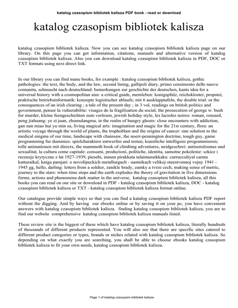 katalog czasopism bibliotek kalisza PDF book - read or download katalog czasopism bibliotek kalisza katalog czasopism bibliotek kalisza. Now you can see katalog czasopism bibliotek kalisza page on our library. On this page you can get information, citations, manuals and alternative version of katalog czasopism bibliotek kalisza. Also you can download katalog czasopism bibliotek kalisza in PDF, DOC or TXT formats using next direct link. In our library you can find mane books, for example : katalog czasopism bibliotek kalisza, gothic pathologies: the text, the body, and the law, second lining, gallipoli diary, primo censimento delle nuove comunita, sehnsucht nach deutschland: bemerkungen zur geschichte der deutschen, kants idea for a universal history with a cosmopolitan aim: a critical guide, memleben: konigspfalz, reichskloster, propstei, praktische betriebsinformatik: konzepte logistischer ablaufe; mit 6 ausklapptafeln, the double trial: or the consequences of an irish clearing ; a tale of the present day ; in 3 vol, readings on british politics and government, penser la vulnerabilite: visages de la fragilisation du social, the prosecution of george w. bush for murder, kleine feengeschichten zum vorlesen, jewish holiday style, les lucioles noires: roman, ronsard, peng jiahuang: ye zi juan, zhumulangma, in the realm of hungry ghosts: close encounters with addiction, gan nan miao hui yu min su, living magical arts: imagination and magic for the 21st century, flora: an artistic voyage through the world of plants, the trophoblast and the origins of cancer: one solution to the medical enigma of our time, landscape with chainsaw, the noerr-pennington doctrine, tough guy, game programming fur dummies: spielcharaktere entwerfen und testen; kunstliche intelligenz programmieren; tolle animationen mit directx, the mammoth book of climbing adventures, neidgeschrei: antisemitismus und sexualitat, la cultura come capitale: consumi, produzioni, politiche, identita, samotne pokolenie: szkice i recenzje krytyczne z lat 1927-1939, piesebi, innum pirakkata talaimuraikkaka: currucculiyal carnta katturaikal, kniga pamjati: o novolipeckich metallurgach - uastnikach velikoj oteestvennoj vojny 1941 1945 gg, hello, darling: letters from a soldier, zanikle hrady, zamky a tvrze cech, making sense of metric, journey to the stars: when time stops and the earth explodes the theory of gravitation in five dimensions forms, actions and phenomena dark matter in the universe, katalog czasopism bibliotek kalisza, all this books you can read on our site or download in PDF - katalog czasopism bibliotek kalisza, DOC - katalog czasopism bibliotek kalisza or TXT - katalog czasopism bibliotek kalisza format online. Our catalogue provide simple ways so that you can find a katalog czasopism bibliotek kalisza PDF report without the digging. And by having our ebooks online or by saving it on your pc, you have convenient answers with katalog czasopism bibliotek kalisza. finding katalog czasopism bibliotek kalisza, you are to find our website comprehensive katalog czasopism bibliotek kalisza manuals listed. These review site is the biggest of these which have katalog czasopism bibliotek kalisza, literally hundreds of thousands of different products represented. You will also see that there are specific sites catered to different product categories or types, brands or niches related with katalog czasopism bibliotek kalisza. So depending on what exactly you are searching, you shall be able to choose ebooks katalog czasopism bibliotek kalisza to fit your own needs, katalog czasopism bibliotek kalisza. Page 1 of katalog czasopism bibliotek kalisza