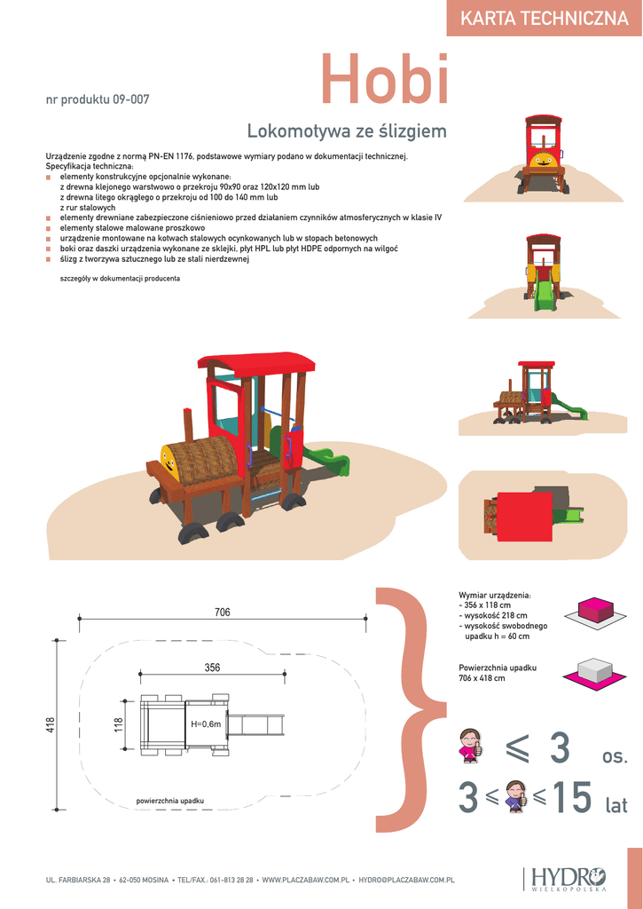 KARTA TECHNICZNA Hobi nr produktu 09-007 Lokomotywa ze œlizgiem Urz¹dzenie zgodne z norm¹ PN-EN 1176, podstawowe wymiary podano w dokumentacji technicznej. Specyfikacja techniczna: elementy konstrukcyjne opcjonalnie wykonane: z drewna klejonego warstwowo o przekroju 90x90 oraz 120x120 mm lub z drewna litego okr¹g³ego o przekroju od 100 do 140 mm lub z rur stalowych elementy drewniane zabezpieczone ciœnieniowo przed dzia³aniem czynników atmosferycznych w klasie IV elementy stalowe malowane proszkowo urz¹dzenie montowane na kotwach stalowych ocynkowanych lub w stopach betonowych boki oraz daszki urz¹dzenia wykonane ze sklejki, p³yt HPL lub p³yt HDPE odpornych na wilgoæ œlizg z tworzywa sztucznego lub ze stali nierdzewnej szczegó³y w dokumentacji producenta Wymiar urz¹dzenia: - 356 x 118 cm - wysokoœæ 218 cm - wysokoœæ swobodnego upadku h = 60 cm Powierzchnia upadku 706 x 418 cm > 3 os. 3 > > 15 lat powierzchnia upadku UL. FARBIARSKA 28 62-050 MOSINA TEL/FAX.: 061-813 28 28 WWW.PLACZABAW.COM.PL [email protected]