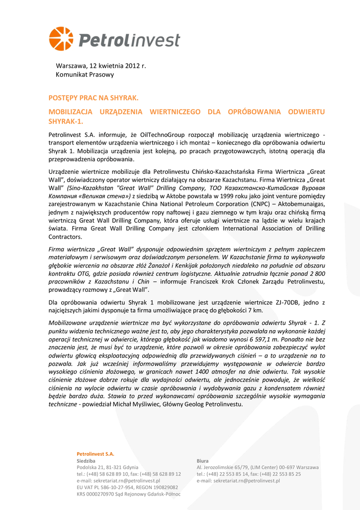 Warszawa, 12 kwietnia 2012 r. Komunikat Prasowy POSTĘPY PRAC NA SHYRAK. MOBILIZACJA URZĄDZENIA WIERTNICZEGO DLA OPRÓBOWANIA ODWIERTU SHYRAK-1. Petrolinvest S.A. informuje, że OilTechnoGroup rozpoczął mobilizację urządzenia wiertniczego transport elementów urządzenia wiertniczego i ich montaż – koniecznego dla opróbowania odwiertu Shyrak 1. Mobilizacja urządzenia jest kolejną, po pracach przygotowawczych, istotną operacją dla przeprowadzenia opróbowania. Urządzenie wiertnicze mobilizuje dla Petrolinvestu Chińsko-Kazachstańska Firma Wiertnicza „Great Wall”, doświadczony operator wiertniczy działający na obszarze Kazachstanu. Firma Wiertnicza „Great Wall” (Sino-Kazakhstan "Great Wall" Drilling Company, ТОО Казахстанско-Kитайская Bуровая Kомпания «Великая стена») z siedzibą w Aktobe powstała w 1999 roku jako joint venture pomiędzy zarejestrowanym w Kazachstanie China National Petroleum Corporation (CNPC) – Aktobemunaigas, jednym z największych producentów ropy naftowej i gazu ziemnego w tym kraju oraz chińską firmą wiertniczą Great Wall Drilling Company, która oferuje usługi wiertnicze na lądzie w wielu krajach świata. Firma Great Wall Drilling Company jest członkiem International Association of Drilling Contractors. Firma wiertnicza „Great Wall” dysponuje odpowiednim sprzętem wiertniczym z pełnym zapleczem materiałowym i serwisowym oraz doświadczonym personelem. W Kazachstanie firma ta wykonywała głębokie wiercenia na obszarze złóż Żanażoł i Kenkijak położonych niedaleko na południe od obszaru kontraktu OTG, gdzie posiada również centrum logistyczne. Aktualnie zatrudnia łącznie ponad 2 800 pracowników z Kazachstanu i Chin – informuje Franciszek Krok Członek Zarządu Petrolinvestu, prowadzący rozmowy z „Great Wall”. Dla opróbowania odwiertu Shyrak 1 mobilizowane jest urządzenie wiertnicze ZJ-70DB, jedno z najcięższych jakimi dysponuje ta firma umożliwiające pracę do głębokości 7 km. Mobilizowane urządzenie wiertnicze ma być wykorzystane do opróbowania odwiertu Shyrak - 1. Z punktu widzenia technicznego ważne jest to, aby jego charakterystyka pozwalała na wykonanie każdej operacji technicznej w odwiercie, którego głębokość jak wiadomo wynosi 6 597,1 m. Ponadto nie bez znaczenia jest, że musi być to urządzenie, które pozwoli w okresie opróbowania zabezpieczyć wylot odwiertu głowicą eksploatacyjną odpowiednią dla przewidywanych ciśnień – a to urządzenie na to pozwala. Jak już wcześniej informowaliśmy przewidujemy występowanie w odwiercie bardzo wysokiego ciśnienia złożowego, w granicach nawet 1400 atmosfer na dnie odwiertu. Tak wysokie ciśnienie złożowe dobrze rokuje dla wydajności odwiertu, ale jednocześnie powoduje, że wielkość ciśnienia na wylocie odwiertu w czasie opróbowania i wydobywania gazu z kondensatem również będzie bardzo duża. Stawia to przed wykonawcami opróbowania szczególnie wysokie wymagania techniczne - powiedział Michał Myśliwiec, Główny Geolog Petrolinvestu. Petrolinvest S.A. Siedziba Podolska 21, 81-321 Gdynia tel.: (+48) 58 628 89 10, fax: (+48) 58 628 89 12 e-mail: [email protected] EU VAT PL 586-10-27-954, REGON 190829082 KRS 0000270970 Sąd Rejonowy Gdańsk-Północ Biura Al. Jerozolimskie 65/79, (LIM Center) 00-697 Warszawa tel.: (+48) 22 553 85 14, fax: (+48) 22 553 85 25 e-mail: [email protected] Spółka zakłada, że, jeśli współpraca będzie układała się dobrze, a urządzenie wiertnicze potwierdzi w pełni swoją wartość techniczną, wówczas, jako jedno z wielu, może być wykorzystane do wiercenia kolejnych odwiertów na Shyraku. Drugim i głównym wykonawcą prac polegających na opróbowaniu odwiertu Shyrak będzie renomowana firma Schlumberger. Zakres prac firmy Schlumberger będzie obejmował perforację rur okładzinowych w wytypowanych poziomach złożowych, uzbrojenie wgłębne odwiertu w pakery i wgłębne urządzenia pomiarowe oraz wyposażenie wylot odwiertu w system oczyszczania i separacji mediów złożowych (gazu ziemnego, kondensatu i wody złożowej), i w końcu, wykonanie pomiarów wydajności i badań fizyko-chemicznych płynów złożowych. Na mobilizację i montaż urządzenia wiertniczego przewidzianych jest około 6 tygodni. Po zakończeniu montażu zostanie wykonany specjalny zakres prac przygotowujących, z których najważniejsze to między innymi próby ciśnieniowe kolumny rur okładzinowych 7 cali i próby ciśnieniowe zabezpieczenia wylotu odwiertu (głowicy eksploatacyjnej). Zgodnie z miejscowymi przepisami pozytywne wyniki tych prób będą podstawą dla uzyskania wszystkich zgód na prowadzenie dalszych prac w odwiercie. Ponadto przewidziano również wykonanie pomiaru stanu zacementowania rur okładzinowych 7 cali. – poinformował Michał Myśliwiec. Po wykonaniu prac przygotowujących Petrolinvest przystąpi do właściwego opróbowania, które rozpocznie się od perforacji rur okładzinowych w wytypowanych poziomach złożowych. W odwiercie Shyrak 1 wytypowano do opróbowania 19 poziomów złożowych o najlepszych właściwościach zbiornikowych położonych w interwale głębokości od 5489 do 6485 m. Ze względów technicznych i ekonomicznych wytypowane poziomy złożowe pogrupowano i ostatecznie wydzielono w profilu złożowym 3 strefy w interwałach głębokości: 6485-6264 m (109 metrów do perforacji), 6240-5975 m (155 metrów do perforacji) i 5910-5489 m (183 metry do perforacji). Łączna miąższość poziomów przewidywanych do perforacji w tych trzech strefach wynosi 447 m. Na opróbowanie każdej z 3 stref przewidzianych jest kilka tygodni. W okresie tym zakłada się wydobywanie gazu oraz separację kondensatu (potocznie - lekkiej ropy naftowej). Dostatecznie długi okres opróbowania pozwoli określić nie tylko wydajność odwiertu dla każdej wytypowanej strefy, ale dostarczy również ważnych danych dla szac