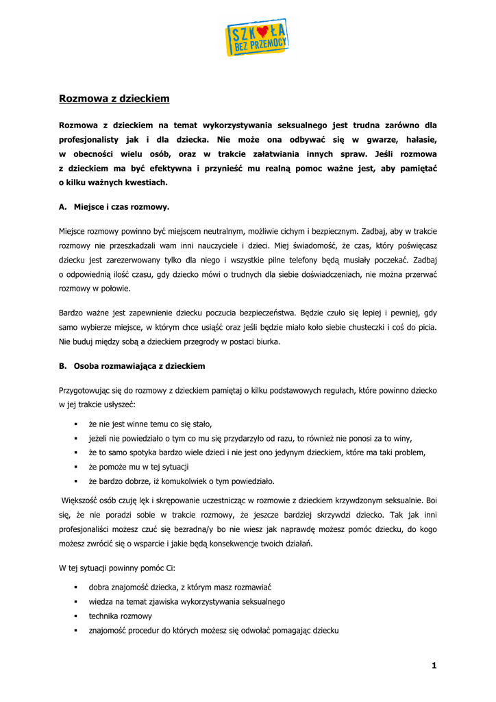 Rozmowa z dzieckiem Rozmowa z dzieckiem na temat wykorzystywania seksualnego jest trudna zarówno dla profesjonalisty jak i dla dziecka. Nie moŜe ona odbywać się w gwarze, hałasie, w obecności wielu osób, oraz w trakcie załatwiania innych spraw. Jeśli rozmowa z dzieckiem ma być efektywna i przynieść mu realną pomoc waŜne jest, aby pamiętać o kilku waŜnych kwestiach. A. Miejsce i czas rozmowy. Miejsce rozmowy powinno być miejscem neutralnym, moŜliwie cichym i bezpiecznym. Zadbaj, aby w trakcie rozmowy nie przeszkadzali wam inni nauczyciele i dzieci. Miej świadomość, Ŝe czas, który poświęcasz dziecku jest zarezerwowany tylko dla niego i wszystkie pilne telefony będą musiały poczekać. Zadbaj o odpowiednią ilość czasu, gdy dziecko mówi o trudnych dla siebie doświadczeniach, nie moŜna przerwać rozmowy w połowie. Bardzo waŜne jest zapewnienie dziecku poczucia bezpieczeństwa. Będzie czuło się lepiej i pewniej, gdy samo wybierze miejsce, w którym chce usiąść oraz jeśli będzie miało koło siebie chusteczki i coś do picia. Nie buduj między sobą a dzieckiem przegrody w postaci biurka. B. Osoba rozmawiająca z dzieckiem Przygotowując się do rozmowy z dzieckiem pamiętaj o kilku podstawowych regułach, które powinno dziecko w jej trakcie usłyszeć: Ŝe nie jest winne temu co się stało, jeŜeli nie powiedziało o tym co mu się przydarzyło od razu, to równieŜ nie ponosi za to winy, Ŝe to samo spotyka bardzo wiele dzieci i nie jest ono jedynym dzieckiem, które ma taki problem, Ŝe pomoŜe mu w tej sytuacji Ŝe bardzo dobrze, iŜ komukolwiek o tym powiedziało. Większość osób czuję lęk i skrępowanie uczestnicząc w rozmowie z dzieckiem krzywdzonym seksualnie. Boi się, Ŝe nie poradzi sobie w trakcie rozmowy, Ŝe jeszcze bardziej skrzywdzi dziecko. Tak jak inni profesjonaliści moŜesz czuć się bezradna/y bo nie wiesz jak naprawdę moŜesz pomóc dziecku, do kogo moŜesz zwrócić się o wsparcie i jakie będą konsekwencje twoich działań. W tej sytuacji powinny pomóc Ci: dobra znajomość dziecka, z którym masz rozmawiać wiedza na temat zjawiska wykorzystywania seksualnego technika rozmowy znajomość procedur do których moŜesz się odwołać pomagając dziecku 1 Ŝyczliwe osoby, które pomogą Ci uporać się z twoimi emocjami naturalnie pojawiającymi się w trakcie kontaktu z dzieckiem wykorzystywanym seksualnie. Pamiętaj, Ŝe jeŜeli dziecko samo wybrało Ciebie jako sojusznika w rozwiązaniu swojego problemu to znaczy, Ŝe darzy Cię zaufaniem i głęboko wierzy, Ŝe jesteś właściwą osobą, która go wesprze. Jeśli ty sam/a inicjujesz taką rozmowę to waŜne jest abyś wiedział/a, Ŝe zanim pomoŜesz dziecku musisz zdobyć jego zaufanie. C. Sposób prowadzenia rozmowy z dzieckiem Zanim przystąpisz do rozmowy z dzieckiem zaplanuj jej przebieg. Musisz wiedzieć, jaki jest cel tej rozmowy, czego powinieneś się dowiedzieć i o czym nie moŜesz zapomnieć. Na podstawie wcześniej uzyskanych informacji o dziecku przygotuj sobie pomoce, które mogą być ci potrzebne np. rozmawiając z młodszym dzieckiem pamiętaj o kredkach, maskotkach itp. Celem rozmowy z dzieckiem wykorzystywanym seksualnie jest nie tylko zebranie informacji o trudnych dla niego wydarzeniach, ale równieŜ udzielenie mu wsparcia. Aby udzielić dziecku pomocy musisz dowiedzieć się, co mu się wydarzyło i kto był sprawcą jego krzywdzenia. Dzieci wykorzystywane seksualnie często mają trudności w otwartym opowiadaniu o swoich traumatycznych przeŜyciach. Dlatego teŜ waŜne jest, aby dorosły nie pośpieszał dziecka i dostosował się do jego tempa relacjonowania zdarzeń. Na początku zbuduj z dzieckiem dobrą relację. Porozmawiaj z nim na tematy neutralne, ale waŜne dla dziecka. OkaŜ mu, Ŝe interesujesz się nim a nie tylko tym, czego chcesz się od niego dowiedzieć. Pokazując dziecku, Ŝe jest dla ciebie waŜne, wzbudzasz w nim zaufanie i chęć otwarcia się. Porozmawiaj z nim o jego zainteresowaniach, sukcesach. Poznaj jego opinię dotyczącą waŜnych dla niego spraw. Z reguły nie jest dobrym pomysłem rozpoczynanie kontaktu od rozmowy o postępach w nauce, przyjaciołach i relacjach wewnątrzrodzinnych. Wszystkie te tematy u dzieci wykorzystywanych seksualnie mogą łączyć się z przeŜywaniem przez nie trudnych emocji. Po dobrym nawiązaniu kontaktu z dzieckiem moŜesz przejść do pytań związanych z zasadniczym celem spotkania. Zacznij od pytań otwartych, które dają mu moŜliwość opowiedzenia o swoim problemie. Pytania otwarte mogą zaczynać się od wyraŜeń „ czy mógłbyś mi o tym opowiedzieć”, „chciałabym lepiej zrozumieć co Ci się zdarzyło”, „czy moŜesz powiedzieć coś więcej o tej sytuacji” Nie zadawaj pytań sugerujących typu: „ czy to było na podwórku czy w domu”, „ czy tata dotykał cię do narządów płciowych” itd. Pomocne w pogłębianiu kontaktu z dzieckiem i budowaniu w nim poczucia bycia słychanym i zrozumianym jest tzw. parafrazowanie tzn. powiedzenie własnymi słowami, tego co powiedział rozmówca. Parafraza często zaczyna się od słów: „o ile dobrze zrozumiałam powiedziałeś, Ŝe…” 2 W kontakcie z dzieckiem pomaga równieŜ odzwierciedlanie jego emocji. Odzwierciedlanie pomaga dziecku nazywać i pełniej doświadczyć tego co czuje. MoŜemy powiedzieć „ widzę, Ŝe jest ci smutno”. Niezwykle waŜne jest to, Ŝebyś umiał oddzielić swoje emocje od emocji dziecka. Często zdarza się, Ŝe osoba kontaktująca się z dzieckiem wykorzystywanym seksualnie sama przeŜywa szereg silnych uczuć. Pamiętaj, Ŝeby twoje emocje nie przytłoczyły dziecka i Ŝebyś nie przypisywał mu tego, co sam/a przeŜywasz. W trakcie rozmowy naleŜy ustalić z dzieckiem nazewnictwo dotyczące genitaliów i zachowań seksualnych. Rozmowa z dzieckiem wykorzystywanym seksualnie o doświadczeniach urazowych nie jest dobrym momentem na prowadzenie edukacji seksualnej. Z reg
