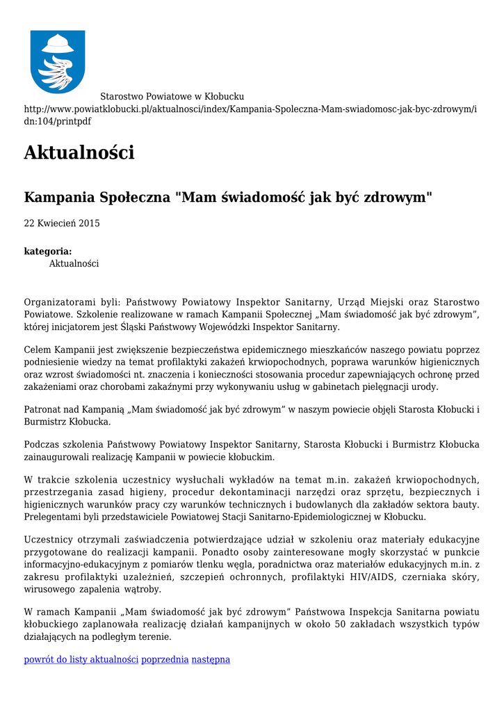 Starostwo Powiatowe w Kłobucku http://www.powiatklobucki.pl/aktualnosci/index/Kampania-Spoleczna-Mam-swiadomosc-jak-byc-zdrowym/i dn:104/printpdf Aktualności Kampania Społeczna "Mam świadomość jak być zdrowym" 22 Kwiecień 2015 kategoria: Aktualności Organizatorami byli: Państwowy Powiatowy Inspektor Sanitarny, Urząd Miejski oraz Starostwo Powiatowe. Szkolenie realizowane w ramach Kampanii Społecznej „Mam świadomość jak być zdrowym”, której inicjatorem jest Śląski Państwowy Wojewódzki Inspektor Sanitarny. Celem Kampanii jest zwiększenie bezpieczeństwa epidemicznego mieszkańców naszego powiatu poprzez podniesienie wiedzy na temat profilaktyki zakażeń krwiopochodnych, poprawa warunków higienicznych oraz wzrost świadomości nt. znaczenia i konieczności stosowania procedur zapewniających ochronę przed zakażeniami oraz chorobami zakaźnymi przy wykonywaniu usług w gabinetach pielęgnacji urody. Patronat nad Kampanią „Mam świadomość jak być zdrowym” w naszym powiecie objęli Starosta Kłobucki i Burmistrz Kłobucka. Podczas szkolenia Państwowy Powiatowy Inspektor Sanitarny, Starosta Kłobucki i Burmistrz Kłobucka zainaugurowali realizację Kampanii w powiecie kłobuckim. W trakcie szkolenia uczestnicy wysłuchali wykładów na temat m.in. zakażeń krwiopochodnych, przestrzegania zasad higieny, procedur dekontaminacji narzędzi oraz sprzętu, bezpiecznych i higienicznych warunków pracy czy warunków technicznych i budowlanych dla zakładów sektora bauty. Prelegentami byli przedstawiciele Powiatowej Stacji Sanitarno-Epidemiologicznej w Kłobucku. Uczestnicy otrzymali zaświadczenia potwierdzające udział w szkoleniu oraz materiały edukacyjne przygotowane do realizacji kampanii. Ponadto osoby zainteresowane mogły skorzystać w punkcie informacyjno-edukacyjnym z pomiarów tlenku węgla, poradnictwa oraz materiałów edukacyjnych m.in. z zakresu profilaktyki uzależnień, szczepień ochronnych, profilaktyki HIV/AIDS, czerniaka skóry, wirusowego zapalenia wątroby. W ramach Kampanii „Mam świadomość jak być zdrowym” Państwowa Inspekcja Sanitarna powiatu kłobuckiego zaplanowała realizację działań kampanijnych w około 50 zakładach wszystkich typów działających na podległym terenie. powrót do listy aktualności poprzednia następna
