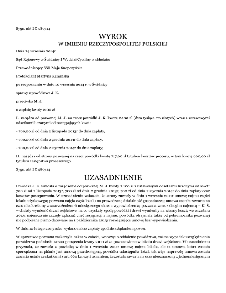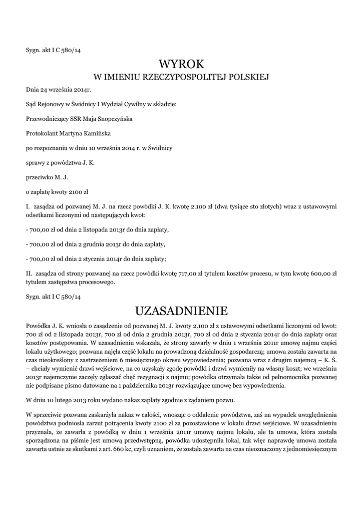 Sygn. akt I C 580/14 WYROK W IMIENIU RZECZYPOSPOLITEJ POLSKIEJ Dnia 24 września 2014r. Sąd Rejonowy w Świdnicy I Wydział Cywilny w składzie: Przewodniczący SSR Maja Snopczyńska Protokolant Martyna Kamińska po rozpoznaniu w dniu 10 września 2014 r. w Świdnicy sprawy z powództwa J. K. przeciwko M. J. o zapłatę kwoty 2100 zł I. zasądza od pozwanej M. J. na rzecz powódki J. K. kwotę 2.100 zł (dwa tysiące sto złotych) wraz z ustawowymi odsetkami liczonymi od następujących kwot: - 700,00 zł od dnia 2 listopada 2013r do dnia zapłaty, - 700,00 zł od dnia 2 grudnia 2013r do dnia zapłaty, - 700,00 zł od dnia 2 stycznia 2014r do dnia zapłaty; II. zasądza od strony pozwanej na rzecz powódki kwotę 717,00 zł tytułem kosztów procesu, w tym kwotę 600,00 zł tytułem zastępstwa procesowego. Sygn. akt I C 580/14 UZASADNIENIE Powódka J. K. wniosła o zasądzenie od pozwanej M. J. kwoty 2.100 zł z ustawowymi odsetkami liczonymi od kwot: 700 zł od 2 listopada 2013r, 700 zł od dnia 2 grudnia 2013r, 700 zł od dnia 2 stycznia 2014r do dnia zapłaty oraz kosztów postępowania. W uzasadnieniu wskazała, że strony zawarły w dniu 1 września 2011r umowę najmu części lokalu użytkowego; pozwana najęła część lokalu na prowadzoną działalność gospodarczą; umowa została zawarta na czas nieokreślony z zastrzeżeniem 6 miesięcznego okresu wypowiedzenia; pozwana wraz z drugim najemcą – K. Ś. – chciały wymienić drzwi wejściowe, na co uzyskały zgodę powódki i drzwi wymieniły na własny koszt; we wrześniu 2013r najemczynie zaczęły zgłaszać chęć rezygnacji z najmu; powódka otrzymała także od pełnomocnika pozwanej nie podpisane pismo datowane na 1 października 2013r rozwiązujące umowę bez wypowiedzenia. W dniu 10 lutego 2013 roku wydano nakaz zapłaty zgodnie z żądaniem pozwu. W sprzeciwie pozwana zaskarżyła nakaz w całości, wnosząc o oddalenie powództwa, zaś na wypadek uwzględnienia powództwa podniosła zarzut potrącenia kwoty 2100 zł za pozostawione w lokalu drzwi wejściowe. W uzasadnieniu przyznała, że zawarła z powódką w dniu 1 września 2011r umowę najmu lokalu, ale ta umowa, która została sporządzona na piśmie jest umową przedwstępną, powódka udostępniła lokal, tak więc naprawdę umowa została zawarta ustnie ze skutkami z art. 660 kc, czyli uznaniem, że została zawarta na czas nieoznaczony z jednomiesięcznym terminem wypowiedzenia; pozwana rozwiązała umowę bez wypowiedzenia; przyznała, że niezależnie od pisma obie najemczynie wypowiedziały umowę w trakcie rozmowy z powódką. W toku postępowania Sąd ustalił następujący stan faktyczny: Strony łączyła umowa najmu części lokalu użytkowego z dnia 1 września 2011 roku zawarta na czas nieokreślony. Czynsz najmu strony ustaliły na kwotę 700 zł, płatny do końca miesiąca. Strony przewidziały, że każda ze stron może wypowiedzieć umowę najmu z zachowaniem 6 miesięcznego okresu wypowiedzenia. Wynajmująca wyraziła zgodę na wymianę drzwi wejściowych, koszt wymiany ma zostać podzielny na dwóch najemców lokalu. DOWÓD: umowa najmu k. 8 W spornym lokalu pozwana prowadziła działalność razem z K. Ś. (2), która miała zawartą odrębną umowę najmu z powódką. W trakcie trwania tej umowy zostały wymienione drzwi do lokalu. BEZSPORNE Powódka przewidziała w lokalu ogrzewanie elektryczne. K. Ś. (2) w trakcie prowadzonej działalności gospodarczej z przyczyn ekonomicznych zrezygnowała z ogrzewania elektrycznego i zainstalowała ogrzewanie na butlę gazową. Podobne ogrzewania zainstalowała pozwana z uwagi na koszty ogrzewania elektrycznego. DOWÓD: zeznania świadka K. Ś. k. 50-51 pozwanej - zapis na płycie CD k. 98 W dniu 7 XII 2011r Firma (...) w Ż. wystawiła na H. K. Ś. faktury: za drzwi aluminiowe z witryną na kwotę 3.296,40 zł oraz na łącznik kątowy na kwotę 319,80 zł. DOWÓD: faktury z 7 XII 2011r k. 28, 29 W czasie rozmowy w dniu 25 września 2013r. pozwana poinformowała powódkę, że rozwiązuje umowę najmu i w ciągu 30 dni opuści lokal. DOWÓD: zeznania świadka K. Ś. k. 50-51 powódki – zapis na płycie CD k. 98 pozwanej - zapis na płycie CD k. 98 Pismem z dnia 1 października 2013 roku pozwana poinformowała powódkę, o rozwiązaniu umowy najmu bez wypowiedzenia wskazując, że lokal ma wady, które nie dadzą się usunąć; jednym z nowych wymogów sanitarnoepidemiologicznych jest istnienie wiatrołapu, kurtyny powietrznej, rozkładu pomieszczeń i wymogu istnienia bezpiecznego ogrzewania; istniejące ogrzewanie gazowe nie spełnia wymogów bhp, ponieważ lokalu nie da się dostosować do zmienionych przepisów umowa zostaje rozwiązana z dniem 30 października 2013r. DOWÓD: pismo pozwanej k. 1 X 2013 k. 9 W dniu 1 XI 2013r pozwana opuściła lokal i nie uiszczała czynszu za okres objety pozwem. BEZSPORNE W czasie trwania umowy przeprowadzane były kontrole Sanepidu. W ich wyniku nie ujawniono żadnych nieprawidłowości i nie wydano zaleceń pokontrolnych. DOWÓD: zeznania świadka A. W. k. 77 Pismem z dnia 22 listopada 2013 roku powódka wezwała pozwaną do uiszczenia kwoty objętej pozwem. DOWÓD: pismo z 22 XI 2013r k. 11 W tak ustalonym stanie faktycznym Sąd zważył, co następuje: Powództwo jest zasadne. Powódka wniosła o zasądzenie kwoty 2100 zł tytułem czynszu za okres wypowiedzenia – od października do grudnia 2013r, wskazując że strony łączyła umowa najmu części lokalu użytkowego na czas nieokreślony, która została wypowiedziana przez pozwaną. W sprzeciwie pozwana zaskarżyła nakaz w całości, ponosząc, że strony łączyła umowa ustna, gdyż z treści umowy dołączonej do pozwu wynika, że jest to umowa przedwstępna, a tym samym zastosowanie znajdzie przepis art. 673 kc wskazujący na jednomiesięczny okres wypowiedzenia; ponadto wskazała, że umowa została wypowiedziana przez pozwaną bez zachowania okresu wypowiedzenia. Na wstępie rozwa