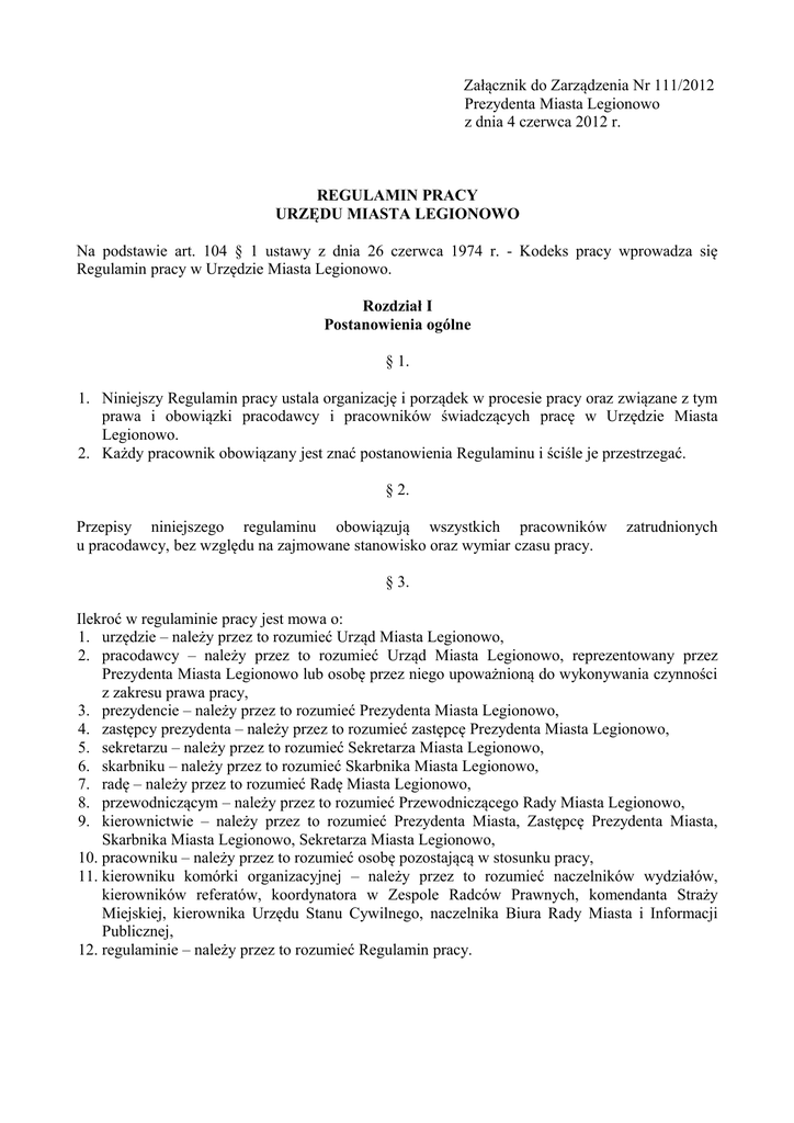 Załącznik do Zarządzenia Nr 111/2012 Prezydenta Miasta Legionowo z dnia 4 czerwca 2012 r. REGULAMIN PRACY URZĘDU MIASTA LEGIONOWO Na podstawie art. 104 § 1 ustawy z dnia 26 czerwca 1974 r. - Kodeks pracy wprowadza się Regulamin pracy w Urzędzie Miasta Legionowo. Rozdział I Postanowienia ogólne § 1. 1. Niniejszy Regulamin pracy ustala organizację i porządek w procesie pracy oraz związane z tym prawa i obowiązki pracodawcy i pracowników świadczących pracę w Urzędzie Miasta Legionowo. 2. Każdy pracownik obowiązany jest znać postanowienia Regulaminu i ściśle je przestrzegać. § 2. Przepisy niniejszego regulaminu obowiązują wszystkich pracowników u pracodawcy, bez względu na zajmowane stanowisko oraz wymiar czasu pracy. zatrudnionych § 3. Ilekroć w regulaminie pracy jest mowa o: 1. urzędzie – należy przez to rozumieć Urząd Miasta Legionowo, 2. pracodawcy – należy przez to rozumieć Urząd Miasta Legionowo, reprezentowany przez Prezydenta Miasta Legionowo lub osobę przez niego upoważnioną do wykonywania czynności z zakresu prawa pracy, 3. prezydencie – należy przez to rozumieć Prezydenta Miasta Legionowo, 4. zastępcy prezydenta – należy przez to rozumieć zastępcę Prezydenta Miasta Legionowo, 5. sekretarzu – należy przez to rozumieć Sekretarza Miasta Legionowo, 6. skarbniku – należy przez to rozumieć Skarbnika Miasta Legionowo, 7. radę – należy przez to rozumieć Radę Miasta Legionowo, 8. przewodniczącym – należy przez to rozumieć Przewodniczącego Rady Miasta Legionowo, 9. kierownictwie – należy przez to rozumieć Prezydenta Miasta, Zastępcę Prezydenta Miasta, Skarbnika Miasta Legionowo, Sekretarza Miasta Legionowo, 10. pracowniku – należy przez to rozumieć osobę pozostającą w stosunku pracy, 11. kierowniku komórki organizacyjnej – należy przez to rozumieć naczelników wydziałów, kierowników referatów, koordynatora w Zespole Radców Prawnych, komendanta Straży Miejskiej, kierownika Urzędu Stanu Cywilnego, naczelnika Biura Rady Miasta i Informacji Publicznej, 12. regulaminie – należy przez to rozumieć Regulamin pracy. § 4. 1. Czynności w sprawach z zakresu prawa pracy wobec zastępcy prezydenta, sekretarza, skarbnika oraz kierowników gminnych jednostek organizacyjnych wykonuje prezydent. 2. Czynności wobec pozostałych pracowników urzędu, niewymienionych w ust. 1, wykonuje prezydent. 3. Pracodawcą prezydenta jest urząd. 4. Czynności z zakresu prawa pracy wobec prezydenta związane z nawiązaniem i rozwiązaniem stosunku pracy wykonuje przewodniczący, a pozostałe czynności sekretarz, z tym, że wynagrodzenie prezydenta ustala rada w drodze uchwały. §5. 1. Prezydent przyjmuje raz w tygodniu pracowników w sprawach skarg i wniosków dotyczących spraw ogólnych urzędu i kierownictwa. 2. Pracownik nie poniesie konsekwencji służbowych z powodu złożenia wniosku lub skargi, zawierających prawdziwe informacje. §6. 1. Urząd zapewnia pracownikom prawo wzajemnej komunikacji wewnątrz urzędu, dyskusji, przedstawienia sugestii, pytań, czy problemów. 2. Wszelkie problemy pracowników powinny być kierowane w pierwszej kolejności do bezpośredniego przełożonego, a w przypadku niesatysfakcjonującego pracownika rozwiązania do kierownictwa zgodnie z hierarchią wynikającą ze struktury organizacyjnej urzędu. §7. Nowo przyjmowany pracownik przed przystąpieniem do pracy ma obowiązek zapoznać się z treścią Regulaminu, a oświadczenie o zapoznaniu się z jego treścią, podpisane przez pracownika włączane jest do akt osobowych pracownika. Rozdział II Prawa i obowiązki pracodawcy §8. Pracodawca jest zobowiązany w szczególności do: 1) zapewnienia pracownikowi pracy zgodnie z treścią aktu kreującego treść stosunku pracy (wybór, powołanie, umowa o pracę), 2) zapoznania pracownika podejmującego pracę w urzędzie z zakresem jego obowiązków, sposobem wykonywania pracy na wyznaczonym stanowisku oraz podstawowymi uprawnieniami, 3) zapoznania pracownika z regulaminem pracy, regulaminem organizacyjnym urzędu, oraz innymi wewnętrznymi aktami normatywnymi i wyjaśnienia na żądanie ich treści, 4) zapoznania pracownika z kartą stanowiska pracy, 5) organizowania pracy w sposób zapewniający pełne wykorzystanie czasu pracy, jak również osiąganie przez pracownika, przy wykorzystaniu jego uzdolnień i kwalifikacji, wysokiej wydajności i należytej jakości pracy, 6) stworzenia warunków do przestrzegania porządku i dyscypliny pracy, 7) zapewnienia bezpiecznych i higienicznych warunków pracy oraz prowadzenia systematycznych szkoleń pracowników w zakresie bezpieczeństwa i higieny pracy, a także informowania pracowników na w/w szkoleniach o ryzyku zawodowym związanym z wykonywaną pracą i ochronie przed zagrożeniami, 8) wydawania pracownikowi potrzebnych mu materiałów i urządzeń, odzieży i obuwia roboczego, sprzętu ochrony osobistej oraz zapewnienia odpowiednio zabezpieczonego miejsca na ich przechowywanie, 9) terminowego i prawidłowego wypłacania wynagrodzenia, 10) stosowania obiektywnych i sprawiedliwych kryteriów oceny wyników pracy według zasad określonych w odrębnym zarządzeniu prezydenta, 11) zapewnienia świadczeń socjalnych zgodnie z obowiązującym regulaminem Zakładowego Funduszu Świadczeń Socjalnych, 12) prowadzenia dokumentacji w sprawach związanych ze stosunkiem pracy oraz akt osobowych pracowników, a w razie rozwiązania albo wygaśnięcia stosunku pracy - do niezwłocznego wydania świadectwa pracy, 13) ułatwiania pracownikowi podnoszenie kwalifikacji zawodowych, 14) wpływania na kształtowanie zasad współżycia społecznego i poszanowania godności, ochrony dóbr osobistych pracowników i niedopuszczania do jakiejkolwiek dyskryminacji w stosunkach pracy, 15) przeciwdziałania mobbingowi w pracy. §9. 1. Na pracodawcy ciąży obowiązek niezwłocznego potwierdzania pracownikom na piśmie rodzaju zawartej umowy o pracę i 