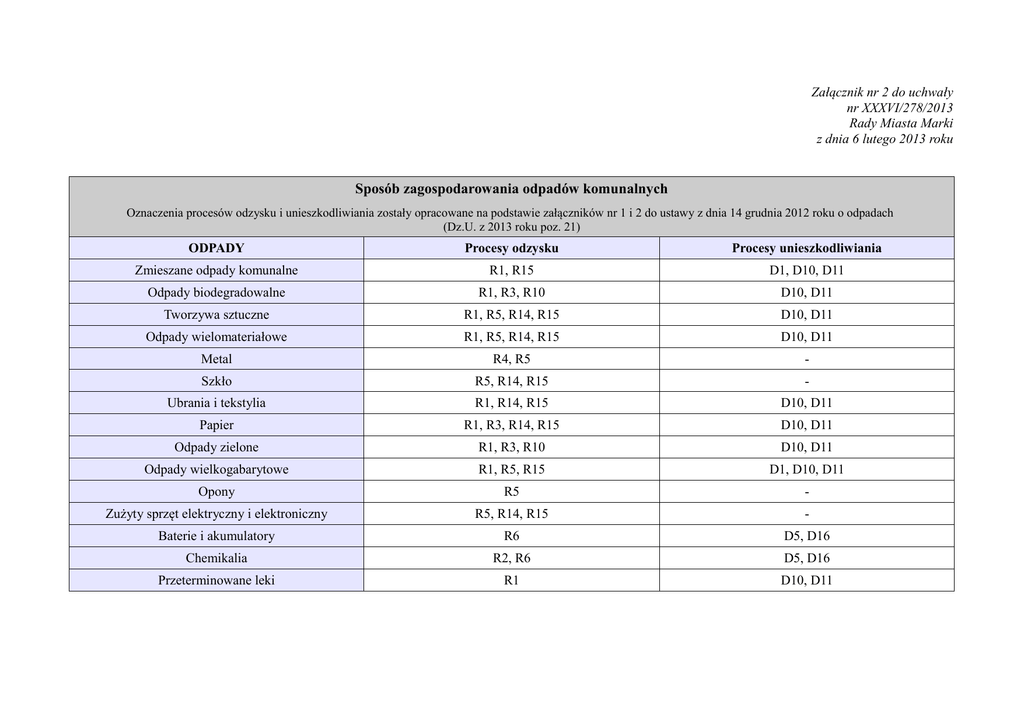 Załącznik nr 2 do uchwały nr XXXVI/278/2013 Rady Miasta Marki z dnia 6 lutego 2013 roku Sposób zagospodarowania odpadów komunalnych Oznaczenia procesów odzysku i unieszkodliwiania zostały opracowane na podstawie załączników nr 1 i 2 do ustawy z dnia 14 grudnia 2012 roku o odpadach (Dz.U. z 2013 roku poz. 21) ODPADY Procesy odzysku Procesy unieszkodliwiania Zmieszane odpady komunalne R1, R15 D1, D10, D11 Odpady biodegradowalne R1, R3, R10 D10, D11 Tworzywa sztuczne R1, R5, R14, R15 D10, D11 Odpady wielomateriałowe R1, R5, R14, R15 D10, D11 Metal R4, R5 - Szkło R5, R14, R15 - Ubrania i tekstylia R1, R14, R15 D10, D11 Papier R1, R3, R14, R15 D10, D11 Odpady zielone R1, R3, R10 D10, D11 Odpady wielkogabarytowe R1, R5, R15 D1, D10, D11 Opony R5 - Zużyty sprzęt elektryczny i elektroniczny R5, R14, R15 - Baterie i akumulatory R6 D5, D16 Chemikalia R2, R6 D5, D16 Przeterminowane leki R1 D10, D11
