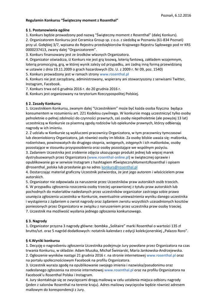 Poznań, 6.12.2016 Regulamin Konkursu “Świąteczny moment z Rosenthal” § 1. Postanowienia ogólne 1. Konkurs będzie prowadzony pod nazwą “Świąteczny moment z Rosenthal” (dalej Konkurs). 2. Organizatorem Konkursu jest Ceramica Group sp. z o.o. z siedzibą w Poznaniu (61-834 Poznań) przy ul. Gołębiej 3/7, wpisana do Rejestru przedsiębiorców Krajowego Rejestru Sądowego pod nr KRS 0000237413, zwany dalej “Organizatorem”. 3. Konkurs finansowany jest ze środków własnych Organizatora. 4. Organizator oświadcza, iż Konkurs nie jest grą losową, loterią fantową, zakładem wzajemnym, loterią promocyjną, grą, w której wynik zależy od przypadku, ani żadną inną formą przewidzianą w ustawie z dnia 19.11.2009 o grach hazardowych (Dz. U. z 2009 r. Nr 09, poz. 1540) 5. Konkurs prowadzony jest w ramach strony www.rosenthal.pl 6. Konkurs nie jest zarządzany, administrowany, wspierany ani stowarzyszony z serwisami Twitter, Instagram, Facebook. 7. Konkurs trwa od 6 grudnia 2016 r. do 20 grudnia 2016 r. 8. Konkurs jest organizowany na terytorium Rzeczypospolitej Polskiej. § 2. Zasady Konkursu 1. Uczestnikiem Konkursu, zwanym dalej “Uczestnikiem” może być każda osoba fizyczna będąca konsumentem w rozumieniu art. 221 Kodeksu cywilnego. W konkursie mogą uczestniczyć tylko osoby pełnoletnie o pełnej zdolności do czynności prawnych, zaś osoby niepełnoletnie (ale powyżej 13 lat) uczestniczą w Konkursie za pisemną zgodą rodziców lub opiekunów prawnych, którzy odbierają nagrody w ich imieniu. 2. Z udziału w Konkursie są wykluczeni pracownicy Organizatora, w tym pracownicy tymczasowi lub zleceniobiorcy Organizatora, jak również osoby im bliskie. Za osoby bliskie uważa się: małżonka, rodzeństwo, powinowatych do drugiego stopnia, wstępnych, zstępnych i ich małżonków, osoby pozostające w stosunku przysposobienia oraz osoby pozostające we wspólnym pożyciu. 3. Zadaniem Uczestnika jest zrobienie zdjęcia ukazującego produkt jednej lub więcej marek dystrybuowanych przez Organizatora (www.rosenthal-online.pl) w świątecznej oprawie i opublikowanie go w serwisie Instagram z hashtagiem #ŚwiątecznyMomentzRosenthal i opisem @rosenthal_polska lub przesłanie go na adres [email protected] 4. Dostarczając materiał graficzny Uczestnik potwierdza, że jest jego autorem i właścicielem praw autorskich. 5. Organizator nie odpowiada za naruszenie przez Uczestników praw autorskich osób trzecich. 6. W przypadku zgłoszenia roszczenia osoby trzeciej uprawnionej z tytułu praw autorskich lub pochodnych do materiałów nadesłanych przez uczestników organizator zastrzega sobie prawo usunięcia zgłoszenia uczestnika w Konkursie, ewentualnie unieważnienia wyniku danego uczestnika i wystąpienia z żądaniem o zwrot nagrody oraz żądaniem zwrotu wszystkich uzasadnionych kosztów poniesionych przez Organizatora w związku z naruszeniem przez uczestnika praw osoby trzeciej. 7. Uczestnik ma możliwość wysłania jednego zgłoszenia konkursowego. § 3. Nagrody 1. Organizator przyzna 3 nagrody główne: bombka „Solitaire” marki Rosenthal o wartości 135 zł brutto/szt. oraz 5 nagród dodatkowych: notatnik-kalendarz z edycji kolekcjonerskiej „Palazzo Roro”. § 4.Wyniki konkursu 1. Decyzję o nagrodzeniu zgłoszenia Uczestnika podejmuje Jury powołane przez Organizatora na czas trwania Konkursu, w składzie: Adam Muszka, Michał Świniarski, Maria Jankowska-Andrzejewska. 2. Ogłoszenie wyników nastąpi 21 grudnia 2016 r. na stronie internetowej www.rosenthal.pl oraz na portalu społecznościowym Facebook na profilu Organizatora. 3. Uczestnik wyraża zgodę na opublikowanie swojego imienia i nazwiska/pseudonimu oraz nadesłanego zgłoszenia na stronie internetowej www.rosenthal.pl oraz na profilu Organizatora na Facebook’u Rosenthal Polska i Instagram. 4. Jury skontaktuje się ze zwycięzcami drogą mailową w celu ustalenia miejsca odbioru nagrody (jeden z salonów Rosenthal na terenie kraju). Adres mailowy zwycięzców będzie również adresem mailowym do korespondencji z Jury. 6. W przypadku gdy zwycięzca nie odbierze nagrody do dnia 31 stycznia 2017 roku prawo do nagrody wygasa. 7. Podanie przez uczestników nieprawdziwych lub niekompletnych danych (imienia, nazwiska, adresu zamieszkania) stanowi przyczynę odmowy wydania nagrody i wygaśnięcia prawa do nagrody. 8. Organizator nabywa prawa autorskie do nagrodzonych zgłoszeń zgodnie z zastrzeżeniem par.2 ust 4,5. 9. Decyzje Jury są ostateczne z zastrzeżeniem par. 2 ust 6 10. Organizator skontaktuje się ze zwycięzcami w celu potwierdzenia wygranej. 11. Nagrody nie podlegają wymianie na gotówkę lub inne przedmioty. 12. W przypadku nie wydania wszystkich nagród z powodu wpłynięcia mniejszej liczby zgłoszeń, braku możliwości kontaktu z uczestnikiem etc. niewydane nagrody pozostaną do dyspozycji Organizatora. Organizator zastrzega sobie prawo do podjęcia decyzji o sposobie wykorzystania niewydanych nagród. § 5. Dane osobowe 1. Przetwarzanie danych osobowych Uczestników Konkursu odbywa się zgodnie z ustawą o ochronie danych osobowych z dnia 29 sierpnia 1997 (Dz.U. z 2002, nr101, poz.926, z późn. zm). Administratorem zbioru danych jest Organizator. 2. Uczestnik Konkursu wysyłając zgłoszenie wyraża zgodę na przetwarzanie jego danych osobowych przez Organizatora w celu realizacji obowiązków wynikających z przeprowadzenia Konkursu. Uczestnik w każdej chwili może uzyskać dostęp do swoich danych, zażądać ich zmiany, poprawy lub usunięcia. 3. Uczestnik Konkursu wysyłając swoje zgłoszenie wyraża jednocześnie zgodę na dodanie swojego adresu mailowego do bazy mailingowej Rosenthal. W każdej chwili może zrezygnować z subskrypcji poprzez kliknięcie w link rezygnacji w otrzymanym mailu promocyjnym. § 6. Reklamacje 1. Wszelkie reklamacje dotyczące sposobu przeprowadzenia Konkursu mogą być składane od dnia rozpoczęcia Konkursu do 20 stycznia 2017 r. 2