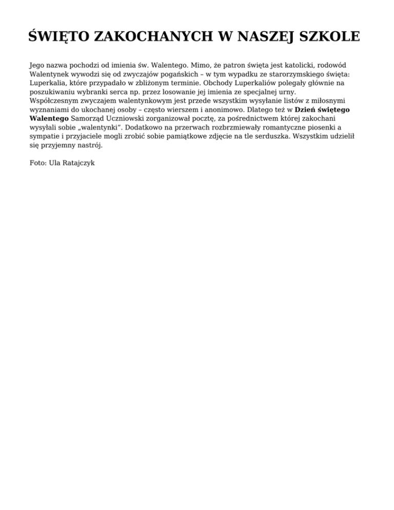 ŚWIĘTO ZAKOCHANYCH W NASZEJ SZKOLE Jego nazwa pochodzi od imienia św. Walentego. Mimo, że patron święta jest katolicki, rodowód Walentynek wywodzi się od zwyczajów pogańskich – w tym wypadku ze starorzymskiego święta: Luperkalia, które przypadało w zbliżonym terminie. Obchody Luperkaliów polegały głównie na poszukiwaniu wybranki serca np. przez losowanie jej imienia ze specjalnej urny. Współczesnym zwyczajem walentynkowym jest przede wszystkim wysyłanie listów z miłosnymi wyznaniami do ukochanej osoby – często wierszem i anonimowo. Dlatego też w Dzień świętego Walentego Samorząd Uczniowski zorganizował pocztę, za pośrednictwem której zakochani wysyłali sobie „walentynki”. Dodatkowo na przerwach rozbrzmiewały romantyczne piosenki a sympatie i przyjaciele mogli zrobić sobie pamiątkowe zdjęcie na tle serduszka. Wszystkim udzielił się przyjemny nastrój. Foto: Ula Ratajczyk