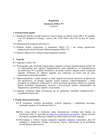 Regulamin Konkursu ESKA TV „Fejslista” 1. Postanowienia ogólne 1.1 Regulamin określa warunki konkursu rozgrywanego na antenie stacji ESKA TV zgodnie z art. 921 Kodeksu Cywilnego - ustawy z dn. 23.04.1964 r. (Dz.U.Nr 16, poz. 93 z późn. zm.) 1.2 Organizatorem konkursu jest Eska Tv. 1.3 Konkurs będzie rozgrywany w programie ESKA TV i ma zasięg ograniczony technicznymi możliwościami odbioru programu ESKA TV. 1.4 Konkurs odbywa się w dniach emisji programu Fejslista 2. Nagrody 2.1 Nagrody to: płyty CD 2.2 W przypadku, gdy uczestnik wygrał jedną z nagród o wartości przekraczającej kwotę 760 zł, zobowiązany jest zapłacić Organizatorowi (jako płatnikowi) za pośrednictwem zryczałtowany 10 % podatek dochodowy od pełnej wartości nagrody przed wydaniem nagrody. Podstawą do odbioru nagrody jest wpłacenie na konto lub do kasy Organizatora należnego podatku. 2.3 Odpowiedzialność z tytułu rękojmi za wady nagród rzeczowych spoczywa na Sponsorze lub sprzedawcy, od którego nagrody zostały kupione. Odpowiedzialność z tytułu gwarancji na podmiocie wskazanym w treści gwarancji (gwarant). Zdobywca nagrody będzie dochodził zaspokojenia roszczeń z powyższych tytułów bezpośrednio od Organizatora, sprzedawcy nagród i od gwaranta 2.4 Nagrody wydawane będą zwycięzcom tuż po spełnieniu warunków konkursowych i wypełnieniu Metryczki. 3. Zasady akcji promocyjnej 3.1 W programie Fejslista prowadzący wybiera najlepszy i najbardziej dowcipny komentarz dodany na Facebooku Eska Tv. 3.2 Aby wziąć udział w konkursie nalży skomentowac wybrany klip dodany na Facebooku Eska Tv pod adresem http://www.facebook.com/eskaTV. Należy również dowcipnie uzasadnić dlaczego właśnie tej osobie mamy przyznać nagrodę. 3.3 Prowadząca w trakcie trwania programu nagradza najlepsze komentarze płtą CD dostępną w konkurskie. Podaje zwycięzców, którzy zobowiazani są do przesłania swoich danych adresowych. 1 3.4 Wygrany po wyemitowaniu programu na antenie Eska Tv- każdy piątek 18.00, zobowiązany jest do odesłania swoich danych adresowych na [email protected] w ciągu 7 dni. 4. Wyłanianie zwycięzców 4.1 Zwycięzcą zostaje osoba, która wypełni zadania określone z punkcie 3 4.2 Jednej osobie może być przyznana tylko jedna nagroda, przez cały czas trwania akcji, niezależnie od ilości zgłoszeń. 4.3 Odbiór nagrody odbywa się poprzez wysłanie nagrody listownie po wcześniejszym otrzymaniu danych adresowych od zwycięzcy. 4.4 Zwycięzca konkursu jest zobowiązany w ciągu 7 dni od dnia otrzymania informacji o wygraniu nagrody, do przesłania danych adresowych na adres [email protected]. Nie dopełnienie obowiązku przesłania danych jest równoznaczne z rezygnacją z nagrody. 5. Ograniczenie uczestnictwa w akcji 5.1. W akcji promocyjnej nie mogą brać udziału pracownicy i stali współpracownicy spółek holdingu ZPR S.A. 5.2. Zakaz uczestnictwa w akcji promocyjnej dotyczy również członków najbliższej rodziny podmiotów wymienionych w pkt. 5.1 6. Postępowanie reklamacyjne 6.1. Wszelkie zastrzeżenia dotyczące przebiegu akcji, należy składać organizatorowi na piśmie w terminie nie dłuższym niż 14 dni roboczych od daty jego zakończenia. 6.2. W przypadku przesłania reklamacji złożonej za pośrednictwem poczty decyduje data stempla pocztowego. 6.3. Złożone przez uczestników reklamacje będą rozpatrywane przez Organizatora niezwłocznie, jednakże nie później niż w terminie 14 dni od daty złożenia reklamacji. 6.4. Zainteresowani uczestnicy zostaną powiadomieni o rozpatrzeniu reklamacji telefonicznie, najpóźniej w ciągu 14 dni od daty rozpatrzenia reklamacji na piśmie przez Organizatora. 7. Postanowienia końcowe 7.1. Przystąpienie do Konkursu oznacza, iż uczestnik zapoznał się z zasadami konkursu i akceptuje je w całości. 7.2. Pełna treść regulaminu udostępniona będzie do wglądu w siedzibie ESKA TV we Wrocławiu, od poniedziałku do piątku w czasie trwania akcji - w godzinach: 8:00 15:00. 2 7.3. Organizator zabawy nie ponosi odpowiedzialności za usługi telekomunikacyjne, z których korzystać będą uczestnicy akcji. 7.4. Time S.A. oraz Organizator zastrzegają sobie prawo wykorzystania danych osobowych uczestników akcji dla celów wyłącznie konkursowych, zgodnie z wymogami ustawowymi, na podstawie art.23 ust.1 pkt 3 i pkt. 5 w związku z art.43 ust 1 pkt 8 ustawy z dnia 29.08.1997 r o ochronie danych osobowych (Dz.U. Nr 133 z 1997 r, poz.883). 8. Jury 8.1. O uznaniu wygranej po spełnieniu wszystkich warunków konkursowych decyduje jury, w skład którego wchodzą: Przewodniczący - Kamil Wołkowski Wiceprzewodniczący - Adrian Harasim Sekretarz - Katarzyna Morawska 8.2. Werdykt jury jest werdyktem ostatecznym w zakresie wyników akcji. 8.3. Nad prawidłowością przebiegu akcji i pracy jury czuwają władze statutowe Organizatora. 8.4. Jury potwierdza zgodność przeprowadzenia akcji z regulaminem. 3 Załącznik nr 1 do regulaminu konkursu MERYCZKA UCZESTNIKA KONKURSU ESKI - potwierdzenie odbioru nagrody tytuł konkursu: „Fejslista” data ........../............/....................... Nagroda: ........................................ Imię i nazwisko ............................................................................................................................ nr PESEL lub nr i rodzaj dokumentu tożsamości ........................................................................ Przetwarzanie danych osobowych uczestników konkursu przez Organizatora do celów konkursowych, zgodnie z wymogami ustawowymi, ma miejsce na podstawie art. 23 ust. 1 pkt 3 w związku z art. 2 ust. 3 oraz art. 43 ust 1 pkt 8 ustawy z dnia 29.08.1997 r o ochronie danych osobowych (Dz.U. Nr 133 z 1997 r, poz .883 z późn. zm.). 4