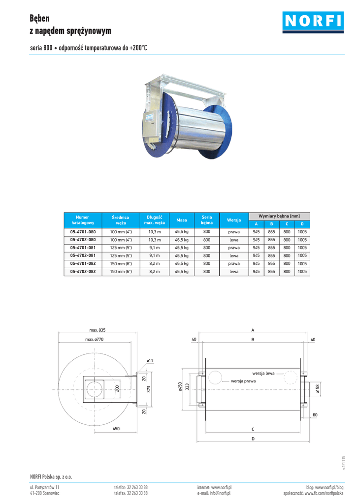 Bęben z napędem sprężynowym seria 800 • odporność temperaturowa do +200°C Wymiary bębna [mm] Numer katalogowy Średnica węża Długość max. węża Masa Seria bębna Wersja A B C D 05-4701-080 100 mm (4") 10,3 m 46,5 kg 800 prawa 945 865 800 1005 05-4702-080 100 mm (4") 10,3 m 46,5 kg 800 lewa 945 865 800 1005 05-4701-081 125 mm (5") 9,1 m 46,5 kg 800 prawa 945 865 800 1005 05-4702-081 125 mm (5") 9,1 m 46,5 kg 800 lewa 945 865 800 1005 05-4701-082 150 mm (6") 8,2 m 46,5 kg 800 prawa 945 865 800 1005 05-4702-082 150 mm (6") 8,2 m 46,5 kg 800 lewa 945 865 800 1005 A max. 835 max. ø770 40 B 40 ø11 ø158 333 ø450 373 20 200 20 wersja lewa wersja prawa 60 450 C v.1/1115 D NORFI Polska sp. z o.o. ul. Partyzantów 11 41-200 Sosnowiec telefon: 32 263 33 88 telefax: 32 263 33 88 internet: www.norfi.pl e-mail: info@norfi.pl blog: www.norfi.pl/blog społeczność: www.fb.com/norfipolska