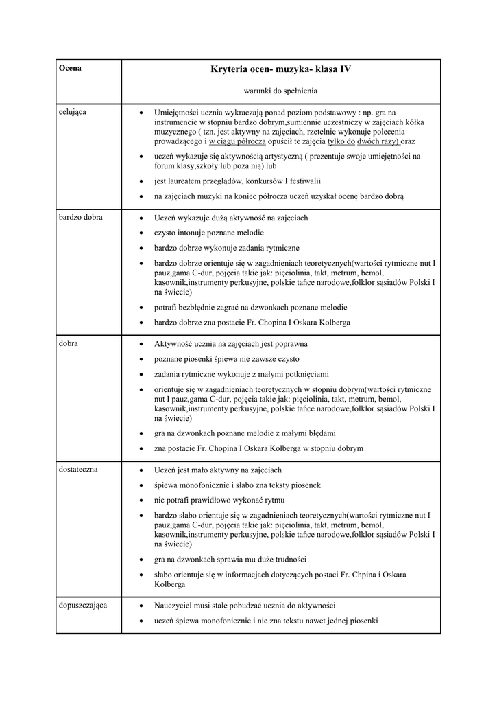Ocena Kryteria ocen- muzyka- klasa IV warunki do spełnienia celująca bardzo dobra dobra dostateczna dopuszczająca Umiejętności ucznia wykraczają ponad poziom podstawowy : np. gra na instrumencie w stopniu bardzo dobrym,sumiennie uczestniczy w zajęciach kółka muzycznego ( tzn. jest aktywny na zajęciach, rzetelnie wykonuje polecenia prowadzącego i w ciągu półrocza opuścił te zajęcia tylko do dwóch razy) oraz uczeń wykazuje się aktywnością artystyczną ( prezentuje swoje umiejętności na forum klasy,szkoły lub poza nią) lub jest laureatem przeglądów, konkursów I festiwalii na zajęciach muzyki na koniec półrocza uczeń uzyskał ocenę bardzo dobrą Uczeń wykazuje dużą aktywność na zajęciach czysto intonuje poznane melodie bardzo dobrze wykonuje zadania rytmiczne bardzo dobrze orientuje się w zagadnieniach teoretycznych(wartości rytmiczne nut I pauz,gama C-dur, pojęcia takie jak: pięciolinia, takt, metrum, bemol, kasownik,instrumenty perkusyjne, polskie tańce narodowe,folklor sąsiadów Polski I na świecie) potrafi bezbłędnie zagrać na dzwonkach poznane melodie bardzo dobrze zna postacie Fr. Chopina I Oskara Kolberga Aktywność ucznia na zajęciach jest poprawna poznane piosenki śpiewa nie zawsze czysto zadania rytmiczne wykonuje z małymi potknięciami orientuje się w zagadnieniach teoretycznych w stopniu dobrym(wartości rytmiczne nut I pauz,gama C-dur, pojęcia takie jak: pięciolinia, takt, metrum, bemol, kasownik,instrumenty perkusyjne, polskie tańce narodowe,folklor sąsiadów Polski I na świecie) gra na dzwonkach poznane melodie z małymi błędami zna postacie Fr. Chopina I Oskara Kolberga w stopniu dobrym Uczeń jest mało aktywny na zajęciach śpiewa monofonicznie i słabo zna teksty piosenek nie potrafi prawidłowo wykonać rytmu bardzo słabo orientuje się w zagadnieniach teoretycznych(wartości rytmiczne nut I pauz,gama C-dur, pojęcia takie jak: pięciolinia, takt, metrum, bemol, kasownik,instrumenty perkusyjne, polskie tańce narodowe,folklor sąsiadów Polski I na świecie) gra na dzwonkach sprawia mu duże trudności słabo orientuje się w informacjach dotyczących postaci Fr. Chpina i Oskara Kolberga Nauczyciel musi stale pobudzać ucznia do aktywności uczeń śpiewa monofonicznie i nie zna tekstu nawet jednej piosenki niedostateczna zadania rytmiczne uczeń wykonuje z bardzo dużą pomocą nauczyciela posiada minimalny zasób wiedzy teoretycznej(wartości rytmiczne nut I pauz,gama C-dur, pojęcia takie jak: pięciolinia, takt, metrum, bemol, kasownik,instrumenty perkusyjne, polskie tańce narodowe,folklor sąsiadów Polski I na świecie) nie potrafi zagrać na dzwonkach nawet jednej melodii bardzo słabo zna informacje dotyczące sylwetek Fr. Chopina I Oskara Kolberga Uczeń przejawia lekceważący stosunek do przedmiotu nie zna żadnej piosenki nie chce wykonać żadnego zadania rytmicznego nie potrafi zaprezentować na dzwonkach żadnej melodii nie zna nawet minimum z wiedzy teoretycznej(wartości rytmiczne nut I pauz,gama C-dur, pojęcia takie jak: pięciolinia, takt, metrum, bemol, kasownik,instrumenty perkusyjne, polskie tańce narodowe,folklor sąsiadów Polski I na świecie) nie zna informacji dotyczących postaci Fr. Chopina i Oskara Kolberga Ocena Kryteria ocen- muzyka- klasa V warunki do spełnienia celująca bardzo dobra dobra Umiejętności ucznia wykraczają ponad poziom podstawowy : np. gra na instrumencie w stopniu bardzo dobrym,sumiennie uczestniczy w zajęciach kółka muzycznego ( tzn. jest aktywny na zajęciach, rzetelnie wykonuje polecenia prowadzącego i w ciągu półrocza opuścił te zajęcia tylko do dwóch razy) oraz uczeń wykazuje się aktywnością artystyczną ( prezentuje swoje umiejętności na forum klasy,szkoły lub poza nią) lub jest laureatem przeglądów, konkursów I festiwalii na zajęciach muzyki na koniec półrocza uczeń uzyskał ocenę bardzo dobrą Uczeń wykazuje dużą aktywność na zajęciach czysto intonuje poznane melodie bardzo dobrze wykonuje zadania rytmiczne bardzo dobrze orientuje się w zagadnieniach teoretycznych(wartości rytmiczne nut I pauz – kropka przy nucie,gama C-dur, pojęcia takie jak: akompaniament, dynamika, barwa dżwięku,tempo, artykulacja, forma ABA, ABA1, kanon) potrafi bezbłędnie zagrać na dzwonkach poznane melodie bardzo dobrze zna postacie Fr. Chopina I St. Moniuszko Aktywność ucznia na zajęciach jest poprawna dostateczna dopuszczająca niedostateczna poznane piosenki śpiewa nie zawsze czysto zadania rytmiczne wykonuje z małymi potknięciami orientuje się w zagadnieniach teoretycznych w stopniu dobrym(wartości rytmiczne nut I pauz – kropka przy nucie,gama C-dur, pojęcia takie jak: akompaniament, dynamika, barwa dżwięku,tempo, artykulacja, forma ABA, ABA1, kanon) gra na dzwonkach poznane melodie z małymi błędami zna postacie Fr. Chopina I St. Moniuszko w stopniu dobrym Uczeń jest mało aktywny na zajęciach śpiewa monofonicznie i słabo zna teksty piosenek nie potrafi prawidłowo wykonać rytmu bardzo słabo orientuje się w zagadnieniach teoretycznych(wartości rytmiczne nut I pauz – kropka przy nucie,gama C-dur, pojęcia takie jak: akompaniament, dynamika, barwa dżwięku,tempo, artykulacja, forma ABA, ABA1, kanon) gra na dzwonkach sprawia mu duże trudności słabo orientuje się w informacjach dotyczących postaci Fr. Chpina i St. Moniuszko Nauczyciel musi stale pobudzać ucznia do aktywności uczeń śpiewa monofonicznie i nie zna tekstu nawet jednej piosenki zadania rytmiczne uczeń wykonuje z bardzo dużą pomocą nauczyciela posiada minimalny zasób wiedzy teoretycznej(wartości rytmiczne nut I pauz – kropka przy nucie,gama C-dur, pojęcia takie jak: akompaniament, dynamika, barwa dżwięku,tempo, artykulacja, forma ABA, ABA1, kanon) nie potrafi zagrać na dzwonkach nawet jednej melodii bardzo słabo zna informacje dotyczące sylwetek Fr. Chopina I St. Moniuszko Uczeń przejawia lekceważący stosunek do przedm