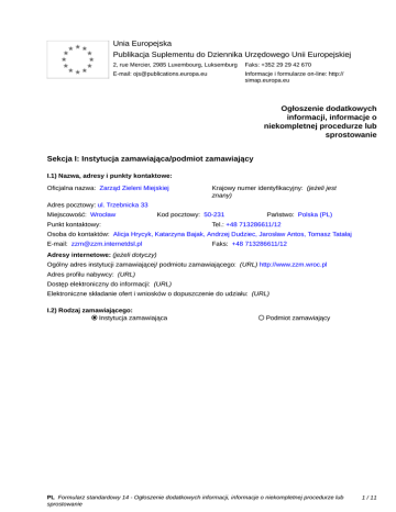 Unia Europejska Publikacja Suplementu do Dziennika Urzędowego Unii Europejskiej 2, rue Mercier, 2985 Luxembourg, Luksemburg Faks: +352 29 29 42 670 E-mail: [email protected] Informacje i formularze on-line: http:// simap.europa.eu Ogłoszenie dodatkowych informacji, informacje o niekompletnej procedurze lub sprostowanie Sekcja I: Instytucja zamawiająca/podmiot zamawiający I.1) Nazwa, adresy i punkty kontaktowe: Oficjalna nazwa: Zarząd Zieleni Miejskiej Krajowy numer identyfikacyjny: (jeżeli jest znany) _____ Adres pocztowy: ul. Trzebnicka 33 Miejscowość: Wrocław Kod pocztowy: 50-231 Punkt kontaktowy: _____ Państwo: Polska (PL) Tel.: +48 713286611/12 Osoba do kontaktów: Alicja Hrycyk, Katarzyna Bajak, Andrzej Dudziec, Jarosław Antos, Tomasz Tatałaj E-mail: [email protected] Faks: +48 713286611/12 Adresy internetowe: (jeżeli dotyczy) Ogólny adres instytucji zamawiającej/ podmiotu zamawiającego: (URL) http://www.zzm.wroc.pl Adres profilu nabywcy: (URL) _____ Dostęp elektroniczny do informacji: (URL) _____ Elektroniczne składanie ofert i wniosków o dopuszczenie do udziału: (URL) _____ I.2) Rodzaj zamawiającego: Instytucja zamawiająca Podmiot zamawiający PL Formularz standardowy 14 - Ogłoszenie dodatkowych informacji, informacje o niekompletnej procedurze lub sprostowanie 1 / 11 Sekcja II: Przedmiot zamówienia II.1.1) Nazwa nadana zamówieniu: Konserwacja otwartych i zarurowanych rowów melioracyjnych na terenie miasta Wrocławia II.1.2) Krótki opis zamówienia lub zakupu: (podano w pierwotnym ogłoszeniu) 1)Przedmiot zamówienia podzielony jest na trzy Zadania: ZADANIE A - dotyczy rowów w rejonach Krzyki, Śródmieście i Stare Miasto ZADANIE B – dotyczy rowów w rejonie Fabryczna ZADANIE C – dotyczy rowów w rejonie Psie Pole 2)Zakres zadania: -Wykoszenie porostów ręcznie ze skarp rowów, koron i skarp nasypów; porost gęsty twardy. (Zał. nr 6 a,b,c, Lp.1 ) Koszenie traw i porostów wraz z wygrabieniem i złożeniem w kopki lub załadowaniem na przyczepę. -Wydobycie z dna cieku roślin korzeniących się przy zarośnięciu do 30%. (Zał. nr 6 a,b,c, Lp.2 ) Wydobycie z dna cieku roślinności z wygrabieniem i złożeniem w kopki lub załadowaniem na przyczepę. -Wydobycie kożucha roślin pływających przy głębokości cieku do 1 m. (Zał. nr 6 a,b,c, Lp.3 ) Wydobycie kożucha roślin pływających z wyrzuceniem na pobocze. -Wykoszenie porostów ręcznie z dna cieku; porost gęsty twardy. (Zał. nr 6 a,b,c, Lp.4 ) Koszenie porostów wraz z wygrabieniem i złożeniem w kopki lub załadowaniem na przyczepę. -Ręczne usuwanie namułu z cieków o gł. 1,5 m i szer. dna od 0,4 do 2,3 m i zamuleniu od 0,2 – 0,4 m. (Zał. nr 6 a,b,c, Lp. 5-17) Wydobycie namułu z cieku z wyrzuceniem na pobocze lub na uszkodzone skarpy. Rozplantowanie lub ubicie namułu z profilowaniem skarp. Oczyszczenie pasów o szerokości 0,60 m wzdłuż krawędzi cieku i wykonanie bruzd spływowych. -Ręczne usuwanie namułu z przepustów. (Zał. nr 6 a,b,c, Lp.18-24 ) Wydobycie namułu z przewodu przepustu. Przerzucenie namułu poza trasę rowu i rozplantowanie. -Czyszczenie rurociągów drenarskich śr. 5-20 cm drutem w gruncie kategorii II-III. (Zał. nr 6 a,b,c, Lp.25-27) Wykonanie odkrywek penetracyjnych i wyznaczenie trasy istniejącego rurociągu. Wykonanie odkrywek roboczych. Wyjęcie rurek z odkrywek i oczyszczenie ich z namułu i korzeni. Oczyszczenie rurociągu między odkrywkami przez przeciągnięcie drutem. Oczyszczenie dna w odkrywkach i ułożenie rurek drenarskich. Przykrycie rurek ziemią urodzajną i zasypanie odkrywek. - Oczyszczenie studzienek drenarskich z namułu. (Zał. nr 6 a,b,c, Lp.28) Zdjęcie pokrywy studzienki. Wydobycie namułu ze studzienki. Rozplantowanie wydobytego namułu. Ponowne założenie pokrywy. Wytyczenie i wykonanie rowków penetracyjnych. Odkopanie studzienki w przypadku jej zasypania. - Remont przepustów o śr. 0,6 m z przyczółkami z darniny. (Zał. nr 6 a,b,c, Lp.29) Odkopanie rurociągu i usunięcie zniszczonych rur. Wyrównanie podłoża i wykonanie podsypki z ręcznym ubiciem. Ułożenie rur z uszczelnieniem podwójną warstwą papy na lepiku i zaprawą cementową. Izolacja rurociągu przez dwukrotne posmarowanie lepikiem. Obsypanie przewodu ziemią z ręcznym ubiciem i uformowaniem nawierzchni przejazdowej z pospółki z ubiciem. -Naprawa skarp rowów i nasypów przez darniowanie na płask z przybiciem kołkami. (Zał. nr 6 a,b,c, Lp.30) Odspojenie i przemieszczenie ziemi na skarpę. Ubicie odspojonej ziemi warstwami grubości 20 cm ubijakami ręcznymi. Zwilżenie wodą warstwy zagęszczonej. Wycięcie, dostarczenie i ułożenie darniny. Ścięcie wypukłości i zasypanie wgłębień na skarpach i terenie z ubiciem. -Odspojenie gruntu i przewóz taczkami na odległość do 10 m, gr. kat. III. (Zał. nr 6 a,b,c, Lp.31) Odspojenie i załadowanie urobku na taczki. Przewiezienie i wyładowanie urobku. Ułożenie i przekładanie torów jezdnych. PL Formularz standardowy 14 - Ogłoszenie dodatkowych informacji, informacje o niekompletnej procedurze lub sprostowanie 2 / 11 -Plantowanie powierzchni skarp, dna i korony stałych przekopów, wykopów i nasypów (obrobienie na czysto). (Zał. nr 6 a,b,c, Lp.32) Przekopanie rowków kierunkowych na skarpach wykopów o szerokości do 5 m lub podsypanie ścieżek na plantowanych skarpach nasypów ze sprawdzeniem trójkątem skarpiarskim lub łatą. Ścinanie łopatą lub oskardem wypukłości między rowkami na skarpach wykopów i odrzucenie ziemi na pobocze lub do podstawy skarpy. Ścinanie wypukłości oraz zasypanie wgłębień między ścieżkami na skarpach nasypów o szerokości do 5 m z ubiciem powierzchni plantowanej skarpy. -Roboty ziemne wykonywane koparkami przedsiębiernymi z transportem urobku samochodami samowyładowczymi na odległość do 1 km. (Zał. nr 6 a,b,c, Lp.33) Wykonanie koparką początkowego wykopu (wcinki) na odkład. Odspojenie i załadowanie ziemi koparką na samochody. Z