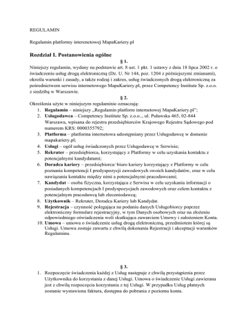 REGULAMIN Regulamin platformy interenetowej MapaKariery.pl Rozdział I. Postanowienia ogólne § 1. Niniejszy regulamin, wydany na podstawie art. 8 ust. 1 pkt. 1 ustawy z dnia 18 lipca 2002 r. o świadczeniu usług drogą elektroniczną (Dz. U. Nr 144, poz. 1204 z późniejszymi zmianami), określa warunki i zasady, a także rodzaj i zakres, usług świadczonych drogą elektroniczną za pośrednictwem serwisu internetowego MapaKariery.pl, przez Competency Institute Sp. z.o.o. z siedzibą w Warszawie. § 2. Określenia użyte w niniejszym regulaminie oznaczają: 1. Regulamin – niniejszy „Regulamin platform internetowej MapaKariery.pl”; 2. Usługodawca – Competency Institute Sp. z.o.o.., ul. Puławska 465, 02-844 Warszawa, wpisana do rejestru przedsiębiorców Krajowego Rejestru Sądowego pod numerem KRS: 0000355792; 3. Platforma – platforma internetowa udostępniany przez Usługodawcę w domenie mapakariery.pl; 4. Usługi – ogół usług świadczonych przez Usługodawcę w Serwisie; 5. Rekruter – przedsiębiorca, korzystający z Platformy w celu uzyskania kontaktu z potencjalnymi kandydatami; 6. Doradca kariery – przedsiębiorca/ biuro kariery korzystający z Platformy w celu poznania kompetencji I predyspozycji zawodowych swoich kandydatów, oraz w celu nawiązania kontaktu między nimi a potencjalnymi pracodawcami; 7. Kandydat – osoba fizyczna, korzystająca z Serwisu w celu uzyskania informacji o posiadanych kompetencjach I predyspozycjach zawodowych oraz celem kontaktu z potencjalnym pracodawcą lub zleceniodawcą; 8. Użytkownik – Rekruter, Doradca Kariery lub Kandydat. 9. Rejestracja – czynność polegająca na podaniu danych Usługobiorcy poprzez elektroniczny formularz rejestracyjny, w tym Danych osobowych oraz na złożeniu odpowiedniego oświadczenia woli skutkująca zawarciem Umowy i założeniem Konta. 10. Umowa – umowa o świadczenie usług drogą elektroniczną, przedmiotem której są Usługi. Umowa zostaje zawarta z chwilą dokonania Rejestracji i akceptacji warunków Regulaminu. § 3. 1. Rozpoczęcie świadczenia każdej z Usług następuje z chwilą przystąpienia przez Użytkownika do korzystania z danej Usługi. Umowa o świadczenie Usługi zawierana jest z chwilą rozpoczęcia korzystania z tej Usługi. W przypadku Usług płatnych zostanie wystawiona faktura, dostępna do pobrania z poziomu konta. 2. Umowy o świadczenie poszczególnych Usług zawierane są niezależnie od siebie. Użytkownik samodzielnie wybiera Usługi, z których chce korzystać. 3. Rozwiązanie umowy o świadczenie Usługi następuje z chwilą zakończenia korzystania z tej Usługi przez Użytkownika. Rozdział II. Rodzaje i zakres Usług § 1. Usługodawca świadczy na Platformie następujące Usługi na rzecz Użytkowników: 1. Udostępnienie pełnych charakterystyk zawodowych w zakresie wykonywanych zadań, oczekiwanych kompetencji i predyspozycji, wymogów formalnych 2. Umożliwienie dostępu do ofert pracy i stażu umieszczanych na Platformie, w tym wyszukiwania i sortowania tych ofert; 3. Udostępnienie profile przedsiębiorstw, o których informacje zostały umieszczone w Platformie. § 2. Usługodawca świadczy na Platformie następujące Usługi na rzecz Kandydatów: 1. Umożliwienie wprowadzenia CV i innych danych dotyczących Kandydata w celu przetwarzania ich przez Usługodawcę oraz w celu udostępniania ich Pracodawcom; 2. Umożliwienie dostępu do opracowanych testów kompetencji i predyspozycji zawdowych 3. Umożliwienie dostępu do wskazówek rozwojowych i rekomendowanych szkoleń 4. Udostępnienie pełnych charakterystyk zawodowych w zakresie wykonywanych zadań, oczekiwanych kompetencji i predyspozycji, wymogów formalnych 5. Subskrypcję stanowisk, polegającą na cyklicznym informowaniu Kandydata o ofertach pracy umieszczonych na Platformie, odpowiadających uprzednio zdefiniowanym przez Kandydata kryteriom wyboru; 6. Umożliwienie aplikowania na stanowiska pracy, których dotyczą ogłoszenia o pracy zamieszczone na Platformie, poprzez przesłanie aplikacji Kandydata do Pracodawcy. § 3. Usługodawca świadczy na Platformie następujące Usługi na rzecz Rekruterów: 1. Umieszczanie na Platformie ogłoszeń o pracy i stażu, dostarczonych przez Pracodawcę; 2. Udostępnienie możliwości otrzymywania aplikacji o pracę od Kandydatów zainteresowanych ogłoszeniem o pracy oraz innych Kandydatów, zainteresowanych kategorią danego stanowiska; 3. Zarządzanie procesami rekrutacji i aplikacjami Kandydatów 4. Udostępnienie katalogu Kandydatów, którzy zgłosili się do ofert potencjalnego pracodawcy § 4. Usługodawca świadczy w Serwisie następujące Usługi na rzecz Doradów Kariery: 1. Dodanie swojej bazy kandydatów do Platformy 2. Udostępnienie wszystkich świadczeń Kandydata dla dodanej bazy 3. Zarządzanie procesami rekrutacji i aplikacjami Kandydatów 4. Dostęp do raportów Kandydatów Rozdział III. Warunki świadczenia Usług 1. 2. 3. 4. 5. 1. 2. 3. 4. § 1. Korzystanie z części Usług wymaga posiadania przez Użytkownika konta w Platformie. Korzystanie z Usług Serwisu możliwe jest wyłącznie po dokonaniu Rejestracji, która dokonywana jest poprzez wypełnienie Formularza Rejestracyjnego dostępnego na stronie Serwisu. Z chwilą zakończenia Rejestracji pomiędzy Stronami zostaje zawarta Umowa na czas nieoznaczony. Rejestracja konta Kandydata na Platofrmie jest bezpłatna, dla pozostałych stron rejestracja równoznaczna jest z zakupem abonamentu Rejestrując konto w Serwisie, Użytkownik akceptuje niniejszy Regulamin. § 2. Użytkownik może w dowolnej chwili zażądać usunięcia jego konta w Serwisie, poprzez kontakt z administratorem Platformy lub [email protected]. Żądanie usunięcia konta Użytkownika jest równoznaczne z żądaniem usunięcia wszystkich danych powiązanych z tym kontem, zgromadzonych na Platformie. Żądanie usunięcia konta Użytkownika jest równoznaczne z rezygnacją z dalszego korzystania z Usług, co do