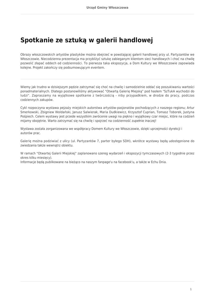Urząd Gminy Włoszczowa Spotkanie ze sztuką w galerii handlowej Obrazy włoszczowskich artystów plastyków można obejrzeć w powstającej galerii handlowej przy ul. Partyzantów we Włoszczowie. Niecodzienna prezentacja ma przybliżyć sztukę zabieganym klientom sieci handlowych i choć na chwilę pozwolić złapać oddech od codzienności. To pierwsza taka ekspozycja, a Dom Kultury we Włoszczowie zapowiada kolejne. Projekt zakończy się podsumowującym eventem. Wiemy jak trudno w dzisiejszym pędzie zatrzymać się choć na chwilę i samodzielnie oddać się poszukiwaniu wartości ponadmaterialnych. Dlatego postanowiliśmy aktywować "Otwartą Galerię Miejską" pod hasłem "SzTukA wychodzi do ludzi". Zapraszamy na wyjątkowe spotkanie z twórczością - niby przypadkiem, w drodze do pracy, podczas codziennych zakupów. Cykl rozpoczyna wystawa pejzaży miejskich autorstwa artystów-pasjonatów pochodzących z naszego regionu; Artur Smerkowski, Zbigniew Woldański, Janusz Salwierak, Maria Dudkiewicz, Krzysztof Cuprian, Tomasz Toborek, Justyna Pośpiech. Celem wystawy jest przede wszystkim zwrócenie uwagi na piękno i wyjątkowy czar miejsc, które na codzień mijamy obojętnie. Warto zatrzymać się na chwilę i spojrzeć na codzienność zupełnie inaczej! Wystawa została zorganizowana we współpracy Domem Kultury we Włoszczowie, dzięki uprzejmości dyrekcji i autorów prac. Galerię można podziwiać z ulicy (ul. Partyzantów 7, parter byłego SDH), wkrótce wystawy będą udostępnione do zwiedzania także wewnątrz obiektu. W ramach "Otwartej Galerii Miejskiej" zaplanowano szereg wydarzeń i ekspozycji tymczasowych (2-3 tygodnie przez okres kilku miesięcy). Informacje będą publikowane na bieżąco na naszym fanpage'u na facebook'u, a także w Echu Dnia. 1