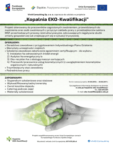 Vivid Consulting Sp. z o. o. zaprasza do udziału w projekcie „Kopalnia EKO-Kwalifikacji” Projekt skierowany do pracowników zagrożonych zwolnieniem, przewidzianych do zwolnienia oraz osób zwolnionych z przyczyn zakładu pracy z przedsiębiorstw sektora MŚP, przechodzących procesy restrukturyzacyjne, odczuwających negatywne skutki zmiany gospodarczej lub znajdujących się w sytuacji kryzysowej. OFERUJEMY: » Doradztwo zawodowe z przygotowaniem Indywidualnego Planu Działania » Warsztaty umiejętności miękkich » Szkolenia zawodowe zakończone egzaminem certyfikującym - do wyboru: 1) Instalator/ka odnawialnych źródeł energii 2) Audytor/ka energetyczny/a 3) Eko-recykler/ka z obsługą maszyn sortujących 4) Pracownik/pracownica usług kosmetycznych (z uwzględnieniem kosmetyków organicznych i naturalnych) » Trzymiesięczny staż zawodowy » Pośrednictwo pracy ZAPEWNIAMY: » Stypendium szkoleniowe oraz stażowe » Wykwalifikowaną kadrę trenerską » Zwrot kosztów dojazdu » Catering podczas zajęć » Materiały szkoleniowe Termin realizacji projektu: 01.09.2016 r. - 30.06.2017 r. Szczegółowe informację dostępne na stronie: vc.edu.pl/kopalnia-eko-kwalifikacji/ Tel.: 533 314 811 E-mail: [email protected] Projekt współfinansowany przez Unię Europejskąw ramach Europejskiego Funduszu Społecznego. Wysokość wkładu Unii Europejskiej: 817 675,56 zł