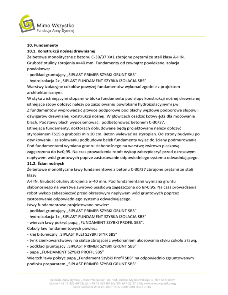 10. Fundamenty 10.1. Konstrukcji nośnej drewnianej Żelbetowe monolityczne z betonu C-30/37 XA1 zbrojone prętami ze stali klasy A-IIIN. Grubośd otuliny zbrojenia a=40 mm. Fundamenty od zewnątrz powlekane izolacja powłokową: - podkład gruntujący „SIPLAST PRIMER SZYBKI GRUNT SBS” - hydroizolacja 2x „SIPLAST FUNDAMENT SZYBKA IZOLACJA SBS” Warstwy izolacyjne cokołów powyżej fundamentów wykonad zgodnie z projektem architektonicznym. W styku z istniejącymi stopami w bloku fundamentu pod słupy konstrukcji nośnej drewnianej istniejące stopy obłożyd należy po zaizolowaniu powłokami hydroizolacyjnymi j.w. Z fundamentów wyprowadzid głowice podporowe pod blachy węzłowe podporowe słupów i dźwigarów drewnianej konstrukcji nośnej. W głowicach osadzid kotwy 32 dla mocowania blach. Podstawy blach wypoziomowad i podbetonowad betonem C-30/37. Istniejące fundamenty, doktórach dobudowane będą projektowane należy obłożyd styropianem FS15 o grubości min 10 cm. Beton wylewad na styropian. Od strony budynku po otynkowaniu i zaizolowaniu podbudowy belek fundamenty wylad do ściany podmurowania. Pod fundamentami wymiana gruntu słabonośnego na warstwę żwirowo piaskową zagęszczona do Is>0,95. Na czas prowadzenia robót wykop zabezpieczyd przed okresowym napływem wód gruntowych poprze zastosowanie odpowiedniego systemu odwadniającego. 11.2. Ścian nośnych Żelbetowe monolityczne ławy fundamentowe z betonu C-30/37 zbrojone prętami ze stali klasy A-IIIN. Grubośd otuliny zbrojenia a=40 mm. Pod fundamentami wymiana gruntu słabonośnego na warstwę żwirowo piaskową zagęszczona do Is>0,95. Na czas prowadzenia robót wykop zabezpieczyd przed okresowym napływem wód gruntowych poprzez zastosowanie odpowiedniego systemu odwadniającego. Ławy fundamentowe projektowane powlec: - podkład gruntujący „SIPLAST PRIMER SZYBKI GRUNT SBS” - hydroizolacja 1x „SIPLAST FUNDAMENT SZYBKA IZOLACJA SBS” - wierzch ławy pokryd papą „FUNDAMENT SZYBKI PROFIL SBS”. Cokoły ław fundamentowych powlec: - klej bitumiczny „SIPLAST KLEJ SZYBKI STYK SBS” - tynk cienkowarstwowy na siatce zbrojącej z wykonaniem ukosowania styku cokołu z ławą, - podkład gruntujący „SIPLAST PRIMER SZYBKI GRUNT SBS” - papa „FUNDAMENT SZYBKI PROFIL SBS” Wierzch ławy pokryd papą „Fundament Szybki Profil SBS” na odpowiednio zgruntowanym podłożu preparatem „SIPLAST PRIMER SZYBKI GRUNT SBS”. 12.3. Urządzeo wentylacyjno klimatyzacyjnych i agregatu. Fundamenty blokowe, żelbetowe monolityczne z betonu C-30/37 zbrojone prętami ze stali klasy A-IIIN. Grubośd otuliny zbrojenia a=40 mm. Fundamenty od zewnątrz powlekane izolacja powłokową jak w p.10.1. Pod fundamentami wymiana gruntu słabonośnego na warstwę żwirowo piaskową zagęszczona do Is>0,95 j.w. Pod fundamentem hydroizolacja z dwóch warstw papy asfaltowej zgrzewalnej układanej na warwie betonu wyrównawczego z betonu C-16/20
