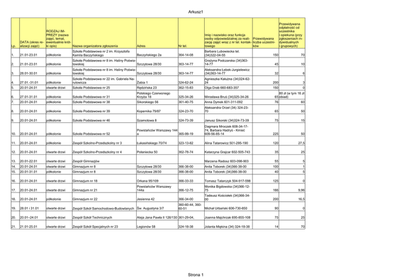 Arkusz1 Lp. 1. 2. 3. RODZAJ IMPREZY (nazwa zajęć, temat, DATA (okres re- ewentualnie krótNazwa organizatora zgłoszenia alizacji zajęć) ki opis) 21.01-23.01 21.01-23.01 28.01-30.01 Przewidywana odpłatność od uczestnika i opiekuna (przy zgłoszeniach indywidualnych i grupowych) Adres Nr tel. Imię i nazwisko oraz funkcja osoby odpowiedzialnej za reali- Przewidywana zację zajęć wraz z nr tel. kontak- liczba uczestnitowego ków Baczyńskiego 2a 364-14-08 Barbara Lubowiecka tel. (34)322-04-55 150 70 363-14-77 Grażyna Podczarska (34)36314-77 45 10 półkolonie Szkoła Podstawowa nr 2 im. Krzysztofa Kamila Baczyńskiego półkolonie Szkoła Podstawowa nr 8 im. Haliny PoświaSzczytowa 28/30 towskiej półkolonie Szkoła Podstawowa nr 8 im. Haliny PoświaSzczytowa 28/30 towskiej 363-14-77 Aleksandra Łebek-Jurgielewicz (34)363-14-77 32 6 324-62-24 Agnieszka Kałużna (34)324-6224 200 3 362-15-83 Olga Drab 660-683-357 150 0 4. 27.01.-31.01 półkolonie Szkoła Podstawowa nr 22 im. Gabriela NaŻabia 1 rutowicza 5. 20.01-24.01 otwarte drzwi Szkoła Podstawowa nr 25 Rędzińska 23 325-34-26 Mirosława Bruś (34)325-34-26 80 zł (w tym 16 zł 65 obiad) 361-40-75 Anna Dymek 601-311-092 76 60 65 50 6. 27.01-31.01 półkolonie Szkoła Podstawowa nr 31 Polskiego Czerwonego Krzyża 18 7. 20.01-24.01 półkolonie Szkoła Podstawowa nr 38 Sikorskiego 56 8. 20.01-24.01 półkolonie Szkoła Podstawowa nr 39 Kopernika 79/87 324-23-70 Aleksandra Orzeł (34) 324-2370 9. 20.01-24.01 półkolonie Szkoła Podstawowa nr 46 Szamotowa 8 324-73-39 Janusz Sikorski (34)324-73-39 75 15 225 50 120 27,5 35 25 10. 20.01-24.01 półkolonie Szkoła Podstawowa nr 52 Powstańców Warszawy 144 365-99-19 a Dagmara Mroczek 608-34-1774, Barbara Hadryś - Kmieć 609-56-85-14 11. 20.01-24.01 półkolonie Zespół Szkolno-Przedszkolny nr 3 Łukasińskiego 70/74 323-13-82 Alina Tatarowicz 501-295-190 12. 20.01-24.01 otwarte drzwi Zespół Szkolno-Przedszkolny nr 4 Połaniecka 50 362-78-74 Katarzyna Grajcar 602-505-743 13. 20.01-22.01 otwarte drzwi Zespół Gimnazjów 55 5 14. 20.01-24.01 otwarte drzwi Gimnazjum nr 8 Szczytowa 28/30 366-38-00 Anita Toborek (34)366-38-00 100 1 15. 20.01-31.01 półkolonie Gimnazjum nr 8 Szczytowa 28/30 366-38-00 Anita Toborek (34)366-38-00 40 5 16. 20.01-24.01 otwarte drzwi Gimnazjum nr 18 Orkana 95/109 366-33-33 Tomasz Tatarczyk 504-917-598 125 0 Gimnazjum nr 21 Powstańców Warszawy 144a 366-12-75 Monika Bigdowska (34)366-1275 166 9,96 366-34-00 Tadeusz Kościołek (34)366-3400 200 16,5 90 0 17. 18. 20.01-24.01 20.01-24.01 otwarte drzwi półkolonie Gimnazjum nr 22 Marzena Radosz 603-098-903 Jesienna 42 360-60-44, 360Michał Urbański 606-730-850 60-51 19. 28.01 i 31.01 otwarte drzwi Zespół Szkół Samochodowo-Budowlanych Św. Augustyna 3/7 20. 20.01–24.01 otwarte drzwi Zespół Szkół Technicznych Aleja Jana Pawła II 126/130 361-29-04, Joanna Majchrzak 695-855-108 75 25 21. 21.01-25.01 otwarte drzwi Zespół Szkół Specjalnych nr 23 Legionów 58 Jolanta Miękina (34) 324-18-38 14 70 324-18-38 Strona 1