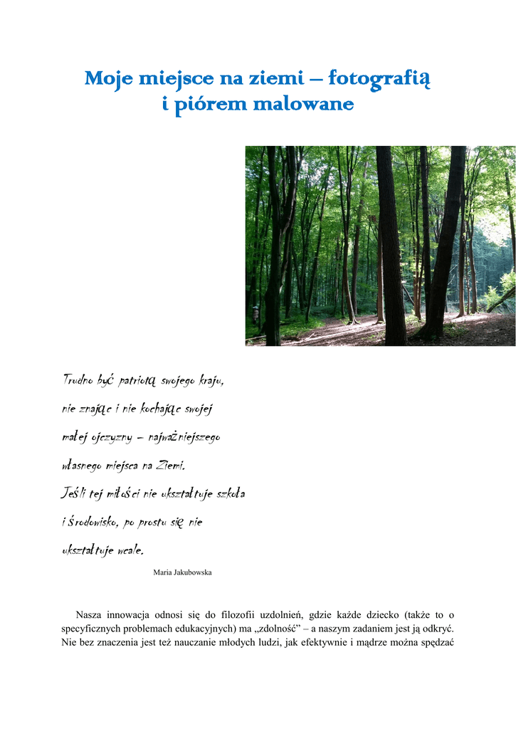 Moje miejsce na ziemi – fotografią i piórem malowane Trudno być patriotą swojego kraju, nie znając i nie kochając swojej małej ojczyzny – najważniejszego własnego miejsca na Ziemi. Jeśli tej miłości nie ukształtuje szkoła i środowisko, po prostu się nie ukształtuje wcale. Maria Jakubowska Nasza innowacja odnosi się do filozofii uzdolnień, gdzie każde dziecko (także to o specyficznych problemach edukacyjnych) ma „zdolność” – a naszym zadaniem jest ją odkryć. Nie bez znaczenia jest też nauczanie młodych ludzi, jak efektywnie i mądrze można spędzać czas pasjonując się fotografią, przyrodą i plastyką, a przez to i tworzeniem własnych wytworów literackich. Chcemy otworzyć oczy i umysły dzieci na otaczający ich świat. Często słyszymy „Cudze chwalicie, swego nie znacie”. Wydaje się to aktualne również w odniesieniu do naszych uczniów. Pragniemy poprzez innowację zachęcić młodzież do poznania i dostrzeżenia piękna krajobrazu najbliższej okolicy oraz jej walorów turystycznych i krajoznawczych, a poprzez to do aktywności ruchowej. Jest wiele zakątków na świecie, które uznawane są za piękne i godne poznania - My też nie mamy się czego wstydzić! Na zajęciach, w szkole uczniowie będą tworzyć różnorodne formy wypowiedzi o praktycznym charakterze oraz prace plastyczne. Formy wypowiedzi będą stymulowane różnymi sytuacjami, z jakimi uczniowie będą mieli do czynienia: sprawozdanie z wycieczki, reklama „mojego miejsca na ziemi”, twórczego opowiadania itp., zaś tłem zarówno wypowiedzi pisemnych jak i twórczości plastycznej i fotograficznej – walory krajoznawcze i turystyczne naszego regionu. Innowacja ta ma służyć inspirowaniu ucznia do bycia kreatywnym, do tworzenia własnych, dobrych tekstów i prac, które będą się nadawały do publikacji i prezentacji. Innowacja przeprowadzana będzie na dodatkowych zajęciach, prowadzonych w poszczególnych podzespołach, w szkole i poza nią, w terenie, także poza systemem klasowolekcyjnym. Zapraszamy na bloga prezentującego prace uczniów: http://kreatywnie2016-2017.blogspot.com/ Z pewnością, w miarę tworzenia się nowych pomysłów będziemy go tworzyli wspólnie z uczniami biorącymi udział w innowacji. Serdecznie zapraszamy Was do współpracy! Autorzy innowacji: Agnieszka Kochanik, Mariola Zając