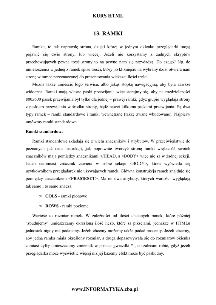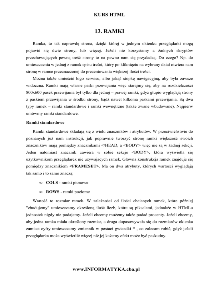 KURS HTML 13. RAMKI Ramka, to tak naprawdę strona, dzięki której w jednym okienku przeglądarki mogą pojawić się dwie strony, lub więcej. JeŜeli nie korzystamy z Ŝadnych skryptów przechowujących pewną treść strony to na pewno nam się przydadzą. Do czego? Np. do umieszczenia w jednej z ramek spisu treści, który po kliknięciu na wybrany dział otwiera nam stronę w ramce przeznaczonej do prezentowania większej ilości treści. MoŜna takŜe umieścić logo serwisu, albo jakąś stopkę nawigacyjną, aby była zawsze widoczna. Ramki mają własne paski przewijania więc starajmy się, aby na rozdzielczości 800x600 pasek przewijania był tylko dla jednej – prawej ramki, gdyŜ głupio wyglądają strony z paskiem przewijania w środku strony, bądź nawet kilkoma paskami przewijania. Są dwa typy ramek – ramki standardowe i ramki wewnętrzne (takŜe zwane wbudowane). Najpierw umówmy ramki standardowe. Ramki standardowe Ramki standardowe składają się z wielu znaczników i atrybutów. W przeciwieństwie do poznanych juŜ nam instrukcji, jak poprawnie tworzyć stronę ramki większość swoich znaczników mają pomiędzy znacznikami </HEAD, a <BODY> więc nie są w Ŝadnej sekcji. Jeden natomiast znacznik zawiera w sobie sekcje <BODY>, która wyświetla się uŜytkownikom przeglądarek nie uŜywających ramek. Główna konstrukcja ramek znajduje się pomiędzy znacznikiem <FRAMESET>. Ma on dwa atrybuty, których wartości wyglądają tak samo i to samo znaczą: • COLS - ramki pionowe • ROWS - ramki poziome Wartość to rozmiar ramek. W zaleŜności od ilości chcianych ramek, które później "zbudujemy" umieszczamy określoną ilość liczb, które są pikselami, jednakŜe w HTMLu jednostek nigdy nie podajemy. JeŜeli chcemy moŜemy takŜe podać procenty. JeŜeli chcemy, aby jedna ramka miała określony rozmiar, a druga dopasowywała się do rozmiarów okienka zamiast cyfry umieszczamy zmiennik w postaci gwiazdki * , co zalecam robić, gdyŜ jeŜeli przeglądarka moŜe wyświetlić więcej niŜ jej kaŜemy efekt moŜe być paskudny. www.INFORMATYKA.cba.pl KURS HTML Określanie ilości ramek i ładowanego dokumentu Czas zbudować same ramki. Pomiędzy znacznikiem <FRAMESET> umieszczamy tyle znaczników <FRAME>, ile chcemy mieć ramek. Pamiętajmy, Ŝe ramki muszą być odpowiedniej kolejności, w zaleŜności od ustawionej wcześniej wartości ich rozmiaru! NajwaŜniejszym atrybutem jest NAME, którego wartość oznacza nazwę ramki. Dzięki temu, jeŜeli klikniemy z ramki, która jest spisem treści, na taki link: <A HREF="dzial.htm" TARGET="ramka">Dział</A> strona zostanie otworzona w ramce przeznaczonej na prezentowanie treści, pod warunkiem, Ŝe będzie ona nazwana "ramka". Kolejnym waŜnym atrybutem jest SRC, w którego wartości umieszczamy ścieŜkę do dokumentu, który zostanie otwarty w ramce po załadowaniu ramki. ChociaŜ rozmiar ramki został określony to i tak uŜytkownik moŜe go zmienić po najechaniu na pasek rozdzielający ramki. Aby temu zapobiec musimy uŜyć atrybutu NORESIZE. Za pomocą SCROLLING decydujemy o zachowaniu się pasków przewijania. Wartości tego atrybutu to: • yes - pasek przewijania zawsze widoczny • no - pasek przewijania zawsze niewidoczny (nawet jeŜeli zawartość ramki jest większa, niŜ sama ramka) • auto - pasek przewijania widoczny, jeŜeli zawartość ramki jest większa niŜ sama ramka (jeŜeli zawartość ramki jest mniejsza, pasek nie pojawi się) Ostatnim atrybutem wartym opisania jest FRAMEBORDER (ang. obramowanie ramki), który decyduje o pojawieniu się, bądź nie pojawieniu się obramowania ramki. Jego wartości to: • yes (takŜe 1) –obramowania • no (takŜe 0) – brak obramowania Uwaga: moŜe wydawać się to dziwne, Ŝe jeŜeli mamy dwie ramki musimy uŜywać w kaŜdej z nich atrybutów NORESIZE i FRAMEBORDER, aby pozbyć się obramowania i moŜliwości przewijania ramki. Wszystko jest dokładnie przemyślane. JeŜeli mielibyśmy np. trzy ramki i chcielibyśmy, aby tylko dwie ostatnie nie mogły być przewijane i, aby były bez obramowania, to wpisując te atrybuty do środkowej ramki, to skąd przeglądarka wiedziałaby, czy usunąć obramowanie pomiędzy pierwszą, a drugą ramką, czy, drugą, a trzecią? MoŜna odpowiedzieć, Ŝe wystarczyłoby umieścić te atrybuty w trzeciej ramce, ale w przypadku www.INFORMATYKA.cba.pl KURS HTML większej ilości ramek i chęci zmiany tych elementów dla środkowych ramek byłoby to albo niemoŜliwe, albo na kaŜdej przeglądarce wyglądałoby inaczej. Te atrybuty wpisujemy do obu ramek, pomiędzy którymi ma zniknąć moŜliwość przewijania i widoczność obramowania. Uwaga: pamiętajmy, Ŝe w dokumencie, który przechowuje kod ramek moŜemy umieścić sekcję HEAD, w które moŜemy umieścić niektóre niedługo poznane metatagi, a takŜe tytuł, jednakŜe te wartości nie oznaczają tego, iŜ moŜemy sobie odpuścić je w dokumentach wyświetlających się w ramkach. Uwaga: pamiętajmy, Ŝe w dokumencie przechowującym ramki musimy nadać inną specyfikację (znacznik <!DOCTYPE>, który zawsze powinien być przed znacznikiem <HTML>). Zamiast kodu, który został umieszczony w drugiej lekcji uŜyjmy poniŜszego: <!DOCTYPE HTML PUBLIC "-//W3C//DTD HTML 4.0 Frameset//EN"> Uwaga: jeŜeli chcemy zrobić ramki mieszane, czyli pionowe i poziome naraz, musimy w jednym, lub w większej ilości dokumentów domyślnych dla ramek umieścić ponownie kod ramek, z przeciwnym typem ich rozmieszczenia – dla COLS będzie to ROWS i na odwrót. Zastosowanie ramek Skończyliśmy juŜ opisywanie znacznika <FRAMESET> więc teraz zajmijmy się alternatywą ramek. Całą sekcję BODY umieszczamy pomiędzy znacznikiem NOFRAMES (ang. nie ramki). To co będzie zawierać sekcja BODY wyświetli się nam na ekranie, w przypadku przeglądarki nie obsługującej ramek. Najlepiej umieścić tam informacje, Ŝe "Twoja przeglądarka nie obsługuje ramek", albo najlepiej wsz