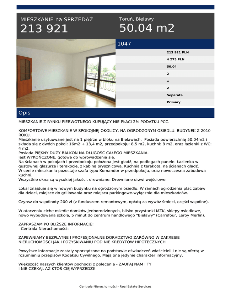 MIESZKANIE na SPRZEDAŻ 213 921 Toruń, Bielawy 50.04 m2 1047 213 921 PLN 4 275 PLN 50.04 2 1 2 Separate Primary Opis MIESZKANIE Z RYNKU PIERWOTNEGO KUPUJĄCY NIE PŁACI 2% PODATKU PCC. KOMFORTOWE MIESZKANIE W SPOKOJNEJ OKOLICY, NA OGRODZONYM OSIEDLU. BUDYNEK Z 2010 ROKU. Mieszkanie usytuowane jest na 1 piętrze w bloku na Bielawach. Posiada powierzchnię 50,04m2 i składa się z dwóch pokoi: 16m2 + 13,4 m2, przedpokoju: 8,5 m2, kuchni: 8 m2, oraz łazienki z WC: 4 m2. Posiada PIĘKNY DUŻY BALKON NA DŁUGOŚĆ CAŁEGO MIESZKANIA. Jest WYKOŃCZONE, gotowe do wprowadzenia się. Na ścianach w pokojach i przedpokoju położona jest gładź, na podłogach panele. Łazienka w gustownej glazurze i terakocie, z kabiną prysznicową. Kuchnia z terakotą, na ścianach gładź. W cenie mieszkania pozostaje szafa typu Komandor w przedpokoju, oraz nowoczesna zabudowa kuchni. Wszystkie okna są wysokiej jakości, drewniane. Drewniane drzwi wejściowe. Lokal znajduje się w nowym budynku na ogrodzonym osiedlu. W ramach ogrodzenia plac zabaw dla dzieci, miejsce do grillowania oraz miejsca parkingowe-wyłącznie dla mieszkańców. Czynsz do wspólnoty 200 zł (z funduszem remontowym, opłatą za wywóz śmieci, części wspólne). W otoczeniu ciche osiedle domków jednorodzinnych, blisko przystanki MZK, sklepy osiedlowe, nowo wybudowana szkoła, 5 minut do centrum handlowego "Bielawy" (Carrefour, Leroy Merlin). ZAPRASZAM PO BLIŻSZE INFORMACJE! Centrala Nieruchomości: ZAPEWNIAMY BEZPŁATNE I PROFESJONALNE DORADZTWO ZARÓWNO W ZAKRESIE NIERUCHOMOŚCI JAK I POZYSKIWANIU POD NIE KREDYTÓW HIPOTECZNYCH Powyższe informacje zostały sporządzone na podstawie oświadczeń właścicieli i nie są ofertą w rozumieniu przepisów Kodeksu Cywilnego. Mają one jedynie charakter informacyjny. Większość naszych klientów pochodzi z polecenia - ZAUFAJ NAM I TY I NIE CZEKAJ, AŻ KTOŚ CIĘ WYPRZEDZI! Centrala Nieruchomości - Real Estate Services Zadzwoń i umów się na prezentację ! Nr licencji pośrednika odpowiedzialnego za wykonanie umowy pośrednictwa 14260. zobacz inne nasze oferty na www.centralanieruchomosci.pl facebook.com/Centrala.N Centrala Nieruchomości - Real Estate Services tel. (+48) 663 899 715 email: [email protected] Centrala Nieruchomości - Real Estate Services Powered by TCPDF (www.tcpdf.org)