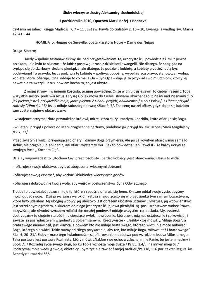 Śluby wieczyste siostry Aleksandry Suchodolskiej 1 października 2010, Opactwo Matki Bożej z Bonneval Czytania mszalne: Księga Mądrości 7, 7 – 11 ; List św. Pawła do Galatów 2, 16 – 20; Ewangelia według św. Marka 12, 41 – 44 HOMILIA o. Hugues de Sereville, opata klasztoru Notre – Dame des Neiges Droga Siostro; Kiedy wspólnie zastanawialiśmy sie nad przygotowaniem tej uroczystości, powiedziałaś mi z pewną przekorą - ale było to słuszne – że lubisz postawę Jezusa z dzisiejszej ewangelii. Nie dlatego, że spogląda na sypiące się do skarbony drobne pieniądze, ale dlatego, że podziwia kobietę, a kobiety przecież lubią byd podziwiane! To prawda, Jezus podziwia tę kobietę – gorliwą, pobożną, wypełniającą prawo, stanowczą i wolną, kobietę, która ofiaruje. Ona oddaje to co ma, a On – Syn Ojca – daje ją za przykład swoim uczniom, którzy jej nawet nie zauważyli. Jezus bowiem kocha to, co jest ukryte. Z mojej strony i w imieniu Kościoła, pragnę powiedzied Ci, że w dniu dzisiejszym to ciebie i razem z Tobą wszystkie siostry podziwia Jezus. I słyszę Go jak mówi do Ciebie słowami Ukochanego z Pieśni nad Pieśniami :” O jak piękna jesteś, przyjaciółko moja, jakże piękna! Z Libanu przyjdź, oblubienico / albo z Polski/, z Libanu przyjdź i zbliż się.”/Pnp 4,1 i 7/ Jezus miłuje radosnego dawcę /2Kor 9, 7/. Zna cenę naszej ofiary, gdyż dając się ludziom sam został najpierw obdarowany; - w stajence otrzymał złoto przynależne królowi, mirrę, która służy umarłym, kadzidło, które ofiaruje się Bogu. - w Betanii przyjął z pokorą od Marii drogocenne perfumy, podobnie jak przyjął łzy skruszonej Marii Magdaleny /Łk 7, 37/. Przed świątynią widzi przyjmującego ofiary i daniny Boga przymierza. Ale po całkowitym ofiarowaniu samego siebie, nie pragnie już ani danin, ani ofiar : wystarczy mu – jak to powiedział Jan Paweł II - że każdy uczyni ze swojego życia „ Kocham Cię”. Dziś Ty wypowiadasz to „Kocham Cię” przez osobisty i bardzo kobiecy gest ofiarowania, i Jezus to widzi: - ofiarujesz swoje ubóstwo, aby byd ubogacona wiecznymi dobrami - ofiarujesz swoją czystośd, aby kochad Oblubieoca wieczystych godów - ofiarujesz dobrowolnie twoją wolę, aby wejśd w posłuszeostwo Syna Odwiecznego. Trzeba to powiedzied : Jezus miłuje te, które z radością ofiarują się Jemu. On sam oddał swoje życie, abyśmy mogli oddad swoje. Dziś przyciągasz wzrok Chrystusa znajdującego się w przedsionku tym samym bogactwem, które było udziałem tej ubogiej wdowy: jej ubóstwo jest obrazem ubóstwa uczniów Chrystusa, jej wdowieostwo jest strzeżonym ogrodem, a kluczem do niego jest czystośd, jej dwa pieniążki są posłuszeostwem wobec Prawa, oczywiście, ale również wyrazem miłości doskonałej ponieważ oddaje wszystko co posiada. My, cystersi, dostrzegamy tu chętnie stałośd i nie cierpiące zwłoki nawrócenie, które związują nas ostatecznie i całkowicie , i zawsze za pośrednictwem wspólnoty z Bogiem samym. Rzeczywiście - „Jeśliby ktoś mówił: „ Miłuję Boga”, a brata swego nienawidził, jest kłamcą, albowiem kto nie miłuje brata swego, którego widzi, nie może miłowad Boga, którego nie widzi. Takie mamy od Niego przykazanie, aby ten, kto miłuje Boga, miłował też i brata swego” /1Jn 4, 20- 21/. Śluby – masz tego świadomośd – są ofiarowaniem ubóstwa pod wzrokiem Jezusa Miłosiernego. Taka postawa jest postawą Psalmisty, który mówi: „Nakłoo swe ucho, wysłuchaj mnie Panie, bo jestem nędzny i ubogi /…/ Rozraduj życie swego sługi, bo ku Tobie wznoszę moją duszę / Ps 85, 1.4/. i na innym miejscu :” Podtrzymaj mnie według swojej obietnicy , bym żył; nie zawiedź mojej nadziei!/Ps 118, 116 por. także: Reguła św. Benedykta rozdział 58/. Bracia i Siostry; Tajemnice, które dziś celebrujemy są tajemnicami miłości, która się daje. Na wzór św. Teresy od Dzieciątka Jezus, której wspomnienie dziś obchodzimy/ i która nie jest Polką…/pragniemy byd w sercu Kościoła ojcem i matką, misjonarzem, prorokiem, apostołem , byd może nawet papieskim żuławem /dawna formacja militarna paostwa watykaoskiego/, kapłanem albo kimś innym… Jednak Teresa, Doktor Miłości, czytując pisma odkryła, że miłośd otrzymywana i dawana, miłośd, która przebacza – streszcza w sobie wszystkie powołania. Zadecydowała, ze będzie w sercu Kościoła – swojej Matki - właśnie miłością. Dotykamy w tym miejscu tajemnicy powołania monastycznego. Tajemnicy daru i tego, co kosztuje, kiedy wyzwalamy się z wielu obciążeo, żeby zajśd jeszcze dalej w tym doświadczeniu, albo w tej wiedzy miłości. Ordo noster, scola caritatis Est/ Zakon nasz jest szkołą miłości!/ Mnisi i mniszki mają tylko dwa pieniążki do zaofiarowania. Św. Benedykt nazywa je pokorą i posłuszeostwem i konstruuje z nich drabinę , po której można dostad się do Boga. Bo nie należy zapominad, że dzisiejsze poświęcenie Oli może się dopełnid tylko w Bogu: spotkanym, szukanym, kochanym, Bogu, któremu się służy. Księga mądrości mówi nam o tym: Jest tylko jeden sposób dla wszystkich wejścia w ten świat i odejścia z niego – to posiąśd inteligencję wiedzy o miłości. Inteligencję tę nabywa się w doświadczeniu i dlatego życie monastyczne jest często nieprzymuszoną zgodą na wejście w przestrzeo – przestrzeo wspólnoty, ze względu na niezmierzoną wolnośd, wolnośd dzieci bożych. Czyż Chrystus ukrzyżowany, Chrystus, który bez przymusu podąża na spotkanie swojej męki- jednakowo bolesnej i błogosławionej – nie jest naszym jedynym wzorem? Przyjdzie dzieo, w którym będziemy mogli powiedzied za Apostołem Narodów : „ Nie żyjemy już my, ale żyje w nas Chrystus”. On jest naszą wolnością! Dziś siostra Ola ofiaruje siebie, ponieważ doświadczyła Chrystusa, który ją podziwia, woła i ją wypełnia . Naszym zadanie