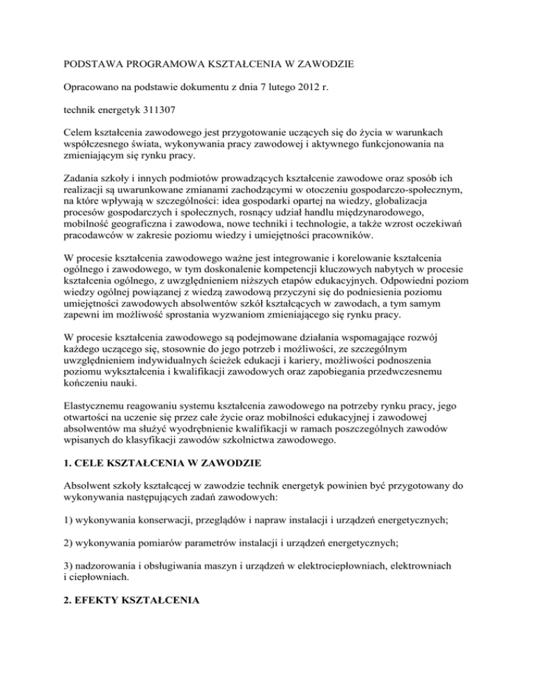 PODSTAWA PROGRAMOWA KSZTAŁCENIA W ZAWODZIE Opracowano na podstawie dokumentu z dnia 7 lutego 2012 r. technik energetyk 311307 Celem kształcenia zawodowego jest przygotowanie uczących się do życia w warunkach współczesnego świata, wykonywania pracy zawodowej i aktywnego funkcjonowania na zmieniającym się rynku pracy. Zadania szkoły i innych podmiotów prowadzących kształcenie zawodowe oraz sposób ich realizacji są uwarunkowane zmianami zachodzącymi w otoczeniu gospodarczo-społecznym, na które wpływają w szczególności: idea gospodarki opartej na wiedzy, globalizacja procesów gospodarczych i społecznych, rosnący udział handlu międzynarodowego, mobilność geograficzna i zawodowa, nowe techniki i technologie, a także wzrost oczekiwań pracodawców w zakresie poziomu wiedzy i umiejętności pracowników. W procesie kształcenia zawodowego ważne jest integrowanie i korelowanie kształcenia ogólnego i zawodowego, w tym doskonalenie kompetencji kluczowych nabytych w procesie kształcenia ogólnego, z uwzględnieniem niższych etapów edukacyjnych. Odpowiedni poziom wiedzy ogólnej powiązanej z wiedzą zawodową przyczyni się do podniesienia poziomu umiejętności zawodowych absolwentów szkół kształcących w zawodach, a tym samym zapewni im możliwość sprostania wyzwaniom zmieniającego się rynku pracy. W procesie kształcenia zawodowego są podejmowane działania wspomagające rozwój każdego uczącego się, stosownie do jego potrzeb i możliwości, ze szczególnym uwzględnieniem indywidualnych ścieżek edukacji i kariery, możliwości podnoszenia poziomu wykształcenia i kwalifikacji zawodowych oraz zapobiegania przedwczesnemu kończeniu nauki. Elastycznemu reagowaniu systemu kształcenia zawodowego na potrzeby rynku pracy, jego otwartości na uczenie się przez całe życie oraz mobilności edukacyjnej i zawodowej absolwentów ma służyć wyodrębnienie kwalifikacji w ramach poszczególnych zawodów wpisanych do klasyfikacji zawodów szkolnictwa zawodowego. 1. CELE KSZTAŁCENIA W ZAWODZIE Absolwent szkoły kształcącej w zawodzie technik energetyk powinien być przygotowany do wykonywania następujących zadań zawodowych: 1) wykonywania konserwacji, przeglądów i napraw instalacji i urządzeń energetycznych; 2) wykonywania pomiarów parametrów instalacji i urządzeń energetycznych; 3) nadzorowania i obsługiwania maszyn i urządzeń w elektrociepłowniach, elektrowniach i ciepłowniach. 2. EFEKTY KSZTAŁCENIA Do wykonywania wyżej wymienionych zadań zawodowych niezbędne jest osiągnięcie zakładanych efektów kształcenia, na które składają się: 1) efekty kształcenia wspólne dla wszystkich zawodów; (BHP). Bezpieczeństwo i higiena pracy Uczeń: 1) rozróżnia pojęcia związane z bezpieczeństwem i higieną pracy, ochroną przeciwpożarową, ochroną środowiska i ergonomią; 2) rozróżnia zadania i uprawnienia instytucji oraz służb działających w zakresie ochrony pracy i ochrony środowiska w Polsce; 3) określa prawa i obowiązki pracownika oraz pracodawcy w zakresie bezpieczeństwa i higieny pracy; 4) przewiduje zagrożenia dla zdrowia i życia człowieka oraz mienia i środowiska związane z wykonywaniem zadań zawodowych; 5) określa zagrożenia związane z występowaniem szkodliwych czynników w środowisku pracy; 6) określa skutki oddziaływania czynników szkodliwych na organizm człowieka; 7) organizuje stanowisko pracy zgodnie z obowiązującymi wymaganiami ergonomii, przepisami bezpieczeństwa i higieny pracy, ochrony przeciwpożarowej i ochrony środowiska; 8) stosuje środki ochrony indywidualnej i zbiorowej podczas wykonywania zadań zawodowych; 9) przestrzega zasad bezpieczeństwa i higieny pracy oraz stosuje przepisy prawa dotyczące ochrony przeciwpożarowej i ochrony środowiska; 10) udziela pierwszej pomocy poszkodowanym w wypadkach przy pracy oraz w stanach zagrożenia zdrowia i życia. (PDG). Podejmowanie i prowadzenie działalności gospodarczej Uczeń: 1) stosuje pojęcia z obszaru funkcjonowania gospodarki rynkowej; 2) stosuje przepisy prawa pracy, przepisy prawa dotyczące ochrony danych osobowych oraz przepisy prawa podatkowego i prawa autorskiego; 3) stosuje przepisy prawa dotyczące prowadzenia działalności gospodarczej; 4) rozróżnia przedsiębiorstwa i instytucje występujące w branży i powiązania między nimi; 5) analizuje działania prowadzone przez przedsiębiorstwa funkcjonujące w branży; 6) inicjuje wspólne przedsięwzięcia z różnymi przedsiębiorstwami z branży; 7) przygotowuje dokumentację niezbędną do uruchomienia i prowadzenia działalności gospodarczej; 8) prowadzi korespondencję związaną z prowadzeniem działalności gospodarczej; 9) obsługuje urządzenia biurowe oraz stosuje programy komputerowe wspomagające prowadzenie działalności gospodarczej; 10) planuje i podejmuje działania marketingowe prowadzonej działalności gospodarczej; 11) optymalizuje koszty i przychody prowadzonej działalności gospodarczej. (JOZ). Język obcy ukierunkowany zawodowo Uczeń: 1) posługuje się zasobem środków językowych (leksykalnych, gramatycznych, ortograficznych oraz fonetycznych), umożliwiających realizację zadań zawodowych; 2) interpretuje wypowiedzi dotyczące wykonywania typowych czynności zawodowych artykułowane powoli i wyraźnie, w standardowej odmianie języka; 3) analizuje i interpretuje krótkie teksty pisemne dotyczące wykonywania typowych czynności zawodowych; 4) formułuje krótkie i zrozumiałe wypowiedzi oraz teksty pisemne umożliwiające komunikowanie się w środowisku pracy; 5) korzysta z obcojęzycznych źródeł informacji. (KPS). Kompetencje personalne i społeczne Uczeń: 1) przestrzega zasad kultury i etyki; 2) jest kreatywny i konsekwentny w realizacji zadań; 3) przewiduje skutki podejmowanych działań; 4) jest otwarty na zmiany; 5) potrafi radzić sobie ze stresem; 6) aktualizuje wiedzę i doskonali umiejętności zawodowe; 7) przestrzega t