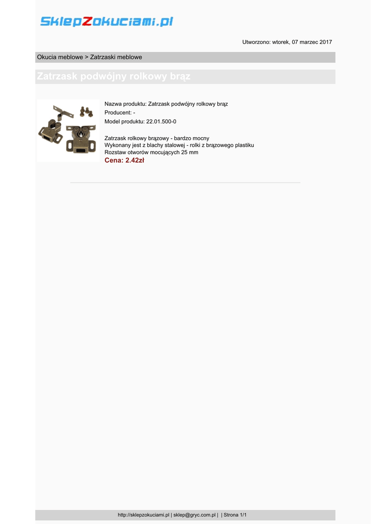 Utworzono: wtorek, 07 marzec 2017 Okucia meblowe > Zatrzaski meblowe Zatrzask podwójny rolkowy brąz Nazwa produktu: Zatrzask podwójny rolkowy brąz Producent: Model produktu: 22.01.500-0 Zatrzask rolkowy brązowy - bardzo mocny Wykonany jest z blachy stalowej - rolki z brązowego plastiku Rozstaw otworów mocujących 25 mm Cena: 2.42zł http://sklepzokuciami.pl | [email protected] | | Strona 1/1