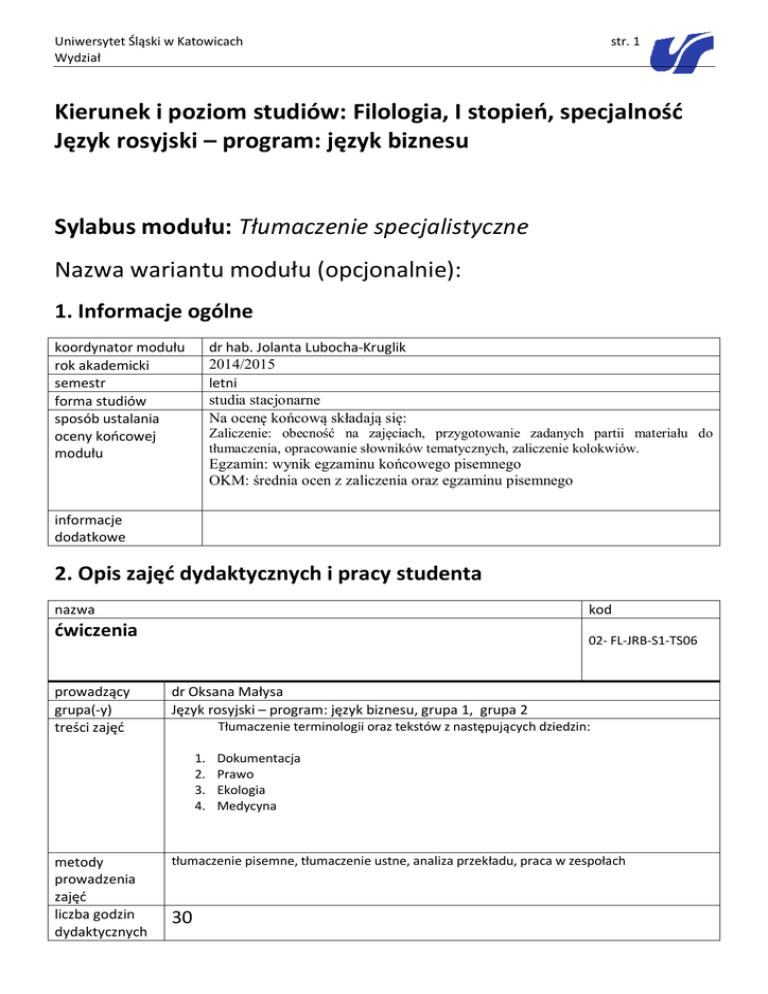 Uniwersytet Śląski w Katowicach Wydział str. 1 Kierunek i poziom studiów: Filologia, I stopień, specjalność Język rosyjski – program: język biznesu Sylabus modułu: Tłumaczenie specjalistyczne Nazwa wariantu modułu (opcjonalnie): 1. Informacje ogólne koordynator modułu rok akademicki semestr forma studiów sposób ustalania oceny końcowej modułu dr hab. Jolanta Lubocha-Kruglik 2014/2015 letni studia stacjonarne Na ocenę końcową składają się: Zaliczenie: obecność na zajęciach, przygotowanie zadanych partii materiału do tłumaczenia, opracowanie słowników tematycznych, zaliczenie kolokwiów. Egzamin: wynik egzaminu końcowego pisemnego OKM: średnia ocen z zaliczenia oraz egzaminu pisemnego informacje dodatkowe 2. Opis zajęć dydaktycznych i pracy studenta nazwa kod ćwiczenia prowadzący grupa(-y) treści zajęć 02- FL-JRB-S1-TS06 dr Oksana Małysa Język rosyjski – program: język biznesu, grupa 1, grupa 2 Tłumaczenie terminologii oraz tekstów z następujących dziedzin: 1. 2. 3. 4. metody prowadzenia zajęć liczba godzin dydaktycznych Dokumentacja Prawo Ekologia Medycyna tłumaczenie pisemne, tłumaczenie ustne, analiza przekładu, praca w zespołach 30 Uniwersytet Śląski w Katowicach Wydział (kontaktowych) liczba godzin pracy własnej studenta opis pracy własnej studenta organizacja zajęć literatura obowiązkowa literatura uzupełniająca str. 2 40 samodzielna realizacja wskazanych partii materiału oraz lektura wskazanych opracowań, lingwistyczna analiza translatorska wybranych przez wykładowcę przykładów, przygotowanie do tłumaczenia ustnego, przygotowanie do kontrolnych prac pisemnych oraz egzaminu. 15 zajęć w semestrze. Wielkość jednostki zajęć: 90 minut Jednostki kontaktowe zgodnie z harmonogramem zajęć Instytutu Filologii Wschodniosłowiańskiej Uniwersytetu Śląskiego. 1. Dokumenty polskie. Wybór dla tłumaczy sądowych. Oprac. J. Poznański. Warszawa 1998. 2. Образцы документов предпринимательской деятельности в судопроизводстве. Oprac. N. Vassilenko, B. Górecka. Warszawa 2001. 3. S. Chwatow, R. Hajczuk: Русский язык в бизнесе. Warszawa 2000. 4. I. Ndiaye, B. Jeglińska: Wybrane dokumenty dla tłumaczy języka rosyjskiego. Postępowanie przygotowawcze. Postępowanie sądowe. Olsztyn 2011. 5. Materiały własne 1.Lubocha-Kruglik J., Zobek T., Zych A.: Rosyjsko-polski słownik tematyczny. Ekonomia. Warszawa 2001. 2. Zobek T. : Słownik terminologii prawniczej. Rosyjsko-polski. Warszawa 2007 3. Zobek T. : Słownik terminologii prawniczej. Polsko-rosyjski. Warszawa 2008 4. Gierlasińska L: Słownik terminów ubezpieczeniowych. Polsko-rosyjski. Rosyjsko-polski. 2007 5. Zaniewski J., Hajczuk R.: Podręczny słownik medyczny polsko-rosyjski i rosyjsko-polski. Warszawa 1999. 6. Podręczny idiomatykon polsko-rosyjski. Pod red. W. Chlebdy. T. 1 – 6. Opole 2008 – 2014. adres strony www zajęć informacje dodatkowe 3. Opis sposobów weryfikacji efektów kształcenia modułu nazwa kod Egzamin pisemny kod(-y) zajęć osoba(-y) przeprowadzająca(e) weryfikację grupa(-y) wymagania merytoryczne dr O. Małysa Język rosyjski – program: język biznesu, grupa 1, grupa 2 umiejętność weryfikacji słownictwa na podstawie słowników mono- i bilingwalnych, źródeł encyklopedycznych, tekstów równoległych, konsultacji; Uniwersytet Śląski w Katowicach Wydział str. 3 umiejętność stosowania różnych technik tłumaczeniowych; umiejętność doboru odpowiednich ekwiwalentów; umiejętność gromadzenia warsztatu pracy tłumacza tekstów specjalistycznych; świadomość odpowiedzialności tłumacza tekstów specjalistycznych. kryteria oceny Warunkiem uzyskania zaliczenia jest przygotowanie do zajęć i aktywność na zajęciach, pozytywne wyniki pisemnych prac kontrolnych, zaliczenie ćwiczeń z tłumaczenia ustnego, przygotowanie słowników terminologicznych. Egzamin pisemny obejmuje teksty będące przedmiotem ćwiczeń. Materiał jest podzielony na część sprawdzającą znajomość terminologii oraz cześć sprawdzającą umiejętność tłumaczenia tekstów. przebieg procesu weryfikacji Egzamin przeprowadzany jest w formie pisemnej. Czas trwania egzaminu – 90 min. Ocena pozytywna – 60% punktów. Egzamin odbywa się zgodnie z harmonogramem sesji egzaminacyjnej w Instytucie Filologii Wschodniosłowiańskiej Uniwersytetu Śląskiego. informacje dodatkowe