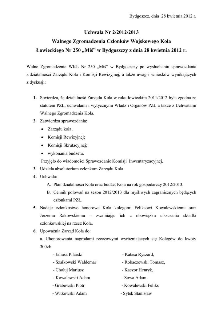 Bydgoszcz, dnia 28 kwietnia 2012 r. Uchwała Nr 2/2012/2013 Walnego Zgromadzenia Członków Wojskowego Koła Łowieckiego Nr 250 „Miś” w Bydgoszczy z dnia 28 kwietnia 2012 r. Walne Zgromadzenie WKŁ Nr 250 „Miś” w Bydgoszczy po wysłuchaniu sprawozdania z działalności Zarządu Koła i Komisji Rewizyjnej, a także uwag i wniosków wynikających z dyskusji: 1. Stwierdza, że działalność Zarządu Koła w roku łowieckim 2011/2012 była zgodna ze statutem PZŁ, uchwałami i wytycznymi Władz i Organów PZŁ a także z Uchwałami Walnego Zgromadzenia Koła. 2. Zatwierdza sprawozdania: Zarządu koła; Komisji Rewizyjnej; Komisji Skrutacyjnej; wykonania budżetu. Przyjęło do wiadomości Sprawozdanie Komisji Inwentaryzacyjnej. 3. Udziela absolutorium członkom Zarządu Koła. 4. Uchwala: A. Plan działalności Koła oraz budżet Koła na rok gospodarczy 2012/2013. B. Cennik polowań na sezon 2012/2013 dla myśliwych zagranicznych będących członkami PZŁ. 5. Nadaje członkostwo honorowe Koła kolegom: Feliksowi Kowalewskiemu oraz Jerzemu Rakowskiemu – zwalniając ich z obowiązku uiszczania składki członkowskiej na rzecz Koła. 6. Upoważnia Zarząd Koła do: a. Uhonorowania nagrodami rzeczowymi wyróżniających się Kolegów do kwoty 300zł: - Janusz Pilarski - Kałasa Ryszard, - Szałkowski Waldemar - Robaczewski Tomasz, - Chołuj Mariusz - Kaczor Henryk, - Kowalewski Adam - Sowa Adam - Grabowski Piotr - Kowalewski Feliks - Witkowski Adam - Sytek Stanisław b. Przedstawienia poniżej wymienionego myśliwego do odznaczeń łowieckich na: Brązowy Medal Zasługi Łowieckiej: - Chołuj Mariusz - Witkowski Adam - Krukowski Wojciech - Kałasa Ryszard - Sowa Adam - Kaczor Henryk - Iwański Jan - Podsiedlik Tomasz - Kozak Dariusz - Sytek Stanisław - Bień Marian - Zawal Rafał - Nowicki Włodzimierz - Chróśniak Tomasz Srebrny Medal Zasługi łowieckiej - Kowalewski Piotr - Zawiślak Janusz - Buczkowski Zdzisław Złotym Medal Zasługi Łowieckiej - Choiński Ireneusz - Spławski Mieczysław 7. Zaleca Zarządowi Koła zorganizowanie polowania dla myśliwych zagranicznych na zwierzynę grubą. Do pozyskania przeznacza się: 40 (czterdzieści) saren rogaczy w obwodzie 207; 12 (dwanaście) jelenie byki w obydwu obwodach oraz dziki, jelenie łanie, cielęta oraz sarny kozy, koźlęta. 8. Upoważnia Zarząd Koła do: organizacji co najmniej 6 (sześciu) polowań zbiorowych dla członków Koła na zwierzynę grubą oraz drobną; organizacji płatnych polowań na bażanty; 9. Zobowiązuje Zarząd Koła do podjęcia działań windykacyjnych względem podmiotów skupujących dziczyznę i posiadających zaległości finansowe względem Koła. 10. Zleca Zarządowi Koła zorganizowanie zakupu mundurów myśliwskich dla członków koła, którzy ich nie posiadających oraz dofinansowanie zakupu w wysokości 30% . 11. Uznaje bezpowrotni jako stratę należność w postaci niezapłaconej składki członkowskiej przez kol. Wojciecha Kujawę w wysokości 300zł. 12. Uznaje bezpowrotni jako stratę należność w postaci niezapłaconej składki członkowskiej przez kol. Jana Sykuta w wysokości 300zł. 13. Uznaje bezpowrotni jako stratę należność w postaci nieuiszczonej wierzytelności z tytułu sprzedaży tusz do Agro Bor Sp. z o.o. w wysokości 317,24zł. 14. Nie zwalnia się z opłat za nieprzepracowane godziny społeczne na rzecz Koła w sezonie 2011/2012 i 2012/2013 Kol. Rymarkiewicza Zbigniewa. Uchwała wchodzi w życie z dniem 28 kwietnia 2012 r. Tracą moc poprzednie uchwały z wyjątkiem uchwał dotyczących: -Wykupienia terenu, na którym znajduje się stanica Misiowo w m. Chrośna. - Upoważnienia Zarządu Koła do podjęcia działań mających na celu organizację obchodów 65 rocznicy powstania Koła. - Nadania członkostwa honorowego kol. Gustawowi Straszyńskiemu- zwalniając go obowiązku uiszczania składki członkowskiej na rzecz Koła.