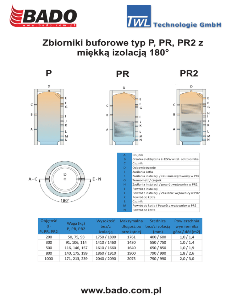 Zbiorniki buforowe typ P, PR, PR2 z miêkk¹ izolacj¹ 180° P. A B C D E F G H I J K L M N Objêtoœæ (l) P, PR, PR2 200 300 500 800 1000 PR2. PR. Waga (kg) P, PR, PR2 50, 75, 93 91, 106, 114 116, 146, 157 140, 175, 199 171, 213, 239 Czujnik Grza³ka elektryczna 2-12kW w zal. od zbiornika Czujnik Odpowietrzenie Zasilania kot³a Zasilania instalacji / zasilania wê¿ownicy w PR2 Termometr / czujnik Zasilania instalacji / powrót wê¿ownicy w PR2 Powrót z instalacji Powrót z instalacji / Zasilanie wê¿ownicy w PR2 Powrót do kot³a Czujnik Powrót do kot³a / Powrót z wê¿ownicy w PR2 Powrót do kot³a Wysokoœæ Maksymalna Œrednica Powierzchnia bez/z d³ugoœæ po bez/z izolacj¹ wymiennika izolacj¹ przek¹tnej (mm) góra / dó³ (m2) 1750 / 1800 1761 400 / 600 1,0 / 1,4 1410 / 1460 1430 550 / 750 1,0 / 1,4 1610 / 1660 1640 650 / 850 1,0 / 1,9 1860 / 1910 1900 790 / 990 1,8 / 2,6 2040 / 2090 2075 790 / 990 2,0 / 3,0 www.bado.com.pl