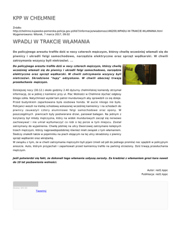 KPP W CHEŁMNIE Źródło: http://chelmno.kujawsko-pomorska.policja.gov.pl/kb7/informacje/wiadomosci/46200,WPADLI-W-TRAKCIE-WLAMANIA.html Wygenerowano: Wtorek, 7 marca 2017, 09:02 WPADLI W TRAKCIE WŁAMANIA Do policyjnego aresztu trafiło dziś w nocy czterech mężczyzn, którzy chwilę wcześniej włamali się do piwnicy i ukradli felgi samochodowe, narzędzia elektryczne oraz sprzęt wędkarski. W chwili zatrzymania wszyscy byli nietrzeźwi. ... Do policyjnego aresztu trafiło dziś w nocy czterech mężczyzn, którzy chwilę wcześniej włamali się do piwnicy i ukradli felgi samochodowe, narzędzia elektryczne oraz sprzęt wędkarski. W chwili zatrzymania wszyscy byli nietrzeźwi. Skradzione "łupy" odzyskano. W chwili obecnej trwają przesłuchania mężczyzn. Dzisiejszej nocy (30.12.) około godziny 2.40 dyżurny chełmińskiej komendy otrzymał informację, że w jednej z kamienic przy ul. Plac Wolności w Chełmnie słychać odgłosy bitego szkła. Natychmiast wysłał tam patrol mundurowych aby sprawdzili co się dzieje. Przed budynkiem zaparkowana była osobowa honda. W aucie nikogo nie było. Policjanci weszli na klatkę schodową wskazanej wcześniej kamienicy i na schodach do piwnicy zauważyli cztery aluminiowe felgi samochodowe oraz opony. W poszczególnych piwnicach były pootwierane drzwi, panował bałagan. Na jednym z korytarzy był młody mężczyzna, który na widok mundurowych zaczął się nerwowo zachowywać i nie umiał wytłumaczyć co robi o tej porze w tym miejscu. Został zatrzymany do wyjaśnienia. Chwilę później na ulicy Dworcowej zatrzymano kolejnych trzech mężczyzn, którzy najprawdopodobniej również mieli związek z tym włamaniem. Śledczy znaleźli także w pojemniku na piach stojącym na tej ulicy skradziony z piwnicy sprzęt wędkarski oraz wkrętarkę. W związku z tym, że w chwili zatrzymania mężczyźni byli pijani (mieli od pół do jednego promila) noc spędzili w policyjnym areszcie. Auto, którym przyjechali i zaparkowali przed kamienicą trafiło na parking strzeżony. Dziś trwają przesłuchania mężczyzn. Jeśli potwierdzi się fakt, że dokonali tego włamania usłyszą zarzuty. Za kradzież z włamaniem grozi kara nawet do 10 lat pozbawienia wolności. Autor: red1.kppc Publikacja: red1.kppc Ocena: 0/5 (0) Tweetnij