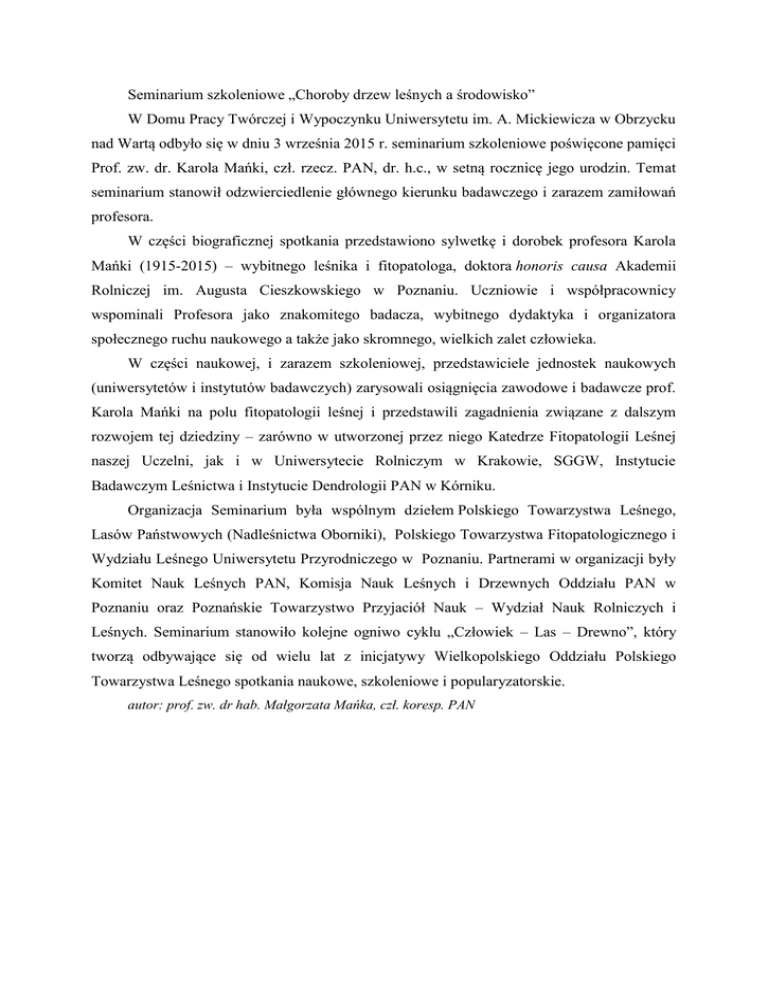 Seminarium szkoleniowe „Choroby drzew leśnych a środowisko” W Domu Pracy Twórczej i Wypoczynku Uniwersytetu im. A. Mickiewicza w Obrzycku nad Wartą odbyło się w dniu 3 września 2015 r. seminarium szkoleniowe poświęcone pamięci Prof. zw. dr. Karola Mańki, czł. rzecz. PAN, dr. h.c., w setną rocznicę jego urodzin. Temat seminarium stanowił odzwierciedlenie głównego kierunku badawczego i zarazem zamiłowań profesora. W części biograficznej spotkania przedstawiono sylwetkę i dorobek profesora Karola Mańki (1915-2015) – wybitnego leśnika i fitopatologa, doktora honoris causa Akademii Rolniczej im. Augusta Cieszkowskiego w Poznaniu. Uczniowie i współpracownicy wspominali Profesora jako znakomitego badacza, wybitnego dydaktyka i organizatora społecznego ruchu naukowego a także jako skromnego, wielkich zalet człowieka. W części naukowej, i zarazem szkoleniowej, przedstawiciele jednostek naukowych (uniwersytetów i instytutów badawczych) zarysowali osiągnięcia zawodowe i badawcze prof. Karola Mańki na polu fitopatologii leśnej i przedstawili zagadnienia związane z dalszym rozwojem tej dziedziny – zarówno w utworzonej przez niego Katedrze Fitopatologii Leśnej naszej Uczelni, jak i w Uniwersytecie Rolniczym w Krakowie, SGGW, Instytucie Badawczym Leśnictwa i Instytucie Dendrologii PAN w Kórniku. Organizacja Seminarium była wspólnym dziełem Polskiego Towarzystwa Leśnego, Lasów Państwowych (Nadleśnictwa Oborniki), Polskiego Towarzystwa Fitopatologicznego i Wydziału Leśnego Uniwersytetu Przyrodniczego w Poznaniu. Partnerami w organizacji były Komitet Nauk Leśnych PAN, Komisja Nauk Leśnych i Drzewnych Oddziału PAN w Poznaniu oraz Poznańskie Towarzystwo Przyjaciół Nauk – Wydział Nauk Rolniczych i Leśnych. Seminarium stanowiło kolejne ogniwo cyklu „Człowiek – Las – Drewno”, który tworzą odbywające się od wielu lat z inicjatywy Wielkopolskiego Oddziału Polskiego Towarzystwa Leśnego spotkania naukowe, szkoleniowe i popularyzatorskie. autor: prof. zw. dr hab. Małgorzata Mańka, czł. koresp. PAN
