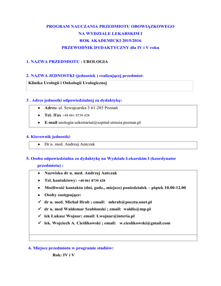 PROGRAM NAUCZANIA PRZEDMIOTU OBOWIĄZKOWEGO NA WYDZIALE LEKARSKIM I ROK AKADEMICKI 2015/2016 PRZEWODNIK DYDAKTYCZNY dla IV i V roku 1. NAZWA PRZEDMIOTU : UROLOGIA 2. NAZWA JEDNOSTKI (jednostek ) realizującej przedmiot: Klinika Urologii i Onkologii Urologicznej 3 . Adres jednostki odpowiedzialnej za dydaktykę: Adres: ul. Szwajcarska 3 61-285 Poznań Tel. /Fax +48 061 8739 428 E-mail [email protected] 4. Kierownik jednostki: Dr n. med. Andrzej Antczak 5. Osoba odpowiedzialna za dydaktykę na Wydziale Lekarskim I (koordynator przedmiotu) : Nazwisko dr n. med. Andrzej Antczak Tel. kontaktowy: +48 061 8739 428 Możliwość kontaktu (dni, godz., miejsce) poniedziałek – piątek 10.00-12.00 Osoby zastępujące: dr n. med. Michał Hrab ; email: [email protected] dr n. med Waldemar Szabłonski ; email: [email protected] lek Łukasz Wojnar; email: [email protected] lek. Wojciech A. Cieślikowski ; email: [email protected] 6. Miejsce przedmiotu w programie studiów: Rok: IV i V Semestr: zimowy/letni 7. Liczba godzin ogółem : 26 liczba pkt.ECTS: Jednostki uczestniczące w nauczaniu przedmiotu Urologia 2 Semestr zimowy liczba godzin W Ć Ćwiczenia S kategoria 6 16 C 4 8 . Cel nauczania przedmiotu Treści kształcenia: Symptomatologia – diagnostyka i zasady kwalifikacji chorych do leczenia operacyjnego w ostrych i przewlekłych chorobach urologicznych – szczególnie nowotworowych. Przyczyny, objawy, zasady diagnozowania i postępowania terapeutycznego w odniesieniu do najczęstszych chorób urologicznych występujących u osób dorosłych oraz ich powikłań: chorób nerek i dróg moczowych, w tym: torbieli nerek, kamicy nerkowej, zakażeń układu moczowego, nowotworów układu moczowego, w szczególności raka pęcherza moczowego i raka nerki Zasady rozpoznawania i leczenia schorzeń urologicznych. Efekty kształcenia – umiejętności i kompetencje: chirurgiczne/urologiczne badanie chorego; rozpoznawania wrodzonych i nabytych wad układu moczowego, rozpoznawanie stanów nagłych w urologii Cewnikowanie pęcherza moczowego u kobiet i mężczyzn, wykonanie punkcji nadłonowej Asysta przy typowych procedurach urologicznych (endoskopii diagnostycznej i terapeutycznej układu moczowego, litotrypsji, punkcji prostaty); 9.Tematyka poszczególnych wykładów, ćwiczeń i seminariów Wykłady Tematyka wykładów Imię i nazwisko osoby prowadzącej zajęcia Wykład 1. Kamica Moczowa Dr med. Andrzej Antczak Wykład 2. Nowotwory Układu Moczowego Dr med. Andrzej Antczak Wykład 3. Nowoczesne mało inwazyjne metody leczenia schorzeń układu moczowo – płciowego. Dr med. Andrzej Antczak Seminaria Tematyka seminariów Ćwiczenie 1. Wprowadzenie do Urologii Osoba odpowiedzialna Dr Szabłonski Ćwiczenie 2. Łagodny rozrost gruczołu krokowego Dr Cieślikowski Ćwiczenie 3. Kamica moczowa Dr Hrab Ćwiczenie 4. Nowotwory układu moczowo-płciowego Dr Wojnar Ćwiczenie 5. Urazy układu moczowego Dr Antczak 10.REGULAMIN ZAJĘĆ: Zajęcia odbywają się w Klinice Urologii przy ul. Szwajcarwskiej 3 Zajęcia odbywają się w godzinach 8.00 – 12.00 Wymagany jest fartuch i ochronne obuwie. PROGRAM ZAJĘĆ: Zajęcia odbywają się od poniedziałku do piątku. 8.00 – 10.00 Ćwiczenia na Oddziale 10.00 – 11.00 Seminarium 11.00 – 12.00 Ćwiczenia na Oddziale PROGRAM NAUCZANIA Wymagania wstępne: znajomojść anatomii układu moczowo-płciowego Wymagania końcowe: zaliczenie końcowe z Urologii i Onkologii Urologicznej 12.Kryteria zaliczenia przedmiotu: zaliczenie, egzamin teoretyczny i praktyczny Zaliczenie – kryterium zaliczenia : obecność na zajeciach, zaliczenie znajomości ćwiczeń i seminariów 13.Literatura: Zalecana literatura: 1. Urologia – Podręcznik dla Studentów Medycyny. Andrzej Borkowski. Warszawa 2008 wyd. 2 2. CHIRURGIA PODRĘCZNIK DLA STUDENTÓW REDAKTOR: O. James Garden Elsevier Urban i Partner, Wrocław 2009 14.Studenckie koło naukowe Opiekun koła: dr n. med. Michał Hrab Tematyka: Onkologia Urologiczna Miejsce spotkań: Klinika Urologii ul. Szwajcarska 3 15. Podpis osoby odpowiedzialnej za nauczanie przedmiotu lub koordynatora 16. Podpisy osób współodpowiedzialnych za nauczanie przedmiotu ( w przypadku przedmiotów koordynowanych)