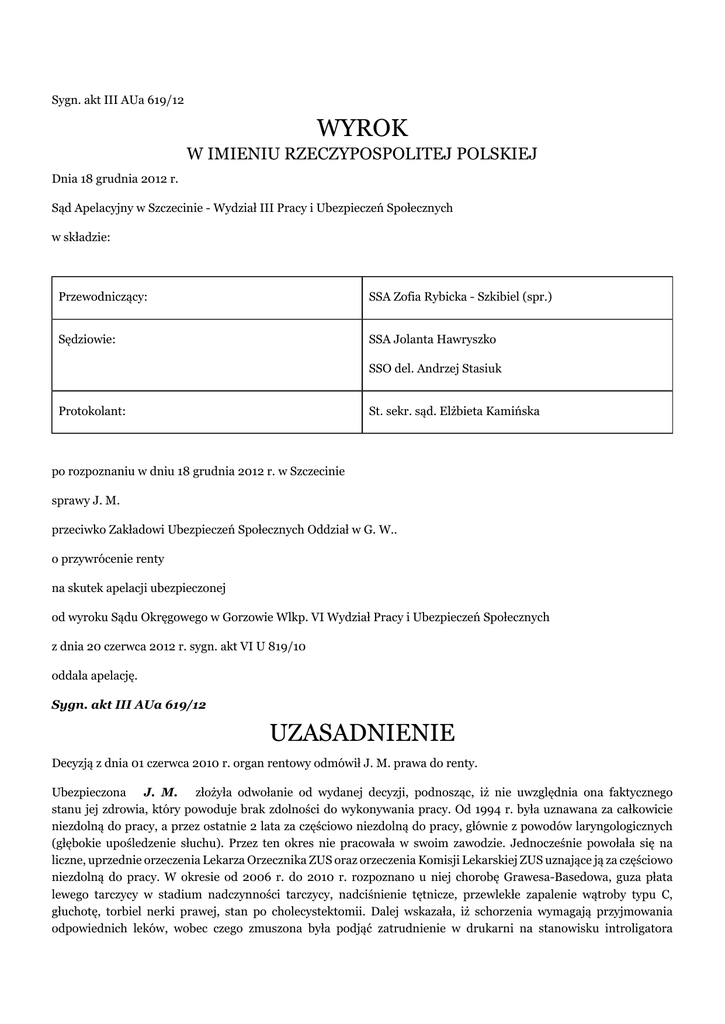 Sygn. akt III AUa 619/12 WYROK W IMIENIU RZECZYPOSPOLITEJ POLSKIEJ Dnia 18 grudnia 2012 r. Sąd Apelacyjny w Szczecinie - Wydział III Pracy i Ubezpieczeń Społecznych w składzie: Przewodniczący: SSA Zofia Rybicka - Szkibiel (spr.) Sędziowie: SSA Jolanta Hawryszko SSO del. Andrzej Stasiuk Protokolant: St. sekr. sąd. Elżbieta Kamińska po rozpoznaniu w dniu 18 grudnia 2012 r. w Szczecinie sprawy J. M. przeciwko Zakładowi Ubezpieczeń Społecznych Oddział w G. W.. o przywrócenie renty na skutek apelacji ubezpieczonej od wyroku Sądu Okręgowego w Gorzowie Wlkp. VI Wydział Pracy i Ubezpieczeń Społecznych z dnia 20 czerwca 2012 r. sygn. akt VI U 819/10 oddala apelację. Sygn. akt III AUa 619/12 UZASADNIENIE Decyzją z dnia 01 czerwca 2010 r. organ rentowy odmówił J. M. prawa do renty. Ubezpieczona J. M. złożyła odwołanie od wydanej decyzji, podnosząc, iż nie uwzględnia ona faktycznego stanu jej zdrowia, który powoduje brak zdolności do wykonywania pracy. Od 1994 r. była uznawana za całkowicie niezdolną do pracy, a przez ostatnie 2 lata za częściowo niezdolną do pracy, głównie z powodów laryngologicznych (głębokie upośledzenie słuchu). Przez ten okres nie pracowała w swoim zawodzie. Jednocześnie powołała się na liczne, uprzednie orzeczenia Lekarza Orzecznika ZUS oraz orzeczenia Komisji Lekarskiej ZUS uznające ją za częściowo niezdolną do pracy. W okresie od 2006 r. do 2010 r. rozpoznano u niej chorobę Grawesa-Basedowa, guza płata lewego tarczycy w stadium nadczynności tarczycy, nadciśnienie tętnicze, przewlekłe zapalenie wątroby typu C, głuchotę, torbiel nerki prawej, stan po cholecystektomii. Dalej wskazała, iż schorzenia wymagają przyjmowania odpowiednich leków, wobec czego zmuszona była podjąć zatrudnienie w drukarni na stanowisku introligatora (stanowisko przystosowane, zapewniające lekką pracę). Nadto podniosła, iż nieudane próby podjęcia zatrudnienia w zawodzie w okresie powstałej i utrzymującej się niezdolności, wywołały u niej depresję. W ocenie odwołującej decyzja organu rentowego, jak i orzeczenie Komisji Lekarskiej ZUS są dla niej krzywdzące. Organ rentowy - Zakład Ubezpieczeń Społecznych Oddział w G. wniósł o oddalenie odwołania powołując się na orzeczenie Komisji Lekarskiej w Z. z 19 maja 2010 r. ustalające, iż ubezpieczona nie jest niezdolna do pracy. Sąd Okręgowy w Gorzowie Wielkopolskim –Sąd Pracy i Ubezpieczeń Społecznych wyrokiem z dnia 20 czerwca 2012 r. oddalił odwołanie ubezpieczonej od decyzji Zakładu Ubezpieczeń Społecznych Oddziałowi w G. z dnia 1 czerwca 2010 r., znak (...). W ustaleniach faktycznych Sąd podał, iż J. M., ur. (...), posiada wykształcenie średnie ekonomiczne (bez matury) o kierunku sprzedawca, magazynier. Pracowała jako księgowa, szwaczka, brakarka, introligator. Ubezpieczona od 01 sierpnia 1994 r. pobierała rentę inwalidzką 3 grupy, a od 01 września 1996 r. - 2 grupy (późniejsza całkowita niezdolność do pracy). Od 01 lutego 2004 r. ubezpieczona otrzymywała rentę z tytułu częściowej niezdolności do pracy. Decyzją z dnia 10 kwietnia 2009 r. organ rentowy ustalił ubezpieczonej prawo do świadczenia w tej wysokości do 31 marca 2010 r. 08 marca 2010 r. ubezpieczona złożyła wniosek o ustalenie dalszego prawa do renty. 19 maja 2010 r. Komisja Lekarska ZUS w Z. orzekła o zdolności do pracy ubezpieczonej. Decyzją z dnia 01 czerwca 2010 r. organ rentowy odmówił J. M. prawa do renty. U ubezpieczonej rozpoznano chorobę nadciśnieniową postać narządowo niepowikłaną, obustronny niedosłuch na pograniczu z głuchotą, wole guzkowe nadczynne w okresie remisji, przewlekłe zapalenie wątroby typu C bez cech uszkodzenia wątroby lub jej dysfunkcji, torbiel nerki prawej, stan po cholecystektomii. Powyższe schorzenia nie czynią ubezpieczonej po 31 marca 2010 r. niezdolną do pracy. Przeciwwskazana jest praca w hałasie, przy maszynach w ruchu i z sygnalizacją dźwiękową, na wysokości oraz na stanowiskach, gdzie głuchota pracownika stwarza zagrożenie wypadkowe dla osób i mienia. Obustronny niedosłuch na pograniczu czuciowo - zmysłowym w stopniu głębokim (resztki słuchowe) nie powoduje niezdolności do pracy. Porozumienie z ubezpieczoną jest dobre. Słyszenie wyraźnie wspomaga odczytywaniem mowy z ust. Mowa nie jest zmieniona typowo niedosłuchem. Jest w znacznym stopniu zaadoptowana do stopniowo pogłębiającego się, od 18 roku życia, niedosłuchu. Nie stwierdza się u ubezpieczonej poprawy - stan stabilny - w porównaniu z badaniami słuchu z lat 2004, 2005 i 2006. Uszkodzenie słuchu jest trwałe i nieodwracalne, ale istnieje możliwość podjęcia próby protezowania innymi niż dotychczasowymi aparatami słuchowymi. Występujące u ubezpieczonej nadciśnienie tętnicze nie ma charakteru powikłanego. Nie występują również u ubezpieczonej zaburzenia rytmu serca, niestabilnej choroby wieńcowej, powikłań neurologicznych nadciśnienia. Nie zachodzi również istotne naruszenie sprawności hemodynamicznej Przeciwwskazane są prace ciężkie, o stałym znacznym wysiłku fizycznym oraz na wysokościach. Występująca u ubezpieczonej nadczynność tarczycy ma wyrównaną postać. Nie powoduje ona żadnych dolegliwości, co potwierdza prawidłowy stan endokrynologiczny (badania kliniczne i laboratoryjne potwierdzają poziom hormonów tarczycy w normie). Przewlekłe zapalenie wątroby typu C nie powoduje niezdolności do pracy. Nie stwierdzono uszkodzenia wątroby oraz upośledzenia jej funkcji (badania biobstyczne oraz biochemiczne wątroby). Torbiel w prawej nerce nie upośledza funkcji nerek, która jest zachowana prawidłowo. Ubezpieczona może wykonywać prace biurowe i kadrowe, pracę szwaczki, brakarki, sprzedawcy, magazyniera oraz introligatora. W oparciu o tak ustalony stan faktyczny Sąd Okręgowy uznał, iż odwołanie ubezpieczonej nie zasługiwało na uwzględnienie. Uzasadniając powyższe wskazał