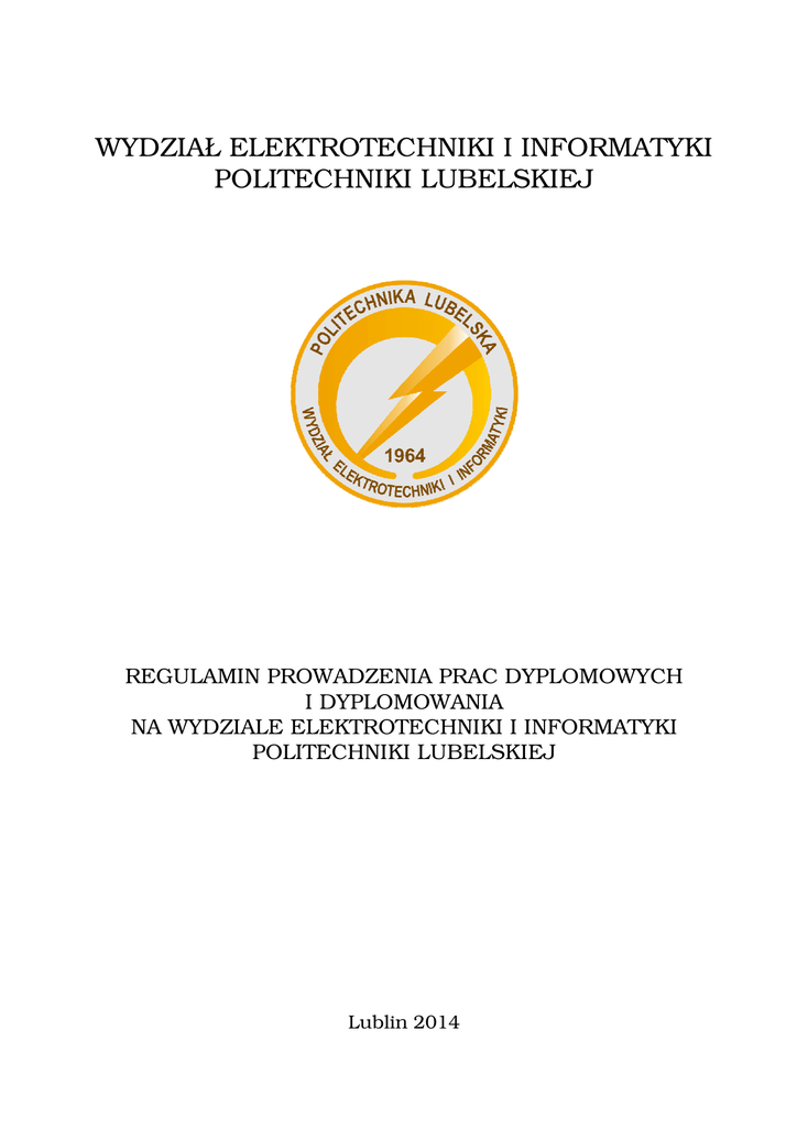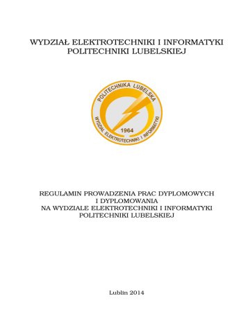 WYDZIAŁ ELEKTROTECHNIKI I INFORMATYKI POLITECHNIKI LUBELSKIEJ REGULAMIN PROWADZENIA PRAC DYPLOMOWYCH I DYPLOMOWANIA NA WYDZIALE ELEKTROTECHNIKI I INFORMATYKI POLITECHNIKI LUBELSKIEJ Lublin 2014 Procedurę dyplomowania i wykonywania prac dyplomowych określa Regulamin Studiów w Politechnice Lubelskiej. Celem niniejszego, szczegółowego regulaminu jest doprecyzowanie uregulowań mających na celu podniesienie jakości procesu dyplomowania zarówno na poziomie magisterskim, jak i inżynierskim, realizowanych na Wydziale Elektrotechniki i Informatyki Politechniki Lubelskiej. Zakres i charakterystyka pracy dyplomowej §1 1. Praca dyplomowa realizowana na studiach danego stopnia stawia przed studentem zadanie samodzielnego rozwiązania problemu zawodowego, dydaktycznego, technicznego lub badawczego przy wykorzystaniu wiedzy nabytej w okresie studiów. 2. Na studiach stacjonarnych i niestacjonarnych I stopnia (inżynierskich) na kierunkach prowadzonych przez Wydział Elektrotechniki i Informatyki, prowadzone są prace dyplomowe/projekty inżynierskie. 3. Na studiach stacjonarnych i niestacjonarnych II stopnia (magisterskich) na kierunkach prowadzonych przez Wydział Elektrotechniki i Informatyki, prowadzone są prace dyplomowe magisterskie. 4. Praca dyplomowa/projekt inżynierski jest rozwiązaniem konkretnego problemu inżynierskiego, realizującego określony cel i zakres pracy. Praca dyplomowa potwierdza opanowanie przez dyplomanta podstawowej wiedzy inżynierskiej w danej dziedzinie nabytej w okresie studiów. 5. Praca dyplomowa magisterska powinna mieć charakter badawczy, polegający w szczególności na nowatorskim rozwiązaniu problemu z zakresu elektrotechniki, mechatroniki, informatyki, inżynierii biomedycznej lub dydaktyki elektrotechniki, mechatroniki, inżynierii biomedycznej i informatyki, przeprowadzeniu badań empirycznych umożliwiających rozpoznanie istoty występujących problemów w edukacji, przemyśle, środowisku naturalnym, administracji, medycynie, itp. 6. W wyjątkowych przypadkach, praca dyplomowa może mieć inny charakter niż wymieniony w pkt. 4 i 5 (w szczególności: teoretyczno-literaturowy lub monograficzny), związany z zainteresowaniami badawczymi studenta. 7. Dyplomant w pracy dyplomowej powinien korzystać z rzeczywistych danych (z pomiarów, badań, obliczeń, symulacji), dobierać współcześnie stosowane metody i techniki, materiały i podzespoły oraz korzystać z komputerowych technik wspomagania prac inżynierskich. 8. W pracy dyplomowej konieczne jest dokonanie wyraźnego wskazania części stanowiącej wkład własny studenta, a w pracach zespołowych należy jednoznacznie określić autorów poszczególnych jej części. 9. Tematyka praca magisterskiej nie powinna być powtórzeniem tematyki pracy inżynierskiej. §2 Temat pracy dyplomowej i zakres badań, projektu, tez i hipotez badawczych oraz koncepcji w niej zawartych powinien być zgodny z zainteresowaniami i dotychczasowymi osiągnięciami naukowo–badawczymi lub dydaktycznymi 2 promotora, a także wchodzić w zakres tematyki badań lub zajęć dydaktycznych prowadzonych przez jego jednostkę. §3 Studenci studiów indywidualnych ustalają tytuł i zakres tematyczny pracy ze swoim opiekunem dydaktycznym. Praca ta powinna być związana z tematyką studiów indywidualnych. §4 Praca dyplomowa powinna zostać poprawnie opracowana pod względem merytorycznym i formalnym (językowo–edytorskim), powinna zawierać wnioski podsumowujące oraz zestawienie wykorzystywanej literatury przedmiotu. Szczegółowe wytyczne edytorskie w zakresie formalnym stanowią załączniki 6, 7, 8a i 8b do regulaminu prowadzenia prac dyplomowych i dyplomowania na Wydziale Elektrotechniki i Informatyki. Procedura przydzielania i prowadzenia prac dyplomowych §5 Temat pracy dyplomowej magisterskiej lub pracy dyplomowej/projektu inżynierskiego powinien być ustalony (tzn. przydzielony) nie później niż na pół roku przed planowanym ukończeniem studiów przez dyplomanta. §6 Procedura wyboru promotorów i tematów prac dyplomowych na studiach stacjonarnych i niestacjonarnych I stopnia ma następujący przebieg: 1. Na początku przedostatniego semestru studiów (tzw. semestr przeddyplomowy) prodziekan ds. studenckich zwraca się z prośbą do jednostek o przygotowanie tematów prac dyplomowych. 2. Kierownicy jednostek przesyłają do właściwego dziekana w formie papierowej i elektronicznej zbiorcze zestawienie tematów prac dyplomowych z przypisanymi do nich promotorami (wzór zestawienia stanowi załącznik 1 do niniejszego regulaminu). Zgłaszane tematy wynikają z aktualnego obszaru prac naukowych pracowników jednostek, mogą też wynikać ze współpracy lub zleceń z przemysłu. 3. Prodziekan ds. studenckich zgłoszone tematy przekazuje do wydziałowej komisji ds. kształcenia właściwego kierunku. Po ich pozytywnym zaopiniowaniu, zbiorczą listę tematów zgłasza na Radzie Wydziału celem zatwierdzenia. 4. Po zatwierdzeniu przez Radę Wydziału i podpisaniu przez prodziekana ds. studenckich tematy prac dyplomowych są przekazywane do jednostek i upubliczniane zainteresowanym (np. poprzez ogłaszanie na tablicach ogłoszeń, stronach internetowych). 5. W trakcie przeddyplomowego semestru studiów inżynierskich prodziekan ds. studenckich może zorganizować prezentację oferty poszczególnych katedr/instytutów w zakresie tematyki prac dyplomowych oraz promotorów. 3 Obsadę pracowników do prezentacji wyznaczają kierownicy poszczególnych jednostek. 6. Studenci kontaktują się z pracownikami, zgłaszającymi tematy dyplomowe, celem zapoznania się z celami i szczegółami zakresu pracy. 7. Wybór tematu i promotora następuje z chwilą wypełnienia i złożenia deklaracji podjęcia pracy dyplomowej w jednostce dyplomującej. Studenci deklaracje pobierają w dziekanacie (wzór deklaracji stanowi załącznik 2 do niniejszego regulaminu). Jednostki prowadzą ewidencje papierową i elektroniczną pobra