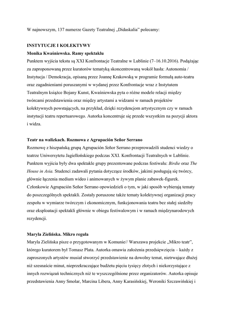 W najnowszym, 137 numerze Gazety Teatralnej „Didaskalia” polecamy: INSTYTUCJE I KOLEKTYWY Monika Kwaśniewska. Ramy spektaklu Punktem wyjścia tekstu są XXI Konfrontacje Teatralne w Lublinie (7–16.10.2016). Podążając za zaproponowaną przez kuratorów tematyką skoncentrowaną wokół hasła: Autonomia / Instytucja / Demokracja, opisaną przez Joannę Krakowską w programie formułą auto-teatru oraz zagadnieniami poruszanymi w wydanej przez Konfrontacje wraz z Instytutem Teatralnym książce Bojany Kunst, Kwaśniewska pyta o różne modele relacji między twórcami przedstawienia oraz między artystami a widzami w ramach projektów kolektywnych powstających, na przykład, dzięki rezydencjom artystycznym czy w ramach instytucji teatru repertuarowego. Autorka koncentruje się przede wszystkim na pozycji aktora i widza. Teatr na walizkach. Rozmowa z Agrupación Señor Serrano Rozmowę z hiszpańską grupą Agrupación Señor Serrano przeprowadzili studenci wiedzy o teatrze Uniwersytetu Jagiellońskiego podczas XXI. Konfrontacji Teatralnych w Lublinie. Punktem wyjścia były dwa spektakle grupy prezentowane podczas festiwalu: Birdie oraz The House in Asia. Studenci zadawali pytania dotyczące środków, jakimi posługują się twórcy, głównie łączenia medium wideo i animowanych w żywym planie zabawek-figurek. Członkowie Agrupación Señor Serrano opowiedzieli o tym, w jaki sposób wybierają tematy do poszczególnych spektakli. Zostały poruszone także tematy kolektywnej organizacji pracy zespołu w wymiarze twórczym i ekonomicznym, funkcjonowania teatru bez stałej siedziby oraz eksploatacji spektakli głównie w obiegu festiwalowym i w ramach międzynarodowych rezydencji. Maryla Zielińska. Mikro reguła Maryla Zielińska pisze o przygotowanym w Komunie// Warszawa projekcie „Mikro teatr”, którego kuratorem był Tomasz Plata. Autorka omawia założenia przedsięwzięcia – każdy z zaproszonych artystów musiał stworzyć przedstawienie na dowolny temat, nietrwające dłużej niż szesnaście minut, nieprzekraczające budżetu pięciu tysięcy złotych i niekorzystające z innych rozwiązań technicznych niż te wyszczególnione przez organizatorów. Autorka opisuje przedstawienia Anny Smolar, Marcina Libera, Anny Karasińskiej, Weroniki Szczawińskiej i Piotra Wawera Jr, Romualda Krężela i Moniki Duncan, Wojtka Ziemilskiego i Wojciecha Pustoły. CIEMNY KONTYNENT Monika Świerkosz. Polityka dobra Monika Świerkosz pisze o spektaklu Triumf woli Moniki Strzępki na podstawie tekstu Pawła Demirskiego (Stary Teatr w Krakowie, prem.: 31.12.2016). Autorka porównuje przedstawienie z wcześniejszymi realizacjami duetu. Analizuje poszczególne postaci – pasażerów samolotu, który rozbił się na bezludnej wyspie. Ocaleni dzielą się na frakcje: część z nich opowiada optymistyczne historie, próbując zaangażować tych pogrążonych w smutku. Świerkosz zauważa, że twórcy proponują wizję polityczności, która opiera się na „instynktownej emocjonalnej etyce troski”. Autorka chwali spektakli za jego humor i energię. Marcin Kościelniak. Dobra zmiana w teatrze Strzępki/Demirskiego Marcin Kościelniak zastanawia się nad zaskakująco jednolitą reakcją recenzentów na spektakl Triumf woli, idącą za sugestiami interpretacyjnymi podsuniętymi przez samych twórców. W swoim tekście proponuje inne ujęcie: „Demirski i Strzępka próbują przekonać, że dobra zmiana w ich teatrze wyrosła z troskliwej refleksji nad bieżącą sytuacją polityczną i nad możliwościami sztuki. A co, gdyby jej źródeł poszukać gdzie indziej, w słowach Strzępki: «My i tak jesteśmy zdrajcami. Kończymy po kolegach przedstawienia, nie wycofujemy się do internetu z naszym serialem…»”? Natalia Jakubowa. Wiedeń patrzy na Wschód Natalia Jakubowa pisze o projekcie Eiswind/Hideg szelek Árpáda Schillinga i Évy Zabezsinszkij (Burgtheater w Wiedniu, prem.: 25.05.2016). Jakubowa opisuje strukturę przedstawienia skupiając się przede wszystkim na ekspresji najważniejszego tematu – trudnych relacji austriacko-węgierskich. Niezwykle ważna w Eiswind/Hideg perspektywa kobieca łączy to przedstawienie z monodramem Natalii Worożbyt Wo ist Osten? Monolog Nr. 1/Дe Cxiд?, pokazywanym w ramach Vienna Humanities Festival. Ubocznym produktem pracy Worożbyt nad dokumentalną sztuką o porcie lotniczym w Doniecku stał się intymny zapis uczucia autorki do poznanego tam dowódcy wojskowego. Spektakl Schillinga i monodram ukraińskiej dramaturżki Natalia Jakubowa określa jako ważne głosy problematyzujące funkcjonowanie Wschodu w dyskursie zachodnioeuropejskim. BAŁKANY Przerwany spektakl. Z Tanją Miletić Oručević rozmawia Grzegorz Niziołek Głównym tematem rozmowy Grzegorza Niziołka z Tanją Miletić Oručević jest wyreżyserowany przez nią ponad rok temu spektakl Sveto S ili kako je arhivirana predstava Sveti Sava w Bosansko narodno pozoriste, nawiązujący do przerwanego w 1990 roku przedstawienia Svety Sava (Święty Sawa). Niziołek pyta o przyczyny i organizatorów protestu w 1990 roku oraz o wydarzenia, które ówcześnie miały miejsce w Jugosławii. Tanja Miletić Oručević tłumaczy, dlaczego sięgnęła po temat sprzed dwudziestu lat, mówi o dramaturgii przedstawienia oraz jego odbiorze i reakcjach widowni. Katarzyna Tórz. Bałagan w mojej głowie Katarzyna Tórz pisze o 56. Mess International Theatre Festival w Sarajewie (30.09– 9.10.2016) i 50. Bitef Belgrade International Theatre Festival w Belgradzie (24.09– 2.10.2016). Tórz zarysowuje historię sarajewskiego festiwalu, zwracając uwagę na jego trwanie nawet podczas oblężenia miasta. Następnie pisze o prezentowanych w ramach ostatniej edycji spektaklach: Mewie Oskarasa Koršunovasa, The Sound of Fire kolektywu Lagartijas Tiradas al Sol, tanecznym spektaklu Barbary Matijević – Forecasting oraz Ubu The King w reżyserii Jerneja Lorenciego. W ostatniej części tekstu Tórz p