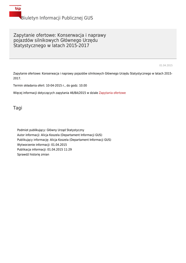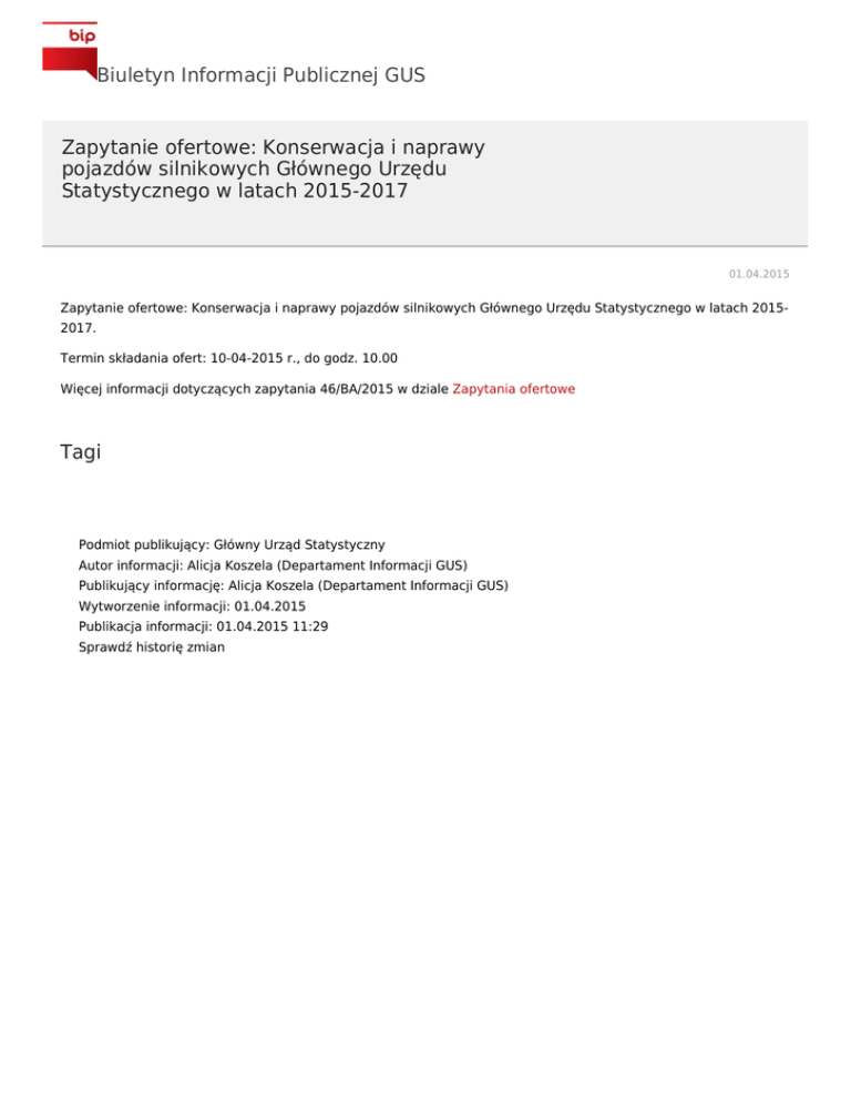 Biuletyn Informacji Publicznej GUS Zapytanie ofertowe: Konserwacja i naprawy pojazdów silnikowych Głównego Urzędu Statystycznego w latach 2015-2017 01.04.2015 Zapytanie ofertowe: Konserwacja i naprawy pojazdów silnikowych Głównego Urzędu Statystycznego w latach 20152017. Termin składania ofert: 10-04-2015 r., do godz. 10.00 Więcej informacji dotyczących zapytania 46/BA/2015 w dziale Zapytania ofertowe Tagi zamówienia publiczne zapytanie ofertowe Podmiot publikujący: Główny Urząd Statystyczny Autor informacji: Alicja Koszela (Departament Informacji GUS) Publikujący informację: Alicja Koszela (Departament Informacji GUS) Wytworzenie informacji: 01.04.2015 Publikacja informacji: 01.04.2015 11:29 Sprawdź historię zmian