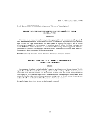 DOI: 10.17814/mechanik.2015.8-9.432 Dr inż. Krzysztof FILIPOWICZ (Zachodniopomorski Uniwersytet Technologiczny): PROJEKTOWANIE NARZĘDZIA GENERUJĄCEGO OKREŚLONY UKŁAD SIŁ SKRAWANIA Streszczenie Omówiono opracowaną i zweryfikowaną metodologię projektowania narzędzia specjalnego do obróbki przedmiotów podatnych. Przedstawiono narzędzie do obróbki kół pojazdów szynowych z wkładkami elastycznymi. Takie koła wykazują znaczną podatność w kierunku równoległym do osi zestawu kołowego, co uwzględniono przy ustalaniu wymagań dotyczących układu sił. Silnie niesymetryczny kształt obrabianego profilu nie pozwala na zastosowanie układu ostrzy równoważących siłę skrawania, dlatego zachodzi potrzeba dokładniejszej analizy obciążenia przedmiotu obrabianego siłami skrawania. Do tego celu wykorzystano model MES obrabianego koła. Słowa kluczowe: siły skrawania, metoda elementów skończonych, narzędzia specjalne PROJECT OF CUTING TOOL THAT GENERATES SPECIFIC CUTING FORCES SYSTEM Abstract Presenting developed and verified method of projecting special cutting tool for machining of flexible objects. Pesented tool was made for machining resilient wheels of railway vehicles. Such wheels show large flexibility in direction paralel to axis of a wheelset, what was taken into account during establishing requirements for cuting forces system. Strongli asymetric shape of machined profile doesn’t allow to use symmetrical cutting edges set that balances generated cutting forces so there is a need of more precise analysis of loads on machined wheel. For this purpose a FEM model was used. Keywords: Cuting forces, finite element method, special cuting tools 240 PROJEKTOWANIE NARZĘDZIA GENERUJĄCEGO OKREŚLONY UKŁAD SIŁ SKRAWANIA Krzysztof FILIPOWICZ1 1.WSTĘP Prezentowana praca jest częścią badań prowadzonych w celu umożliwienia obróbki zestawów kołowych z wkładkami elastycznymi na tokarkach kołowych z napędem ciernym. Zestawy kołowe z wkładkami elastycznymi są wykorzystywane w pojazdach szynowych przeznaczonych do ruchu miejskiego. W celu zmniejszenia drgań oraz hałasu wywołanych toczeniem się kół po torach, zestawy wyposażone są w elementy wibroizolujące w postaci wkładek elastomerowych umieszczonych pomiędzy piastami, a obręczami kół. Rozwiązanie takie jest stosowane z powodzeniem w różnych typach pojazdów szynowych w wielu krajach, jednakże jego mankamentem jest utrudniona obróbka zestawów kołowych wykonywana podczas regeneracji zarówno zestawów demontowanych z wózka pojazdu jak i tych, które nie są rozmontowywane [10]. Urządzeniami technologicznymi przeznaczonymi do obróbki profili jezdnych zestawów kół pojazdów szynowych są tokarki kołowe [6]. Do niedawna obrabiarki te wykorzystywały do napędzania przedmiotów obrabianych zabieraki krzywkowe opierające się o wewnętrzne powierzchnie obręczy kół toczonego zestawu (Rys. 1.1.). Taki sposób przekazywania ruchu przedmiotowi obrabianemu powoduje ryzyko uszkodzenia obręczy kół przez zabieraki oraz nie jest możliwy do zastosowania w przypadku zestawów z wkładkami elastycznymi. Tokarki kołowe z napędem ciernym przekazują ruch obrotowy przedmiotowi obrabianemu za pomocą rolek napędzających, które są dociskane do profili jezdnych kół obrabianego zestawu i siłami tarcia nadają główny ruch skrawania (Rys 1.2.). __________ 1 Zachodniopomorski Uniwersytet Technologiczny w Szczecinie, Wydział Inżynierii Mechanicznej i Mechatroniki, Instytut Technologii Mechanicznej, al. Piastów 19; 70-310 Szczecin 241 Rys 1.1. Obróbka zestawu kołowego: a) tokarka kołowa; b) zasada działania zabieraka krzywkowego Rys. 1.2. Tokarka kołowa z napędem ciernym: a) tokarka kołowa b) zasada działania mechanizmu mocująco-napędzającego Taki sposób napędu nie wymaga dostępu do wewnętrznej strony obręczy obrabianych kół. Postać konstrukcyjna zestawów kołowych z wkładkami elastycznymi sprzyja stosowaniu takiego sposobu zabierania umożliwiając równocześnie wykorzystanie tokarek kołowych z napędem ciernym do obróbki tych zestawów. Jednakże siły z jakimi rolki napędzające są dociskane do obręczy zestawów powodują niepożądane efekty pojawiające się w procesie obróbki [5]. W związku z powyższym zaszła potrzeba zbadania problemów technologicznych występujących podczas obróbki zestawów kołowych z wkładkami elastycznymi na tokarkach kołowych z napędem ciernym. Zaowocowało to opracowaniem technologii frezowania narzędziem o specyficznym układzie ostrzy zaprojektowanym w celu niwelowania efektów niskiej sztywności przedmiotu obrabianego. 2. MODELOWANIE PROCESU OBRÓBKI ZESTAWU KOŁOWEGO Z WKŁADKAMI ELASTYCZNYMI METODĄ ELEMENTÓW SKOŃCZONYCH. W celu identyfikacji problemów powstających podczas obróbki zestawów kołowych z wysokimi parametrami został stworzony model obliczeniowy obrabianego koła w metodzie elementów skończonych. Położenie rolek napędzających oraz noża skrawającego wynika z geometrii układu OUPN obrabiarki TUU 1250. Model koła zawierał wkładki elastyczne między piastą koła a obręczą, które rozlokowano na obwodzie koła zgodnie z jego konstrukcją. Właściwości mechaniczne stali, z których wykonane są obręcze oraz piasty pojazdów szynowych są określone przez polskie normy i parametry te zostały przyjęte jako dane materiałowe w procesie modelowania. Właściwości materiałowe wkładek gu- 242 mowych nie są określone w normach i dlatego parametry charakteryzujące te własności zostały zmierzone w próbach wytrzymałościowych. Kolejnym etapem pracy było określenie wartości sił skrawania podczas obróbki zestawów kół kolejowych z różnymi parametrami. Rys. 2.1. Rysunek oprawki wyposażonej w siłomierz (1-siłomierz; 2-część robocza z gniazdami dla 2 płytek; 3- część chwytowa; 4- łącznik z gniazdem do mocowania części roboczej i siłomierza) Wykorzystując narzę