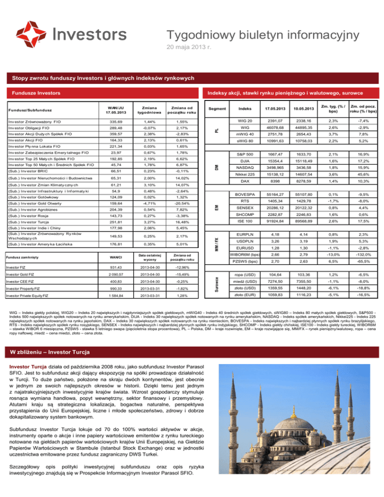 Tygodniowy biuletyn informacyjny 20 maja 2013 r. Stopy zwrotu funduszy Investors i głównych indeksów rynkowych Indeksy akcji, stawki rynku pieniężnego i walutowego, surowce Fundusze Investors Fundusz/Subfundusz WAN/JU 17.05.2013 Zmiana tygodniowa Zmiana od początku roku Segment Indeks 17.05.2013 10.05.2013 Zm. tyg. (% / bps) Zm. od pocz. roku (% / bps) 335,69 1,44% 1,55% WIG 20 2391,07 2338,16 2,3% -7,4% Inv estor Obligacji FIO 289,48 -0,07% 2,17% WIG 46078,68 44895,35 2,6% -2,9% Inv estor Akcji Duży ch Spółek FIO 359,57 2,38% -2,83% mWIG 40 2751,78 2654,43 3,7% 7,8% Inv estor Akcji FIO 164,33 2,13% 0,61% sWIG 80 10991,63 10758,03 2,2% 5,2% Inv estor Pły nna Lokata FIO 221,34 0,03% 1,65% S&P 500 1667,47 1633,70 2,1% 16,9% DJIA 15354,4 15118,49 1,6% 17,2% NASDAQ 3498,965 3436,58 1,8% 15,9% Nikkei 225 15138,12 14607,54 3,6% 45,6% DAX 8398 8278,59 1,4% 10,3% BOVESPA 55164,27 55107,80 0,1% -9,5% RTS 1405,34 1429,78 -1,7% -8,0% SENSEX 20286,12 20122,32 0,8% 4,4% 0,67% 1,78% 2,19% 6,62% Inv estor Top 50 Mały ch i Średnich Spółek FIO 45,74 1,78% 6,87% (Sub.) Inv estor BRIC 66,51 0,23% -0,11% (Sub.) Inv estor Nieruchomości i Budownictwa 65,31 2,00% 14,02% (Sub.) Inv estor Zmian Klimaty czny ch 61,21 3,10% 14,07% 54,9 0,48% -2,64% 124,09 0,02% 1,32% (Sub.) Inv estor Inf rastruktury i Inf ormaty ki (Sub.) Inv estor Gotówkowy (Sub.) Inv estor Gold Otwarty 159,64 -4,71% -20,54% DM 23,97 192,85 Inv estor Top 25 Mały ch Spółek FIO EM Inv estor Zabezpieczenia Emery talnego FIO PL Inv estor Zrównoważony FIO 204,39 0,54% 7,82% (Sub.) Inv estor Rosja 143,73 0,27% -3,38% SHCOMP 2282,87 2246,83 1,6% 0,6% (Sub.) Inv estor Turcja 251,81 3,27% 16,48% ISE 100 91924,84 89568,89 2,6% 17,5% (Sub.) Inv estor Indie i Chiny 177,98 2,06% 5,45% (Sub.) Inv estor Zrównoważony Ry nków Wschodzący ch 149,53 0,25% 2,17% EURPLN 4,18 4,14 0,8% 2,3% (Sub.) Inv estor Amery ka Łacińska 176,81 USDPLN 3,26 3,19 1,9% 5,3% EURUSD 1,28 1,30 -1,1% -2,8% WIBOR6M (bps) 2,66 2,79 -13,0% -132,0% PZSW5 (bps) 2,70 2,63 6,5% -65,5% -6,5% 5,01% Data ostatniej w yceny Zm iana od początku roku 931,43 2013-04-30 -12,96% Investor Gold FIZ 2 090,57 2013-04-30 -15,49% Investor CEE FIZ 400,83 2013-04-30 -0,25% Investor Property FIZ 990,33 2013-03-31 -1,82% 1 584,84 2013-03-31 1,28% Fundusz zam knięty Investor FIZ Investor Private Equity FIZ WAN/CI Surowce 0,35% MM / FX (Sub.) Inv estor Agrobiznes ropa (USD) 104,64 103,36 1,2% miedź (USD) 7274,50 7355,50 -1,1% -8,0% złoto (USD) 1359,55 1448,20 -6,1% -18,8% złoto (EUR) 1059,83 1116,23 -5,1% -16,5% WIG – Indeks giełdy polskiej, WIG20 – Indeks 20 największych i najpłynniejszych spółek giełdowych, mWIG40 - Indeks 40 średnich spółek giełdowych, sWIG80 – Indeks 80 małych spółek giełdowych, S&P500 Indeks 500 największych spółek notowanych na rynku amerykańskim, DIJA - Indeks 30 największych spółek notowanych na rynku amerykańskim, NASDAQ - Indeks spółek amerykańskich, Nikkei225 - Indeks 225 największych spółek notowanych na rynku japońskim, DAX – Indeks 30 największych spółek notowanych na rynku niemieckim, BOVESPA - Indeks największych i najbardziej płynnych spółek rynku brazylijskiego, RTS - Indeks największych spółek rynku rosyjskiego, SENSEX - Indeks największych i najbardziej płynnych spółek rynku indyjskiego, SHCOMP - Indeks giełdy chińskiej, ISE100 - Indeks giełdy tureckiej, WIBOR6M – stawka WIBOR 6 miesięczna, PZSW5 - stawka 5 letniego swapa (pięcioletnia stopa procentowa), PL – Polska, DM – kraje rozwinięte, EM – kraje rozwijające się, MM/FX – rynek pieniężny/walutowy, ropa – cena ropy naftowej, miedź – cena miedzi, złoto – cena złota. W zbliżeniu – Investor Turcja Investor Turcja działa od października 2008 roku, jako subfundusz Investor Parasol SFIO. Jest to subfundusz akcji dający ekspozycję na spółki prowadzące działalność w Turcji. To duże państwo, położone na skraju dwóch kontynentów, jest obecnie w jednym ze swoich najlepszych okresów w historii. Dzięki temu jest jednym z najatrakcyjniejszych inwestycyjnie krajów świata. Wzrost gospodarczy stymuluje rosnąca wymiana handlowa, popyt wewnętrzny, sektor finansowy i przemysłowy. Atutami kraju są strategiczna lokalizacja, bogactwa naturalne, perspektywa przystąpienia do Unii Europejskiej, liczne i młode społeczeństwo, zdrowy i dobrze dokapitalizowany system bankowym. Subfundusz Investor Turcja lokuje od 70 do 100% wartości aktywów w akcje, instrumenty oparte o akcje i inne papiery wartościowe emitentów z rynku tureckiego notowane na giełdach papierów wartościowych krajów Unii Europejskiej, na Giełdzie Papierów Wartościowych w Stambule (Istanbul Stock Exchange) oraz w jednostki uczestnictwa emitowane przez fundusz zagraniczny DWS Turkei. Szczegółowy opis polityki inwestycyjnej subfunduszu oraz opis ryzyka inwestycyjnego znajdują się w Prospekcie Informacyjnym Investor Parasol SFIO. Komentarz rynkowy Amerykańscy inwestorzy mają za sobą kolejny bardzo udany tydzień. Wszystkie główne indeksy zanotowały silne wzrosty i od początku roku zyskują już ponad 16%. Nieznacznie silniejsze były małe spółki, Russell2000 wzrósł o 2.17%, ale w innych segmentach rynku nie było wiele gorzej – S&P500 zyskał 2.07%, a DJIA i Nasdaq odpowiednio 1.56% i 1.82%. Wygląda na to, że historyczna zależność mówiąca o tym, że akcje w maju należy sprzedawać, tym razem nie będzie miała zastosowania. S&P500 zyskuje w tym miesiącu już 4.3% i nic nie zapowiada końca wzrostów. Inwestorzy cały czas wierzą w Fed i jego rolę w pobudzaniu wzrostu gospodarczego, słabsze dane makro traktowane są, jako przejściowe i nie powodują wyprzedaży akcji, dobre dane natomiast utwierdzają inwestorów w przekonaniu, że jesteśmy w fazie hossy. Wprawdzie na początku tygodnia pojawiły się doniesienia, że QE prowadzone przez Fed może mieć się ku końcowi, ale rynek szybko przestał w to wierzyć i ru