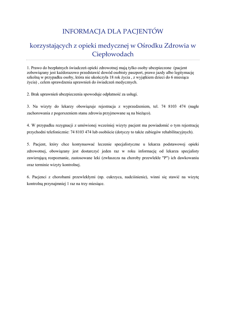 INFORMACJA DLA PACJENTÓW korzystających z opieki medycznej w Ośrodku Zdrowia w Ciepłowodach 1. Prawo do bezpłatnych świadczeń opieki zdrowotnej mają tylko osoby ubezpieczone (pacjent zobowiązany jest każdorazowo przedstawić dowód osobisty paszport, prawo jazdy albo legitymację szkolną w przypadku osoby, która nie ukończyła 18 rok życia , z wyjątkiem dzieci do 6 miesiąca życia) , celem sprawdzenia uprawnień do świadczeń medycznych. 2. Brak uprawnień ubezpieczenia spowoduje odpłatność za usługi. 3. Na wizyty do lekarzy obowiązuje rejestracja z wyprzedzeniem, tel. 74 8103 474 (nagłe zachorowania z pogorszeniem stanu zdrowia przyjmowane są na bieżąco). 4. W przypadku rezygnacji z umówionej wcześniej wizyty pacjent ma powiadomić o tym rejestrację przychodni telefonicznie: 74 8103 474 lub osobiście (dotyczy to także zabiegów rehabilitacyjnych). 5. Pacjent, który chce kontynuować leczenie specjalistyczne u lekarza podstawowej opieki zdrowotnej, obowiązany jest dostarczyć jeden raz w roku informację od lekarza specjalisty zawierającą rozpoznanie, zastosowane leki (zwłaszcza na choroby przewlekłe "P") ich dawkowaniu oraz terminie wizyty kontrolnej. 6. Pacjenci z chorobami przewlekłymi (np. cukrzyca, nadciśnienie), winni się stawić na wizytę kontrolną przynajmniej 1 raz na trzy miesiące. POMOC W STANACH NAGŁYCH Nocna i świąteczna opieka ambulatoryjna w ramach podstawowej opieki zdrowotnej Jeśli po godzinie 18:00 poczujecie się Państwo źle, możecie uzyskać świadczenie medyczne udzielane przez : ZĄBKOWICE Śl. UL.CHROBREGO 5, TEL.74/641 34 90 ZIĘBICE UL.STRAŻACKA 8 , TEL 74/8 100 847 WIZYTY DOMOWE-TEL. KONTAKTOWY 74/8 100 847 W STANACH NAGŁYCH ZAGRAŻAJĄCYCH ZDROWIU I ŻYCIU ( WYPADEK, ZAWAŁ, UDAR ) NADAL DZWONIĆ DO POMOCY MEDYCZNEJ RATUNKOWEJ W ZĄBKOWICACH ŚL. TEL. ALARMOWY 999 LUB 112 Jest to przedłużenie opieki lekarskiej i pielęgniarskiej podstawowej opieki zdrowotnej. Pomoc świadczona jest codziennie, po godzinach pracy przychodni, od godz.18.00 do godz. 8.00 rano następnego dnia. Ze świadczeń opieki nocnej możecie Państwo skorzystać w przypadku nagłych dolegliwości.