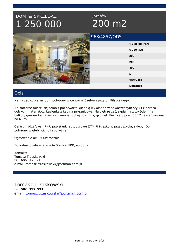 Józefów DOM na SPRZEDAŻ 200 m2 1 250 000 963/4857/ODS 1 250 000 PLN 6 250 PLN 200 200 400 5 VeryGood Detached Opis Na sprzedaż piękny dom położony w centrum Józefowa przy ul. Piłsudskiego. Na parterze mieści się salon z pół otwartą kuchnią wykonaną w nowoczesnym stylu i z bardzo dobrych materiałów. Łazienka z kabiną prysznicową. Na piętrze zaś, sypialnia z wyjściem na balkon, garderoba, łazienka z wanną, pokój gościnny, gabinet. Piwnica o pow. 55m2 zaaranżowana na biuro. Centrum Józefowa : PKP, przystanki autobusowe ZTM,PKP, szkoły, przedszkola, sklepy. Dom położony w głębi, cicho i spokojnie. Ogrzewanie ok 3500zł rocznie Dogodna lokalizacja szkoła Sternik, PKP, autobus. Kontakt: Tomasz Trzaskowski tel.: 606 317 591 e-mail: [email protected] Tomasz Trzaskowski tel. 606 317 591 email: [email protected] Portman Nieruchomości Powered by TCPDF (www.tcpdf.org)
