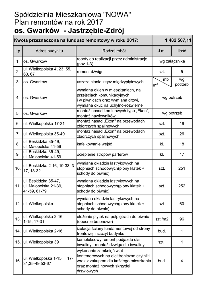Spółdzielnia Mieszkaniowa "NOWA" Plan remontów na rok 2017 os. Gwarków - Jastrzębie-Zdrój Kwota przeznaczona na fundusz remontowy w roku 2017: Lp Adres budynku Rodzaj robót 1. os. Gwarków 2. ul. Wielkopolska 4, 23, 55, 63, 67 3. os. Gwarków 4. os. Gwarków 5. os. Gwarków 6. ul. Wielkopolska 17-31 1 482 507,11 J.m. Ilość roboty do realizacji przez administrację (poz.1-3) wg załącznika remont dźwigu szt. uszczelnianie złącz międzypłytowych wymiana okien w mieszkaniach, na przejściach komunikacyjnych i w piwnicach oraz wymiana drzwi, wymiana okuć na uchylno-rozwierne montaŜ nasad kominowych typu „Ekon”, montaŜ nawiewników montaŜ nasad „Ekon" na przewodach zbiorczych spalinowych montaŜ nasad „Ekon" na przewodach zbiorczych spalinowych mb m 2 5 wg potrzeb wg potrzeb wg potrzeb szt. 19 szt. 26 kafelkowanie wejść kl. 18 ocieplenie stropów parterów kl. 17 wymiana okładzin lastrykowych na ul. Beskidzka 2-16, 19-33, 310. stopniach schodowych(piony klatek + 17, 18-32 schody do piwnic) szt. 251 ul. Beskidzka 35-47, 11. ul. Małopolska 21-39, 41-59, 61-79 wymiana okładzin lastrykowych na stopniach schodowych(piony klatek + schody do piwnic) szt. 252 12. ul. Wielkopolska wymiana okładzin lastrykowych na stopniach schodowych(piony klatek + schody do piwnic) szt. 60 szt./m2 96 bud. 1 szt . 1 bud. 4 7. ul. Wielkopolska 35-49 ul. Beskidzka 35-49, ul. Małopolska 41-59 ul. Beskidzka 35-49, 9. ul. Małopolska 41-59 8. 13. ul. Wielkopolska 2-16, 1-15, 17-31 14. ul. Wielkopolska 2-16 15. ul. Wielkopolska 39 16. ul. Wielkoposka 1-15, 31,35-49,53-67 ułoŜenie płytek na półpiętrach do piwnic (obecnie betonowe) izolacja ściany fundamentowej od strony frontowej i szczyt budynku kompleksowy remont podjazdu dla inwalidy - montaŜ dźwigu dla inwalidy wykonanie zamknięć wiat kontenerowych na elektroniczne czytniki 17wraz z zakupem dla kaŜdego mieszkania oraz montaŜ nowych skrzydeł drzwiowych szt. 1 rg 16 szt. 1 rg 16 wykonanie i montaŜ nowych drzwi do suszarni szt. 6 rg 96 ul. Małopolska 41-59, 20. 81-99, 101-119 wymiana poziomów instalacji kanalizacji deszczowej i sanitarnej w piwnicy na PCV szt. 30 rg 720 wymiana poziomów instalacji kanalizacji deszczowej i sanitarnej w piwnicy na PCV szt. 16 21. ul. Beskidzka 3-17, 19-33 rg 384 montaŜ lamp LED w pomieszczeniach węzłów c.o. oraz przyłaczy wody szt. 72 rg 40 szt. 9 szt . 1 17. ul. Beskidzka 21 18. ul. Małopolska 73 19. ul. Wielkopolska 53-67 22. os. Gwarków wymiana drzwi do rowerowni wymiana drzwi do suszarni remont schodów terenowych wraz z wykonaniem projektu technicznego oraz 23. ul. Wielkopolska 17-31 wykonanie nowych poręczy przy schodach terenowych (w stronę Góralskiej Chaty) ul. Beskidzka 2-16,19-33, 3- budowa parkingu zgodnie z wykonanym 24. 17 projektem Kwota na malowanie klatek schodowych w roku 2017: Lp Adres budynku Rodzaj robót 105 550,92 J.m. Ilość 1. ul. Beskidzka 35-49 malowanie klatek schodowych kl. 8 2. ul. Małopolska 41-59 malowanie klatek schodowych kl. 10 Kwota na remont dźwigów w roku 2017: Lp Adres budynku 1. ul. Wielkopolska 14, 35, 45 369 161,36 Rodzaj robót remont dźwigu J.m. Ilość szt. 3 Kwota przeznaczona na remont elewacji w roku 2017: Lp Adres budynku Rodzaj robót 1 343 851,77 J.m. Ilość 1. ul. Małopolska 21-39 docieplenie ściany frontowej kl. 10 2. ul. Małopolska 61-79 docieplenie ściany frontowej kl. 10 3. ul. Beskidzka 3-17 docieplenie ściany frontowej kl. 8 4. ul. Beskidzka 35-49 docieplenie ściany frontowej kl. 8 5. ul. Wielkopolska 2-16 docieplenie ściany frontowej i wnęk międzyloggiowych kl. 8 Dodatkowe środki z Uchwały nr 7 Walnego Zgromadzenia z dnia 09.06.2016r. oraz pozostałe przychody: Lp Adres budynku Rodzaj robót 435 509,78 J.m. Ilość 1. os. Gwarków roboty do realizacji przez administrację (poz. 4-12) wg załącznika 2. os. Gwarków uzupełnianie asfaltów m2 100 3. ul. Wielkopolska 65-67 likwidacja wysepek na parkingu i wykonanie miejsc parkingowych m2 16 4. ul. Małopolska 55 remont schodów terenowych szt. 1 5. ul. Wielkopolska 67 remont chodnika m2 50,4 6. ul. Małopolska 101-119 doposaŜenie placów zabaw kpl. 1 szt. 2 ul. Wielkopolska 2-16, 35-49 wykonanie nawierzchni bezpiecznej pod (jar) stół do tenisa stołowego wykonanie projektów i oznaczenia dróg i 8. os. Gwarków parkingów oraz wykonanie tych oznaczeń ul. Małopolska 81-99, 101wykonanie ogrodzenia placów 9. 119, 21-39, 41-59, kontenerowych ul. Beskidzka 33 budowa nowego placu kontenerowego 10. ul. Małopolska 41-59 wraz z ogrodzeniem 7. wg potrzeb mb 100 m2 56 18 11. ul. Małopolska 61-79 budowa podłoŜa pod kontenery do selektywnego segregowania odpadów m2 12. ul. Wielkopolska 17-31 kompleksowy remont chodnika m 2 505 Roboty do realizacji przez ADM-1 w 2017r. Lp. Adres 1. ul. Beskidzka 35 2. os. Gwarków Rodzaj robót J.m. Ilość w celu poprawy bezpieczeństwa wykonanie balustrady przy schodach terenowych szt. 4 rg 112 w celu poprawy bezpieczeństwa i komfortu eksploatacji montaŜ nowych wkładek w drzwiach wejściowych wraz z dorobieniem kluczy dla lokatorów szt. 3 rg 30 szt. 24 rg 240 w celu poprawy komfortu cieplnego ul. Beskidzka 3-17, 2-16, 183. wymiana grzejników wraz z podejściem 32 w suszarniach 4. ul. Beskidzka 19-33 5. os. Gwarków 6. ul. Małopolska 41-59 7. ul. Małopolska 41-59 8. ul. Małopolska 81-99 9. ul. Beskidzka 19-33 10. ul. Wielkopolska 17-31 11. os. Gwarków 12. os. Gwarków w celu poprawy bezpieczeństwa i mb 2 estetyki remont istniejącego chodnika m (skuwanie asfaltu, zagęszczenie podłoŜa, ułoŜenie nowej kostki brukowej rg i obrzeŜy) 90 130 w celu poprawy estetyki osiedla remont i malowanie stołów do gry w ping-ponga szt. 3 rg 16 w celu poprawy komfortu zamieszkania zagospodarowanie terenu na szczycie budynku m2 54 rg 120 w celu poprawy estetyki budynku zaaranŜowanie ogródków przy wejściach do klatek schodowych m2 60 rg 70 w celu poprawy estetyki budynku zaaranŜowanie ogródków przy wejściach do klatek schodow