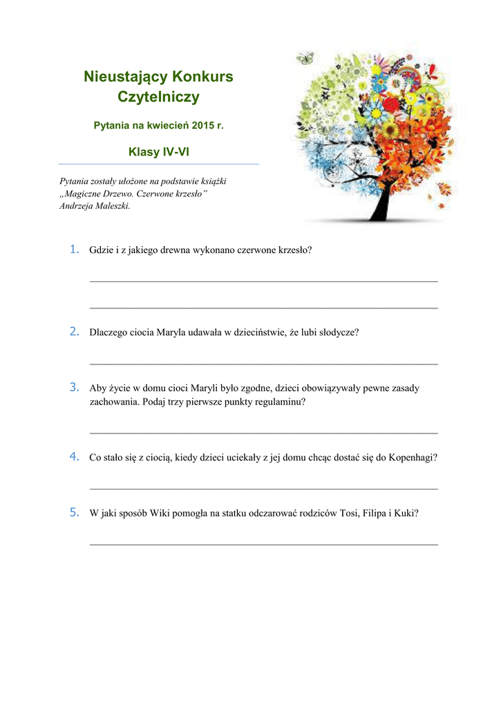Nieustający Konkurs Czytelniczy Pytania na kwiecień 2015 r. Klasy IV-VI Pytania zostały ułożone na podstawie książki „Magiczne Drzewo. Czerwone krzesło” Andrzeja Maleszki. 1. Gdzie i z jakiego drewna wykonano czerwone krzesło? _____________________________________________________________________ _____________________________________________________________________ 2. Dlaczego ciocia Maryla udawała w dzieciństwie, że lubi słodycze? _____________________________________________________________________ 3. Aby życie w domu cioci Maryli było zgodne, dzieci obowiązywały pewne zasady zachowania. Podaj trzy pierwsze punkty regulaminu? _____________________________________________________________________ 4. Co stało się z ciocią, kiedy dzieci uciekały z jej domu chcąc dostać się do Kopenhagi? _____________________________________________________________________ 5. W jaki sposób Wiki pomogła na statku odczarować rodziców Tosi, Filipa i Kuki? _____________________________________________________________________