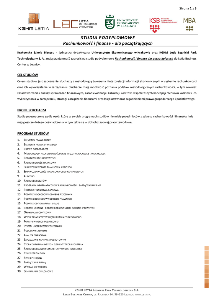 Strona 1 z 3 STUDIA PODYPLOMOWE Rachunkowość i finanse - dla początkujących Krakowska Szkoła Biznesu - jednostka dydaktyczna Uniwersytetu Ekonomicznego w Krakowie oraz KGHM Letia Legnicki Park Technologiczny S. A., mają przyjemność zaprosić na studia podyplomowe Rachunkowość i finanse dla początkujących do Letia Business Center w Legnicy. CEL STUDIÓW Celem studiów jest zapoznanie słuchaczy z metodologią tworzenia i interpretacji informacji ekonomicznych w systemie rachunkowości oraz ich wykorzystanie w zarządzaniu. Słuchacze mają możliwość poznania podstaw metodologicznych rachunkowości, w tym również zasad tworzenia i analizy sprawozdań finansowych, zasad ewidencji i kalkulacji kosztów, współczesnych koncepcji rachunku kosztów i ich wykorzystania w zarządzaniu, strategii zarządzania finansami przedsiębiorstw oraz zagadnieniami prawa gospodarczego i podatkowego. PROFIL SŁUCHACZA Studia przeznaczone są dla osób, które w swoich programach studiów nie miały przedmiotów z zakresu rachunkowości i finansów i nie mają jeszcze dużego doświadczenia w tym zakresie w dotychczasowej pracy zawodowej. PROGRAM STUDIÓW 1. 2. 3. 4. 5. 6. 7. 8. 9. 10. 11. 12. 13. 14. 15. 16. 17. 18. 19. 20. 21. 22. 23. 24. 25. 26. 27. 28. 29. 30. ELEMENTY PRAWA PRACY ELEMENTY PRAWA CYWILNEGO PRAWO GOSPODARCZE METODOLOGIA RACHUNKOWOŚCI ORAZ MIĘDZYNARODOWA STANDARYZACJA PODSTAWY RACHUNKOWOŚCI RACHUNKOWOŚĆ FINANSOWA SPRAWOZDAWCZOŚĆ FINANSOWA JEDNOSTKI SPRAWOZDAWCZOŚĆ FINANSOWA GRUP KAPITAŁOWYCH AUDITING RACHUNEK KOSZTÓW PROGRAMY INFORMATYCZNE W RACHUNKOWOŚCI I ZARZĄDZANIU FIRMĄ POLITYKA FINANSOWA PAŃSTWA PODATEK DOCHODOWY OD OSÓB FIZYCZNYCH PODATEK DOCHODOWY OD OSÓB PRAWNYCH PODATEK OD TOWARÓW I USŁUG PODATKI LOKALNE I PODATEK OD CZYNNOŚCI CYWILNO-PRAWNYCH ORDYNACJA PODATKOWA WYNIK FINANSOWY W UJĘCIU PRAWA PODATKOWEGO FORMY EWIDENCJI PODATKOWEJ SYSTEM UBEZPIECZEŃ SPOŁECZNYCH PODSTAWY EKONOMII ANALIZA FINANSOWA ZARZĄDZANIE KAPITAŁEM OBROTOWYM STOPA ZWROTU A RYZYKO - ELEMENTY TEORII PORTFELA RACHUNEK EKONOMICZNEJ EFEKTYWNOŚCI INWESTYCJI RYNEK KAPITAŁOWY RYNEK PIENIĘŻNY ZARZĄDZANIE FIRMĄ WYKŁAD DO WYBORU SEMINARIUM DYPLOMOWE KGHM LETIA LEGNICKI PARK TECHNOLOGICZNY S.A. LETIA BUSINESS CENTER, UL. RYCERSKA 24, 59-220 LEGNICA, WWW.LETIA.PL Strona 2 z 3 METODYKA STUDIÓW Zajęcia będą realizowane w formie warsztatów kompetencji, studiów przypadków, dyskusji, burzy mózgów, ćwiczeń i treningów umiejętności. Aktywizujące uczestników formy zajęć poprzedzone zostaną wykładami problemowymi wprowadzającymi w konkretny temat. Aktywne metody prowadzenia zajęć służą wykreowaniu zaangażowania uczestników i praktycznemu przećwiczeniu nabywanych umiejętności na konkretnych przypadkach. Taki sposób prowadzenia zajęć pozwoli na zrealizowanie nadrzędnego celu studiów podyplomowych, którym jest zdobycie kompleksowej wiedzy i umiejętności. WARUNKI ZALICZENIA STUDIÓW Warunkiem zaliczenia studiów jest uczestnictwo w zajęciach, zdanie egzaminów semestralnych oraz egzaminu końcowego - obrony pracy końcowej. ATUTY STUDIÓW dyplom prestiżowej uczelni publicznej, doskonała jakość zajęć, doświadczeni Wykładowcy, aktywne metody zajęć oparte na case studies, angażujące uczestników warsztaty i treningi umiejętności, promocyjna cena i dogodny dla słuchacza system płatności, dogodne godziny zajęć, profesjonalna opieka administracyjno-organizacyjna, nowoczesny budynek dydaktyczny oraz w pełni zdigitalizowane sale szkoleniowe. ORGANIZACJA STUDIÓW Studia trwają 3 semestry i prowadzone są w systemie studiów niestacjonarnych, w godzinach: soboty 9.00-17:45, niedziele 9.00-16:00 Lokalizacja sal szkoleniowych: Letia Business Center ul. Rycerka 24 59-220 Legnica wyszukiwanie GPS: ul. Rycerska 26 59-220 Legnica N: 52° 10' 26" E: 18° 51' 9" KOSZTY UCZESTNICTWA Całkowity koszt studiów podyplomowych wynosi 6 800 złotych brutto + 200 złotych brutto opłaty rekrutacyjnej. Istnieją następujące możliwości opłacenia studiów: w całości, w ratach: opłata za semestr I w 2 ratach po 1 360 zł, opłata za semestr II w 2 ratach po 1 020 zł, opłata za semestr III w 2 ratach po 1 020 zł. REKRUTACJA Kandydatów ubiegających się o przyjęcie na studia podyplomowe zachęcamy do wypełnienia formularza kontaktowego (zamieszczonego na ostatniej stronie niniejszej oferty), który stanowi zapytanie o dostępność miejsc na wybranym kierunku studiów podyplomowych. Prosimy o jego wypełnienie oraz odesłanie na adres e-mail: [email protected]. W kolejnych krokach zostaną Państwo powiadomieni o przebiegu procesu rekrutacji. KGHM LETIA LEGNICKI PARK TECHNOLOGICZNY S.A. LETIA BUSINESS CENTER, UL. RYCERSKA 24, 59-220 LEGNICA, WWW.LETIA.PL Strona 3 z 3 FORMULARZ KONTAKTOWY STUDIA PODYPLMOWE UNIWERSYTETU EKONOMICZNEGO W KRAKOWIE WYBRANY KIERUNEK STUDIÓW DANE PERSONALNE I KONTAKTOWE Nazwisko: Imię: tel. stac. (wraz z nr kier.): tel. kom.: e-mail: Wyrażam zgodę na przetwarzanie oraz archiwizowanie przez KGHM LETIA Legnicki Park Technologiczny S.A. podanych danych osobowych zgodnie z Ustawą o Ochronie Danych Osobowych z dnia 29.08.1997 roku (tj. Dz.U. z 2002 roku nr.101,poz.926 z póź. Zm.) (data i czytelny podpis) UWAGA! Niniejszy formularz kontaktowy stanowi zapytanie o dostępność miejsc na wybranym kierunku studiów podyplomowych. Kandydatów ubiegających się o przyjęcie na studia podyplomowe prosimy o jego wypełnienie oraz odesłanie na adres e-mail: [email protected]. W kolejnych krokach powiadomimy Państwa o przebiegu procesu rekrutacji. KONTAKT KGHM Letia Legnicki Park Technologiczny S. A. Letia Business Center ul. Rycerska 24 59-220 Legnica Małgorzata Kubik Magdalena Monteiro mail: [email protected] mail: [email protected] t el. 76 723 54 55 tel. 76 723 54 43 kom. 667 873 452 kom. 697 890 426 Organizatorzy zastrzegają sobie prawo do nieuruchomienia studiów w przypadku niewystarczającej ilości zgłoszeń. KGH