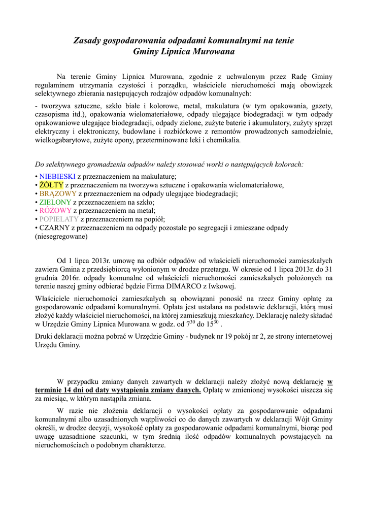 Zasady gospodarowania odpadami komunalnymi na tenie Gminy Lipnica Murowana Na terenie Gminy Lipnica Murowana, zgodnie z uchwalonym przez Radę Gminy regulaminem utrzymania czystości i porządku, właściciele nieruchomości mają obowiązek selektywnego zbierania następujących rodzajów odpadów komunalnych: - tworzywa sztuczne, szkło białe i kolorowe, metal, makulatura (w tym opakowania, gazety, czasopisma itd.), opakowania wielomateriałowe, odpady ulegające biodegradacji w tym odpady opakowaniowe ulegające biodegradacji, odpady zielone, zużyte baterie i akumulatory, zużyty sprzęt elektryczny i elektroniczny, budowlane i rozbiórkowe z remontów prowadzonych samodzielnie, wielkogabarytowe, zużyte opony, przeterminowane leki i chemikalia. Do selektywnego gromadzenia odpadów należy stosować worki o następujących kolorach: • NIEBIESKI z przeznaczeniem na makulaturę; • ŻÓŁTY z przeznaczeniem na tworzywa sztuczne i opakowania wielomateriałowe, • BRĄZOWY z przeznaczeniem na odpady ulegające biodegradacji; • ZIELONY z przeznaczeniem na szkło; • RÓŻOWY z przeznaczeniem na metal; • POPIELATY z przeznaczeniem na popiół; • CZARNY z przeznaczeniem na odpady pozostałe po segregacji i zmieszane odpady (niesegregowane) Od 1 lipca 2013r. umowę na odbiór odpadów od właścicieli nieruchomości zamieszkałych zawiera Gmina z przedsiębiorcą wyłonionym w drodze przetargu. W okresie od 1 lipca 2013r. do 31 grudnia 2016r. odpady komunalne od właścicieli nieruchomości zamieszkałych położonych na terenie naszej gminy odbierać będzie Firma DIMARCO z Iwkowej. Właściciele nieruchomości zamieszkałych są obowiązani ponosić na rzecz Gminy opłatę za gospodarowanie odpadami komunalnymi. Opłata jest ustalana na podstawie deklaracji, którą musi złożyć każdy właściciel nieruchomości, na której zamieszkują mieszkańcy. Deklarację należy składać w Urzędzie Gminy Lipnica Murowana w godz. od 730 do 1530 . Druki deklaracji można pobrać w Urzędzie Gminy - budynek nr 19 pokój nr 2, ze strony internetowej Urzędu Gminy. W przypadku zmiany danych zawartych w deklaracji należy złożyć nową deklarację w terminie 14 dni od daty wystąpienia zmiany danych. Opłatę w zmienionej wysokości uiszcza się za miesiąc, w którym nastąpiła zmiana. W razie nie złożenia deklaracji o wysokości opłaty za gospodarowanie odpadami komunalnymi albo uzasadnionych wątpliwości co do danych zawartych w deklaracji Wójt Gminy określi, w drodze decyzji, wysokość opłaty za gospodarowanie odpadami komunalnymi, biorąc pod uwagę uzasadnione szacunki, w tym średnią ilość odpadów komunalnych powstających na nieruchomościach o podobnym charakterze. Stawki opłat obowiązujące od 1 stycznia 2014 roku: Odpady zbierane w sposób selektywny: Odpady zbierane w sposób nieselektywny: 7zł od osoby (od pierwszej do czwartej osoby w gospodarstwie domowym) oraz 14zł od jednej osoby 3zł od osoby (od piątej i kolejnych osób prowadzących wspólne gospodarstwo domowe) TERMINY PŁATNOŚCI: • za I kwartał (styczeń, luty, marzec) – do 15 marca, • za II kwartał (kwiecień, maj, czerwiec) – do 15 maja • za III kwartał (lipiec, sierpień, wrzesień) – do 15 września • za IV kwartał (październik, listopad, grudzień) – do 15 listopada Opłatę można uiszczać w kasie Urzędu Gminy, u sołtysa, w banku lub przelewem internetowym (w tytule należy podać imię i nazwisko oraz adres osoby składającej deklarację z dopiskiem „opłata za odpady komunalne”) Nr konta bankowego Urzędu Gminy: 85 8589 0006 0230 0000 0837 0003 W zamian za uiszczoną przez właściciela nieruchomości zamieszkałej opłatę zostanie odebrana każda ilość zebranych przez niego odpadów komunalnych (zmieszanych lub zebranych selektywnie, w zależności od złożonej deklaracji). Odpady takie jak: szkło, tworzywa sztuczne, odpady wielomateriałowe, makulatura, metal, odpady biodegradowalne oraz popiół - odbierane będą co miesiąc. Odpady zielone odbierane będą co miesiąc w okresie od 1 maja do 30 września, Odpady wielkogabarytowe, odpady budowlane z remontów prowadzonych we własnym zakresie, zużyty sprzęt elektryczny i elektroniczny, zużyte baterie i akumulatory inne niż przemysłowe i samochodowe, zużyte opony, przeterminowane leki i chemikalia będą odbierane od właścicieli nieruchomości zamieszkałych raz w roku, w terminie wyznaczonym przez przedsiębiorcę odbierającego odpady komunalne. Natomiast inne odpady budowlane remontowe i rozbiórkowe należy gromadzić w podstawionym przez przedsiębiorcę pojemniku i przekazywać przedsiębiorcy za dodatkową opłatą. Ponadto, w ramach uiszczonej opłaty za gospodarowanie odpadami komunalnymi, właściciele nieruchomości zamieszkałych, którzy w wyznaczonym terminie nie mogli przekazać zebranych odpadów przedsiębiorcy, będą mogli te odpady dostarczyć do Punktu Selektywnej Zbiórki Odpadów Komunalnych, który został uruchomiony przy Oczyszczalni ścieków w Lipnicy Dolnej. W przypadku nieruchomości niezamieszkałych, na których powstają odpady komunalne (m.in. szkoły, przedszkola, urzędy administracji, ośrodki zdrowia, biblioteki, domy kultury, domy ludowe, gabinety weterynaryjne, boiska sportowe, pensjonaty, restauracje, puby, hotele, kościoły, cmentarze, wszelkiego rodzaju zakłady produkcyjne, usługowe, składowe, magazynowe i logistyczne itp. a także nieruchomości obejmujące budynki zamieszkiwane czasowo przez osoby, które złożyły deklarację o wysokości opłaty za gospodarowanie odpadami w miejscu stałego pobytu innym niż teren Gminy Lipnica) właściciele tych nieruchomości winni zawrzeć umowę na odbiór odpadów komunalnych z przedsiębiorcą wpisanym do rejestru działalności regulowanej prowadzonego przez Wójta Gminy Lipnica Murowana. Właściciele nieruchomości niezamieszkałych, na których powstają odpady komunalne są obowiązani do udokumento