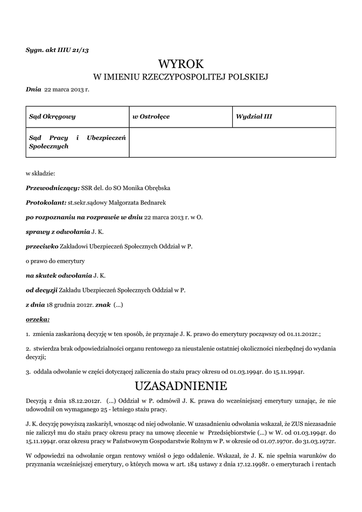 Sygn. akt IIIU 21/13 WYROK W IMIENIU RZECZYPOSPOLITEJ POLSKIEJ Dnia 22 marca 2013 r. Sąd Okręgowy Sąd Pracy Społecznych w Ostrołęce i Wydział III Ubezpieczeń w składzie: Przewodniczący: SSR del. do SO Monika Obrębska Protokolant: st.sekr.sądowy Małgorzata Bednarek po rozpoznaniu na rozprawie w dniu 22 marca 2013 r. w O. sprawy z odwołania J. K. przeciwko Zakładowi Ubezpieczeń Społecznych Oddział w P. o prawo do emerytury na skutek odwołania J. K. od decyzji Zakładu Ubezpieczeń Społecznych Oddział w P. z dnia 18 grudnia 2012r. znak (...) orzeka: 1. zmienia zaskarżoną decyzję w ten sposób, że przyznaje J. K. prawo do emerytury począwszy od 01.11.2012r.; 2. stwierdza brak odpowiedzialności organu rentowego za nieustalenie ostatniej okoliczności niezbędnej do wydania decyzji; 3. oddala odwołanie w części dotyczącej zaliczenia do stażu pracy okresu od 01.03.1994r. do 15.11.1994r. UZASADNIENIE Decyzją z dnia 18.12.2012r. (...) Oddział w P. odmówił J. K. prawa do wcześniejszej emerytury uznając, że nie udowodnił on wymaganego 25 - letniego stażu pracy. J. K. decyzję powyższą zaskarżył, wnosząc od niej odwołanie. W uzasadnieniu odwołania wskazał, że ZUS niezasadnie nie zaliczył mu do stażu pracy okresu pracy na umowę zlecenie w Przedsiębiorstwie (...) w W. od 01.03.1994r. do 15.11.1994r. oraz okresu pracy w Państwowym Gospodarstwie Rolnym w P. w okresie od 01.07.1970r. do 31.03.1972r. W odpowiedzi na odwołanie organ rentowy wniósł o jego oddalenie. Wskazał, że J. K. nie spełnia warunków do przyznania wcześniejszej emerytury, o których mowa w art. 184 ustawy z dnia 17.12.1998r. o emeryturach i rentach z Funduszu Ubezpieczeń Społecznych, gdyż pomimo, iż ukończył 60 lat, nie jest członkiem OFE, legitymuje się ponad 15-letnim stażem pracy w szczególnych warunkach, nie pozostaje w stosunku pracy, nie posiada jednak wymaganego 25-letniego stażu pracy. ZUS nie zaliczył odwołującemu do stażu pracy okresu pracy od 01.07.1970r do 31.03.1972r. w Państwowym Gospodarstwie Rolnym w P., ponieważ odwołujący nie przedłożył żadnych dokumentów pośrednich potwierdzających zatrudnienie. Ponadto, jak sam wskazuje, był zatrudniony w PGR w P. jako pracownik sezonowy. Okres ten nie był też przez odwołującego wskazywany do obliczenia wartości kapitału początkowego. Do stażu pracy ZUS nie uwzględnił też okresu pracy w Przedsiębiorstwie (...) w W. od 01.03.1994r. do 15.11.1994r., ponieważ okres zatrudnienia na podstawie umowy zlecenia, w przypadku, gdy zakład pracy rozliczał się na podstawie deklaracji bezimiennych, powinien być potwierdzony zaświadczeniem pracodawcy z podaniem informacji, czy były odprowadzane składki na ubezpieczenie emerytalno – rentowe, a w zaświadczeniu z dnia 21.06.2012r. brak jest takiej informacji. Organ rentowy wskazał ponadto, że płatnik konto umów zlecenia posiadał czynne od 03. 1995r., zatem należy przypuszczać, że dopiero od tej daty zatrudniał pracowników na podstawie umowy zlecenia. Sąd Okręgowy Sąd Pracy i Ubezpieczeń Społecznych ustalił i zważył, co następuje: Odwołanie J. K. okazało się być w przeważającej mierze zasadne i zasługujące na uwzględnienie. W pierwszej kolejności wskazać należy, że podstawą do ubiegania się przez odwołującego o prawo do wcześniejszej emerytury jest art. 184 ustawy o emeryturach i rentach z Funduszu Ubezpieczeń Społecznych (tekst jedn. Dz. U. z 2009r., Nr 153, poz.1227 ze zm.) w zw. z §4 rozporządzenia Rady Ministrów z dnia 07.02.1983r. w sprawie wieku emerytalnego pracowników zatrudnionych w szczególnych warunkach lub w szczególnym charakterze (Dz. U. Nr 8, poz. 43 ze zm.), gdyż urodził się on 14.05.1952r. Zgodnie z tymi przepisami, w brzmieniu obowiązującym w dacie wydania zaskarżonej decyzji, prawo do emerytury przysługuje ubezpieczonemu urodzonemu po 01.01.1949r., jeżeli: - osiągnął wiek emerytalny wynoszący 60 lat dla mężczyzn, - nie przystąpił do otwartego funduszu emerytalnego lub złożył wniosek o przekazanie środków zgromadzonych na rachunku w OFE, za pośrednictwem Zakładu na dochody budżetu państwa, - rozwiązał stosunek pracy, w przypadku ubezpieczonego będącego pracownikiem, - w dniu 01.01.1999r. udowodnił 25-letni okres składkowy i nieskładkowy, w tym co najmniej 15 lat pracy w szczególnych warunkach. Na podstawie przedłożonych przez odwołującego dokumentów ZUS uznał, że J. K. udowodnił na dzień 01.01.1999r. - 24 lata, 11 miesięcy i 9 dni okresów składkowych i nieskładkowych, w tym 17 lat i 4 miesiące stażu pracy w szczególnych warunkach. Wobec nie uwzględnienia do ogólnego stażu pracy okresu zatrudnienia odwołującego w PGR w (...) Sp. z o.o. w W. (spełnienie przez odwołującego pozostałych przesłanek warunkujących nabycie uprawnień do wcześniejszej emerytury było poza sporem), zasadniczą kwestią wymagająca rozstrzygnięcia w przedmiotowej sprawie było ustalenie, czy istnieją podstawy do zaliczenia do ogólnego stażu pracy okresów wskazywanych w odwołaniu przez J. K.. Na okoliczność pracy odwołującego w PGR w P. Sąd przesłuchał w charakterze świadków E. S. i J. Z. oraz odwołującego J. K. w charakterze strony. E. S. podał, że pracę w PGR w P. rozpoczął w 1968r. Odwołującego „zna od chłopaka” i pamięta, że pracował on w PGR w P. zanim poszedł do wojska, zaraz po tym jak skończył szkołę. Nie był w stanie wskazać dokładnej daty podjęcia pracy przez odwołującego ale podał, że było to gdzieś w 1970r - 1971r. Zeznał, że J. K. pracował przy pracach rolniczych, woził słomę, siano, pracował przy zwierzętach. Wykonywał prace przy workowaniu, w zimie pracował w magazynach. Świadek podał, że w czasie kiedy J. K. był w wojsku, PGR w P. został przejęty przez PGR w O.. Świadek podał, że jest pewien w 100 %, że odwołujący pracował jeszcze w PGR w P., przez jego przejęciem 