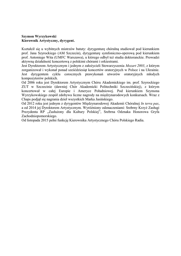 Szymon Wyrzykowski Kierownik Artystyczny, dyrygent. Kształcił się u wybitnych mistrzów batuty: dyrygenturę chóralną studiował pod kierunkiem prof. Jana Szyrockiego (AM Szczecin), dyrygenturę symfoniczno-operową pod kierunkiem prof. Antoniego Wita (UMFC Warszawa), u którego odbył też studia doktoranckie. Prowadzi aktywną działalność koncertową z polskimi chórami i orkiestrami. Jest Dyrektorem Artystycznym i jednym z założycieli Stowarzyszenia Mozart 2003, z którym zorganizował i wykonał ponad sześćdziesiąt koncertów oratoryjnych w Polsce i na Ukrainie. Jest dyrygentem cyklu corocznych prawykonań utworów oratoryjnych młodych kompozytorów polskich. Od 2006 roku jest Dyrektorem Artystycznym Chóru Akademickiego im. prof. Szyrockiego ZUT w Szczecinie (dawniej Chór Akademicki Politechniki Szczecińskiej), z którym koncertował w całej Europie i Ameryce Południowej. Pod kierunkiem Szymona Wyrzykowskiego zespół zdobywa liczne nagrody na międzynarodowych konkursach. Wraz z Chaps podjął się nagrania dzieł wszystkich Marka Jasińskiego. Od 2012 roku jest jednym z dyrygentów Międzynarodowej Akademii Chóralnej In terra pax, a od 2014 jej Dyrektorem Artystycznym. Wyróżniony odznaczeniami: Srebrny Krzyż Zasługi Prezydenta RP „Zasłużony dla Kultury Polskiej”, Srebrna Odznaka Honorowa Gryfa Zachodniopomorskiego. Od listopada 2015 pełni funkcję Kierownika Artystycznego Chóru Polskiego Radia.